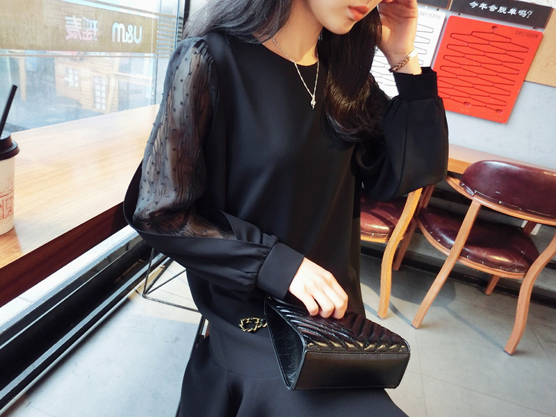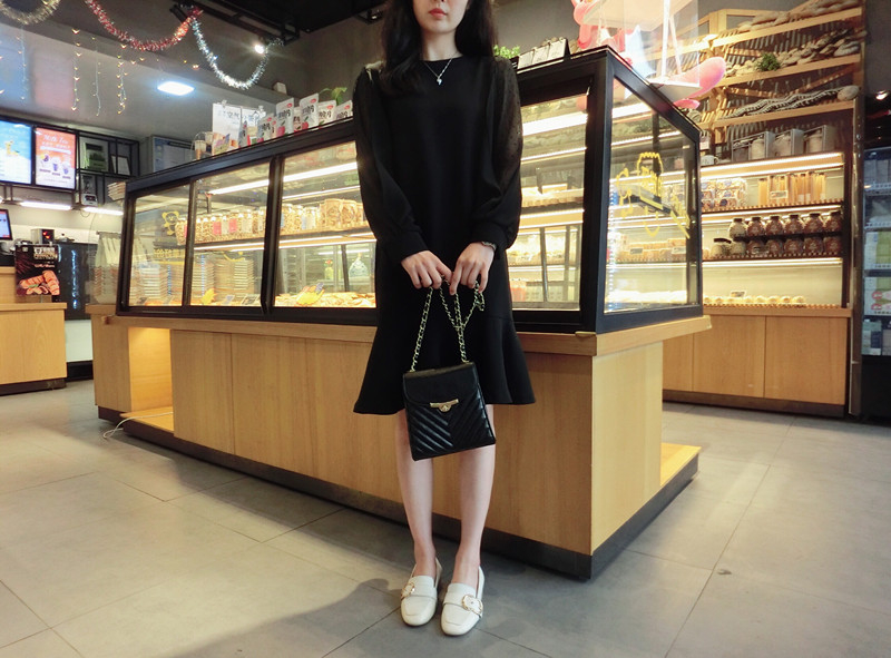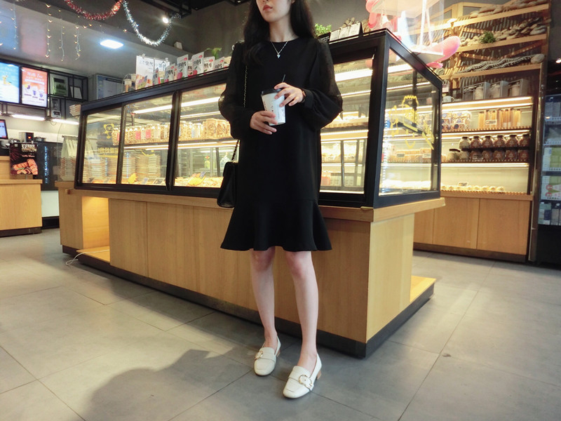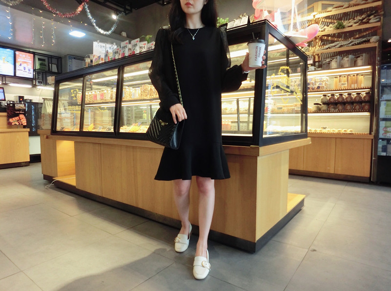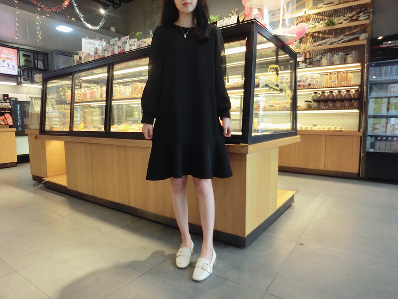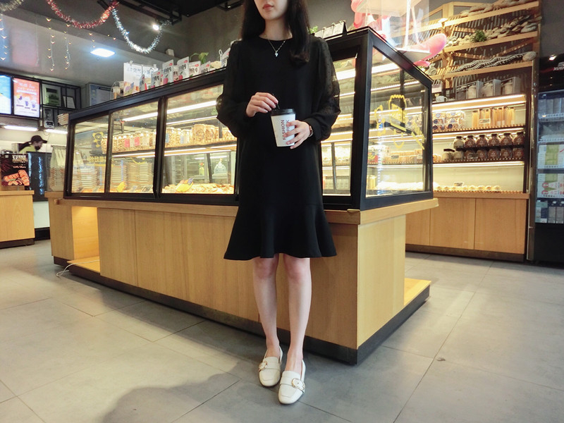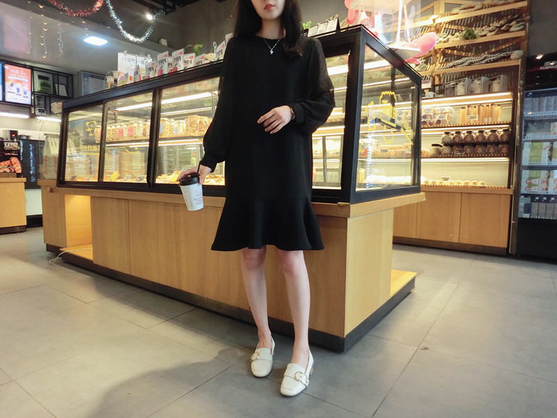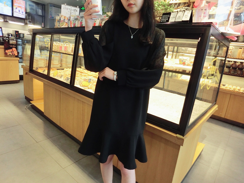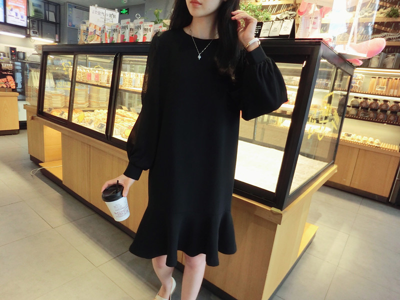 中長款氣質韓版2019秋季新款圓領學院風寬松荷葉擺拼接連衣裙女1入