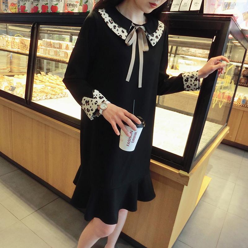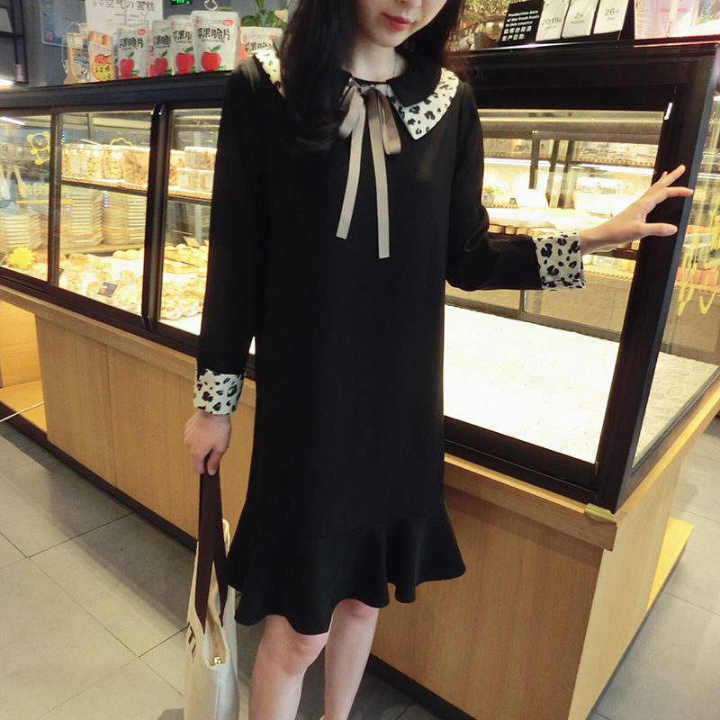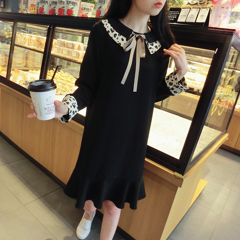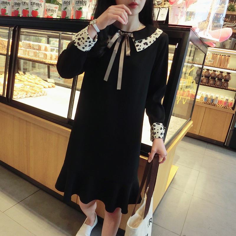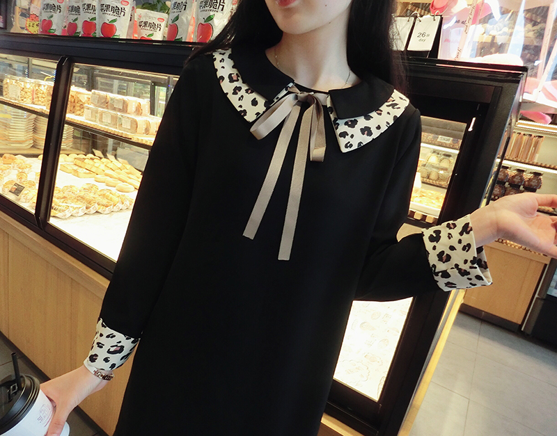 韓版春季新款2019連衣裙女寬松學院風豹紋拼接假領子系帶中長款1入