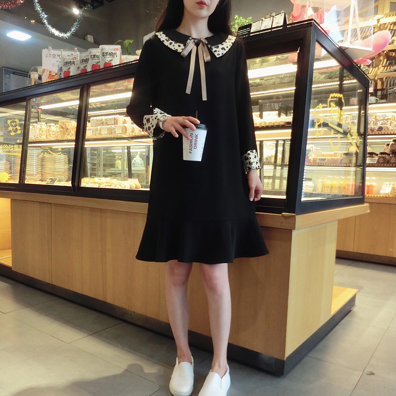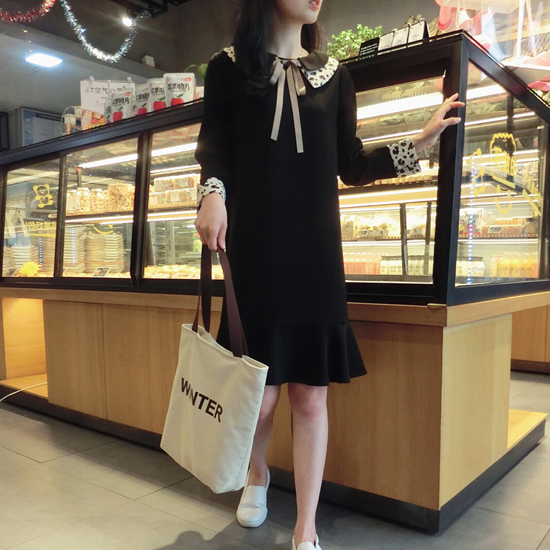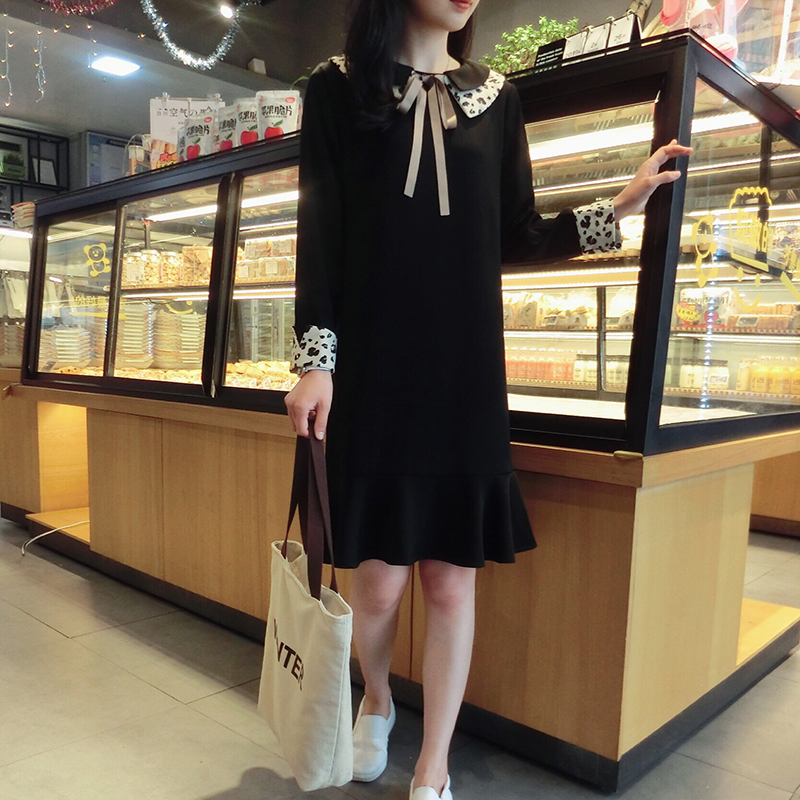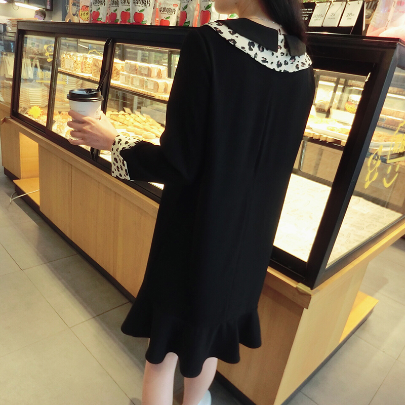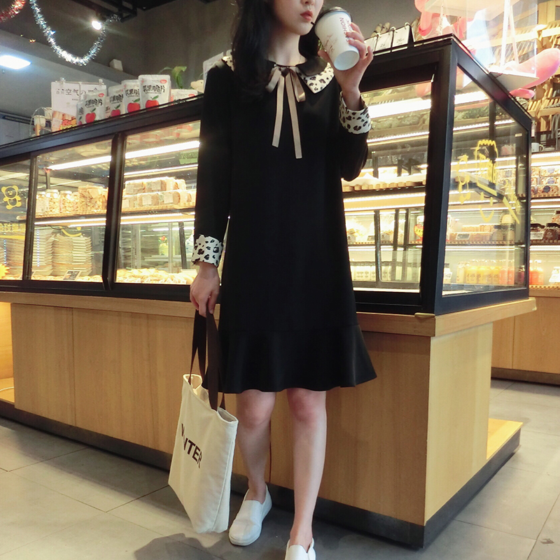 韓版春季新款2019連衣裙女寬松學院風豹紋拼接假領子系帶中長款1入