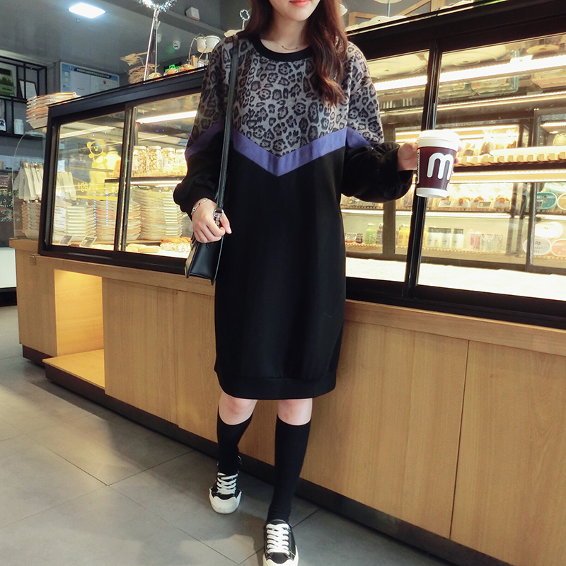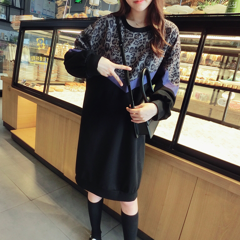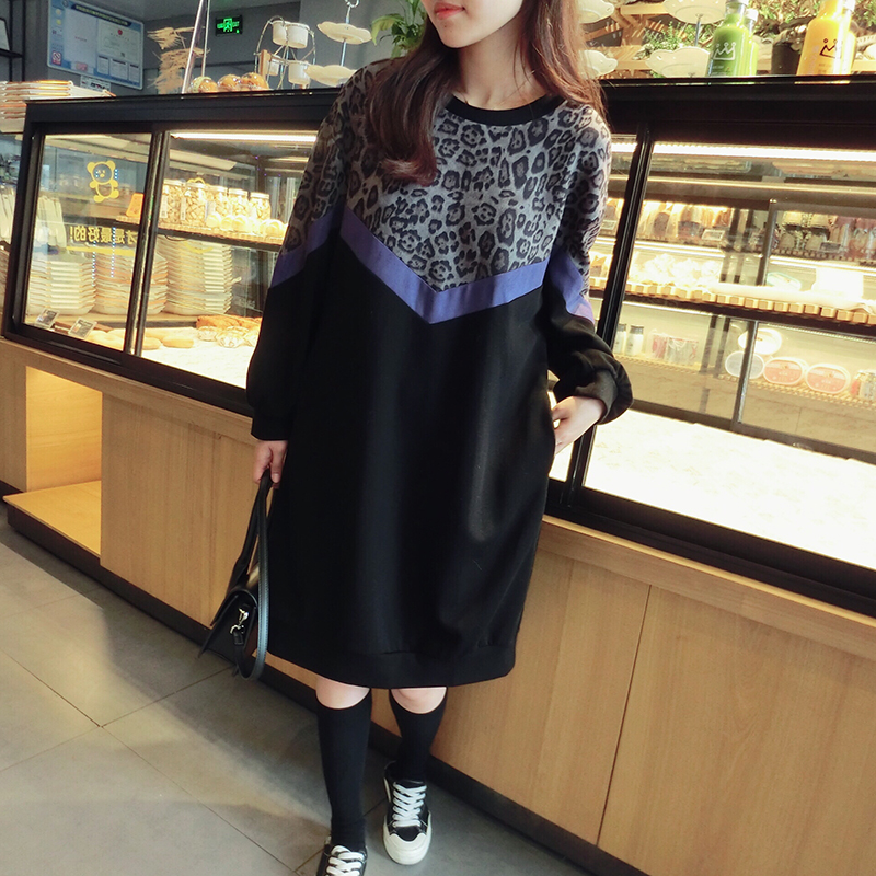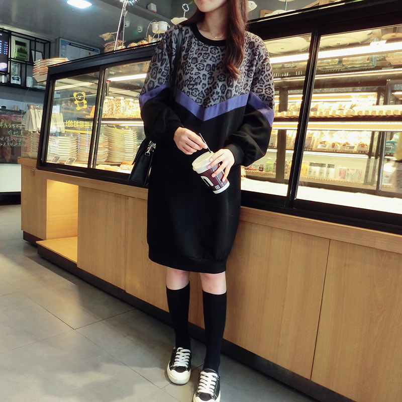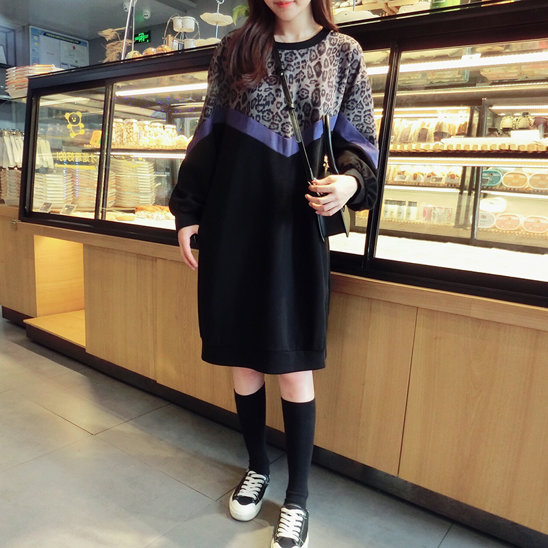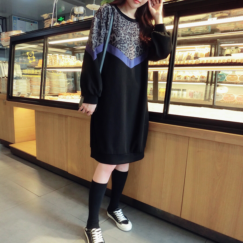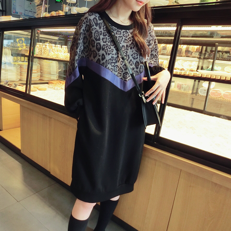 韓版2019秋季新款豹紋拼接中長款寬松連衣裙女氣質百搭打底衛衣裙1入