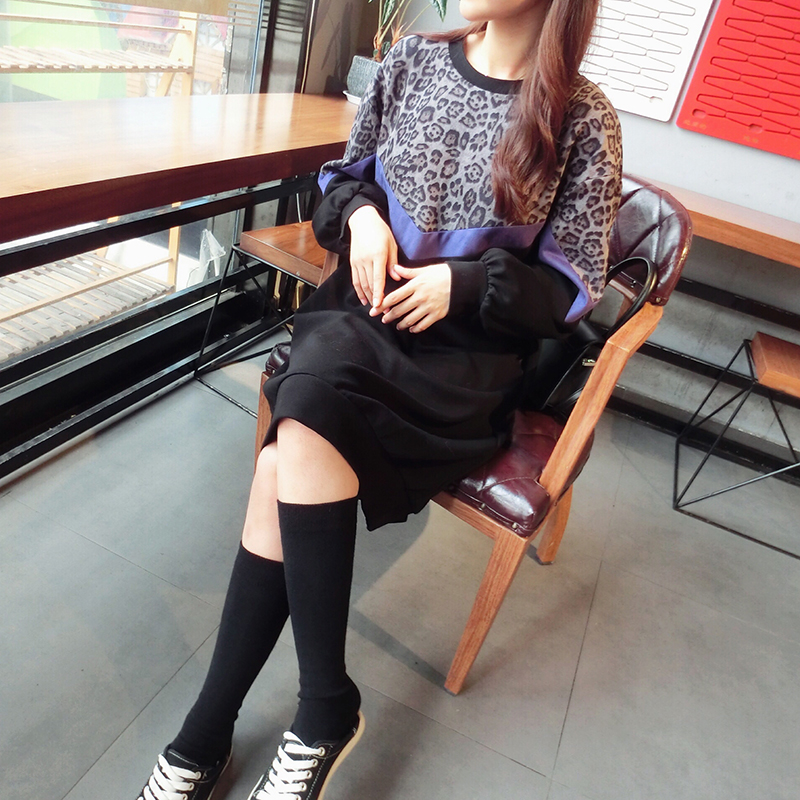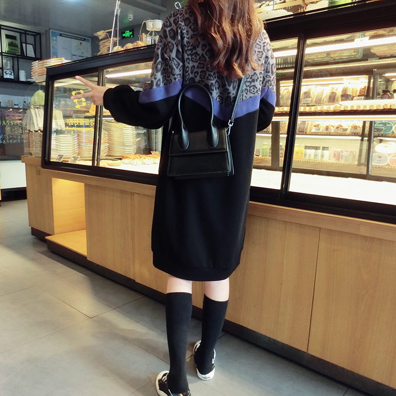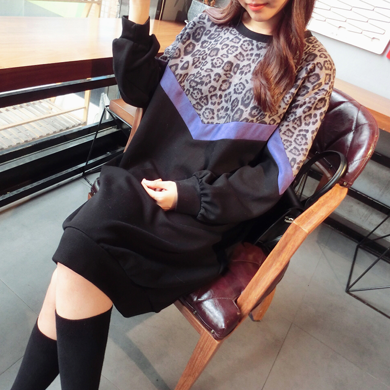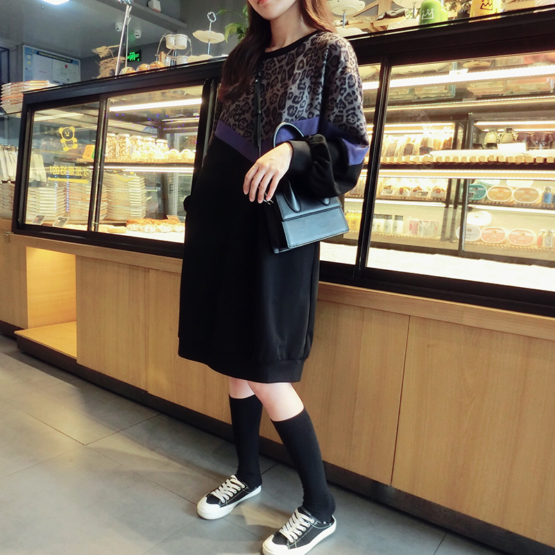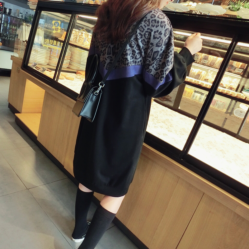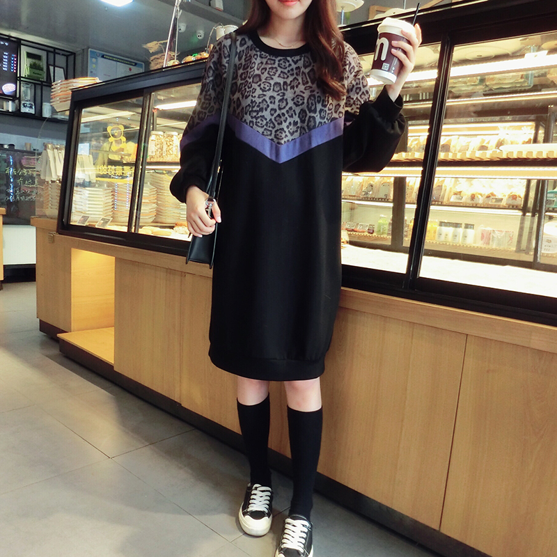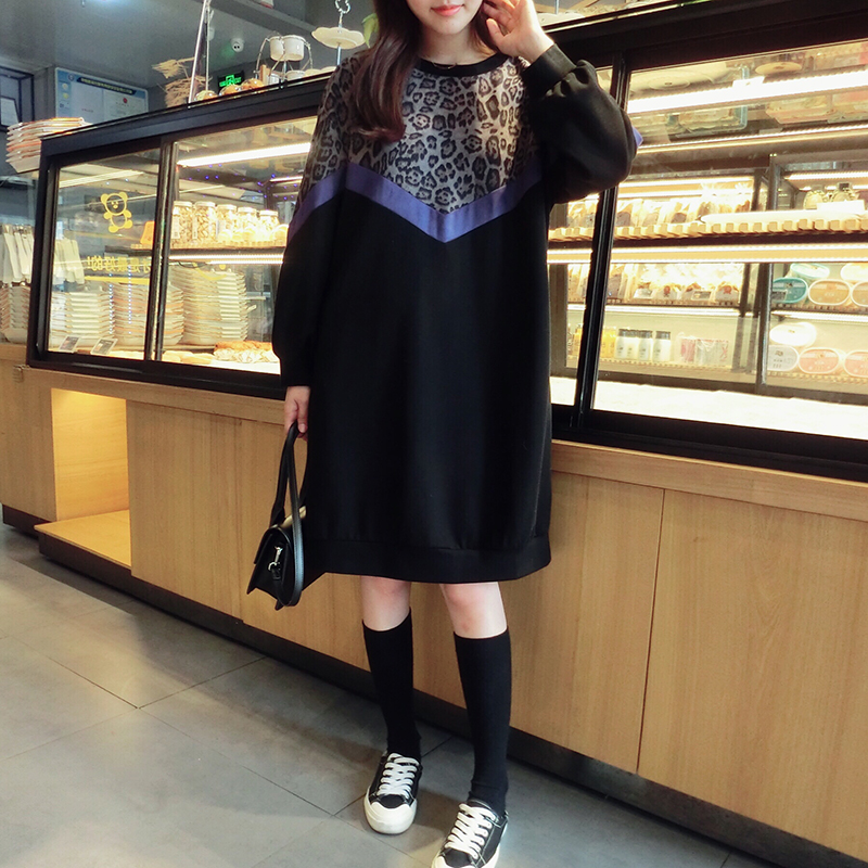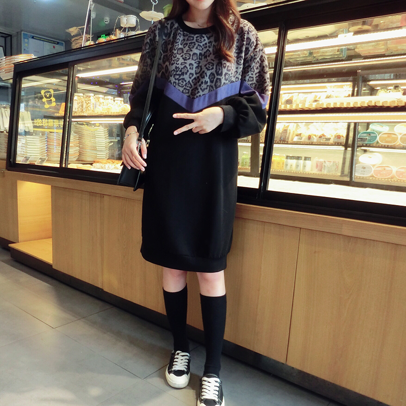 韓版2019秋季新款豹紋拼接中長款寬松連衣裙女氣質百搭打底衛衣裙1入