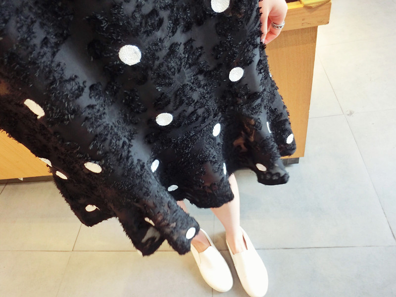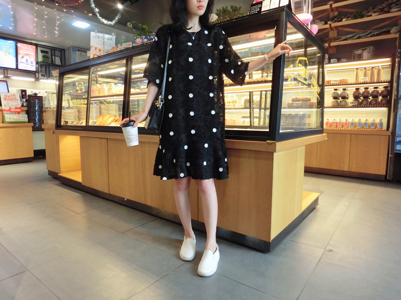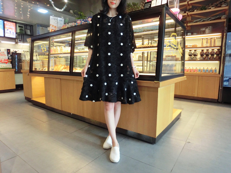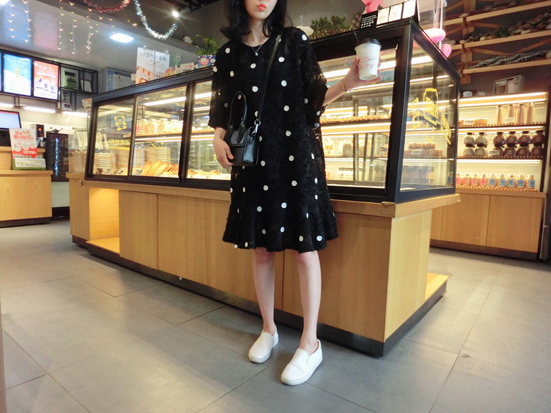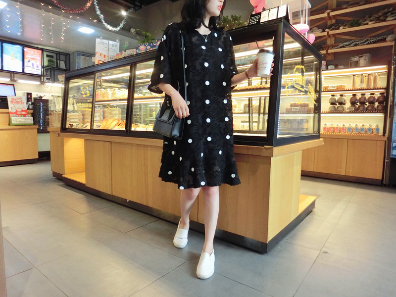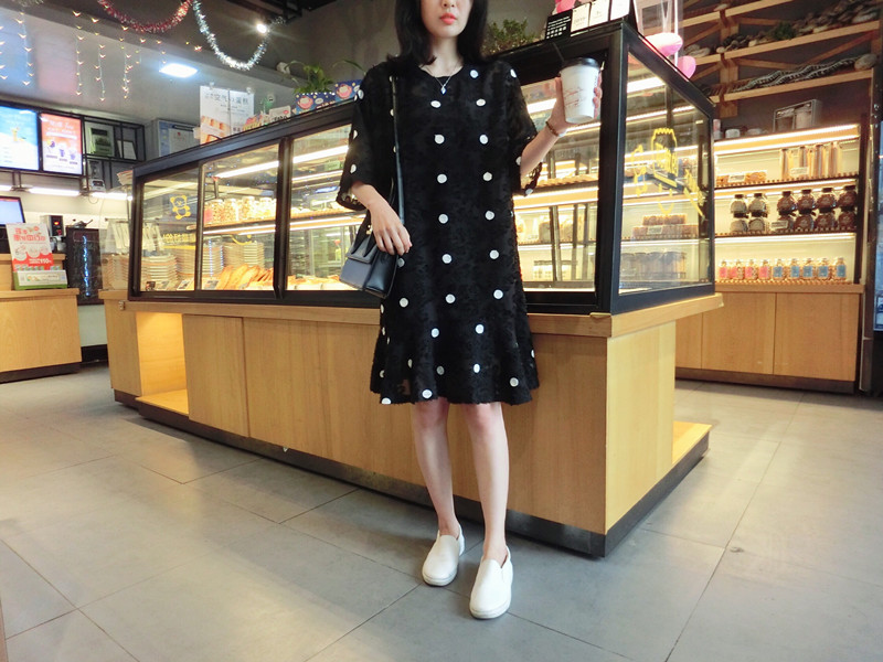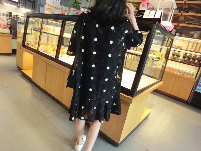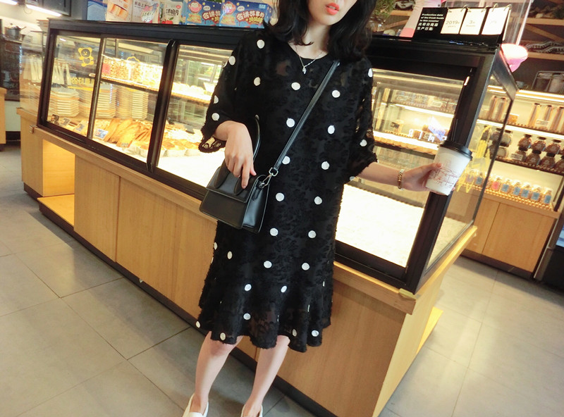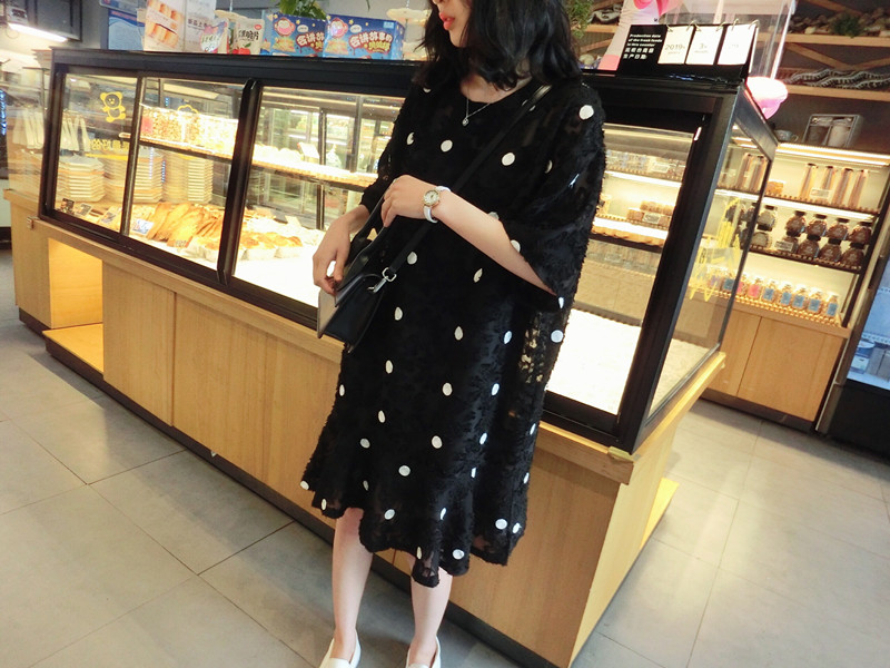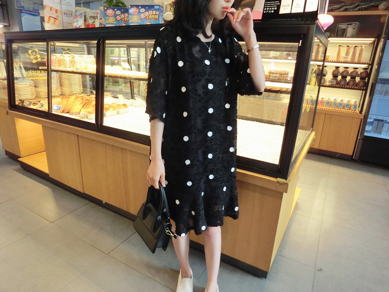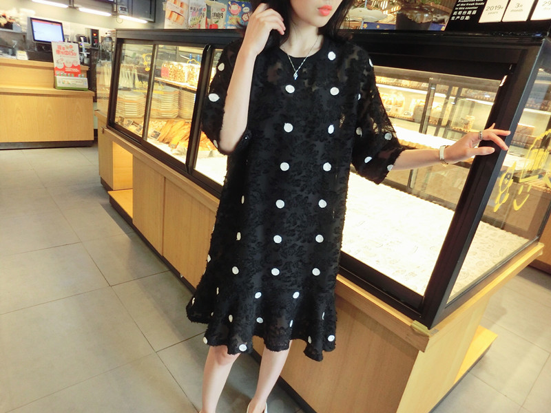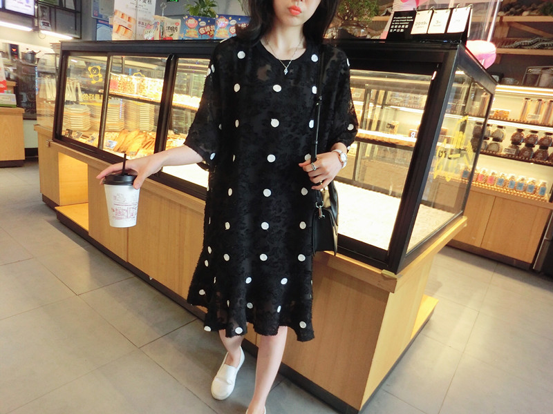 韓國2019夏裝短袖圓點胖mm大碼女裝中長款刺繡波點鏤空連衣裙1入