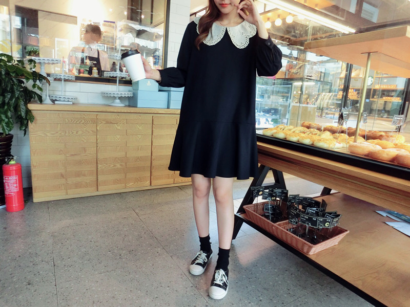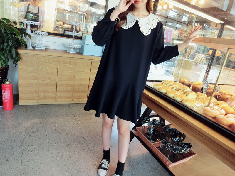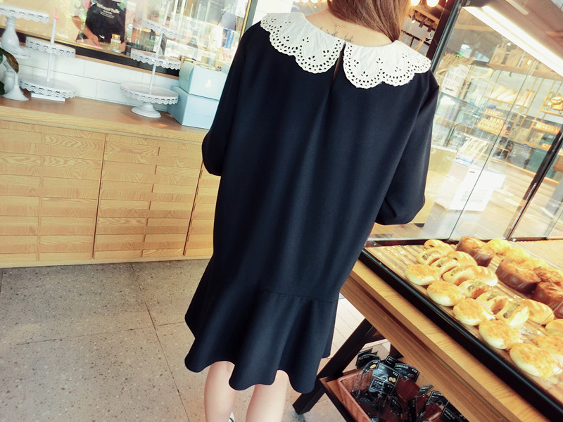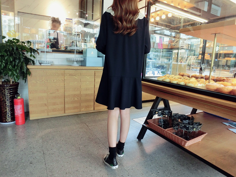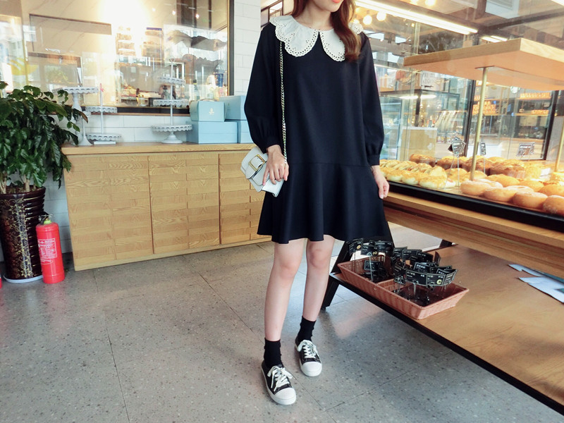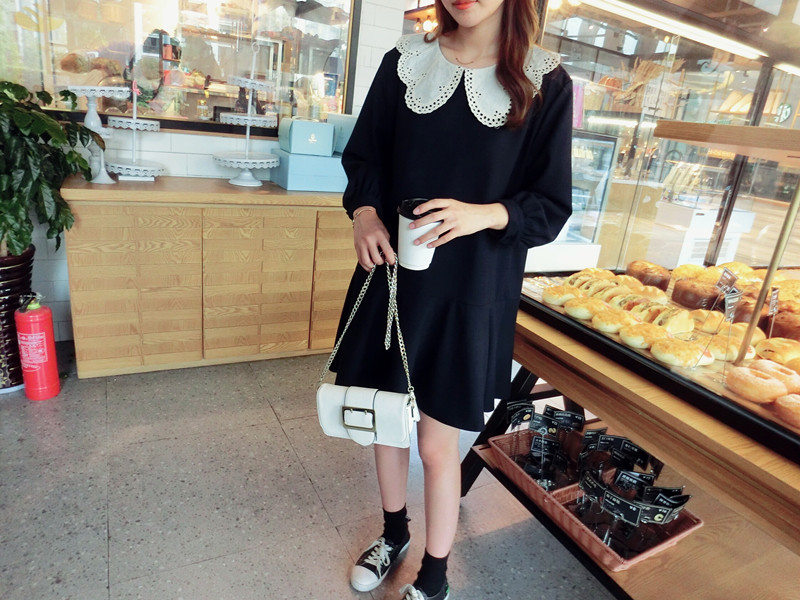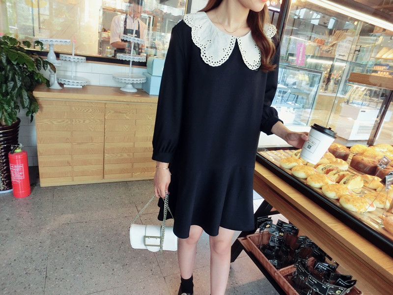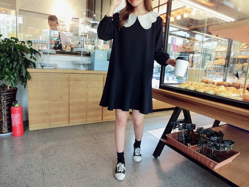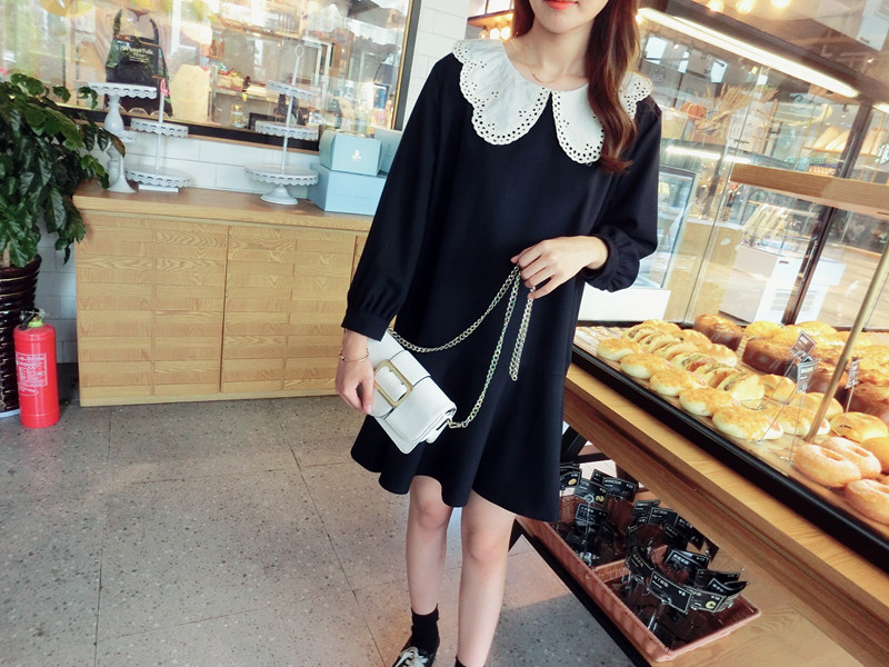 2019秋季新款女裝花邊娃娃領中長款韓版寬松荷葉邊連衣裙1入