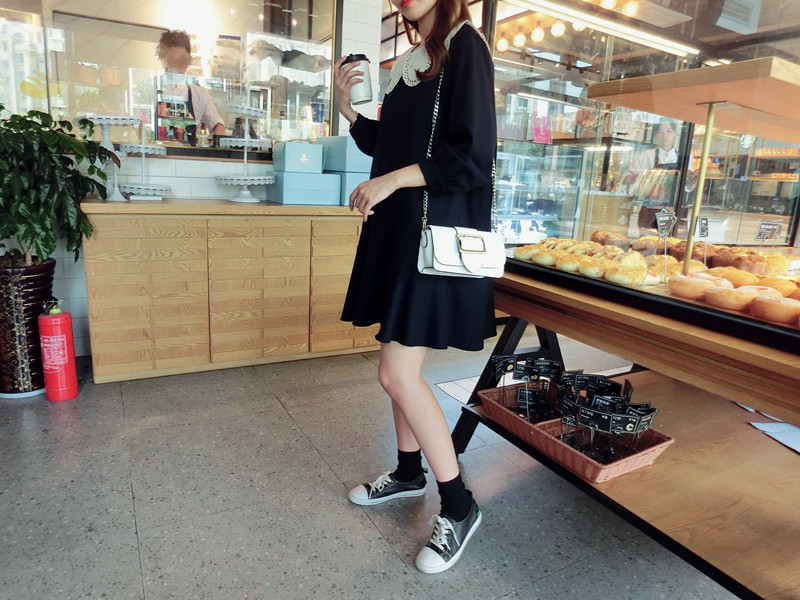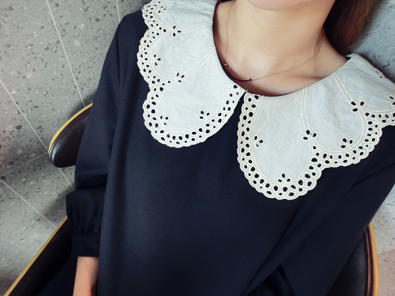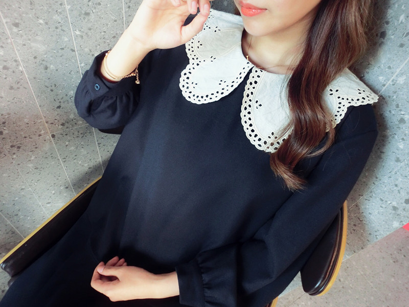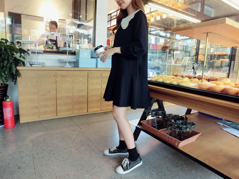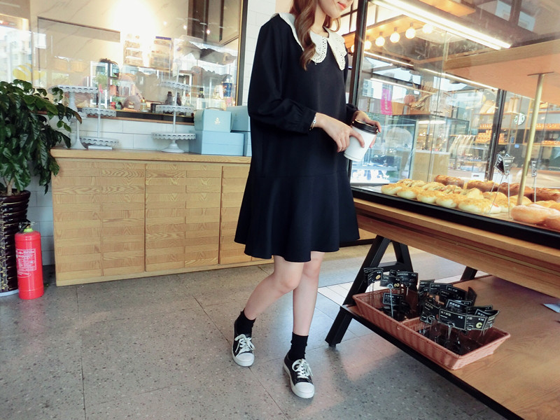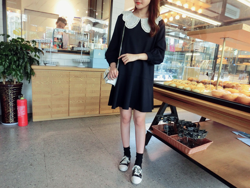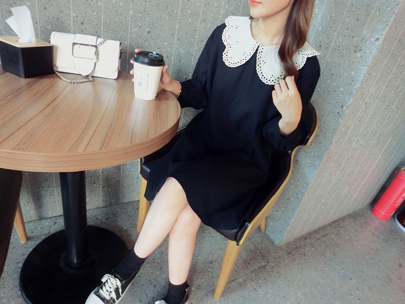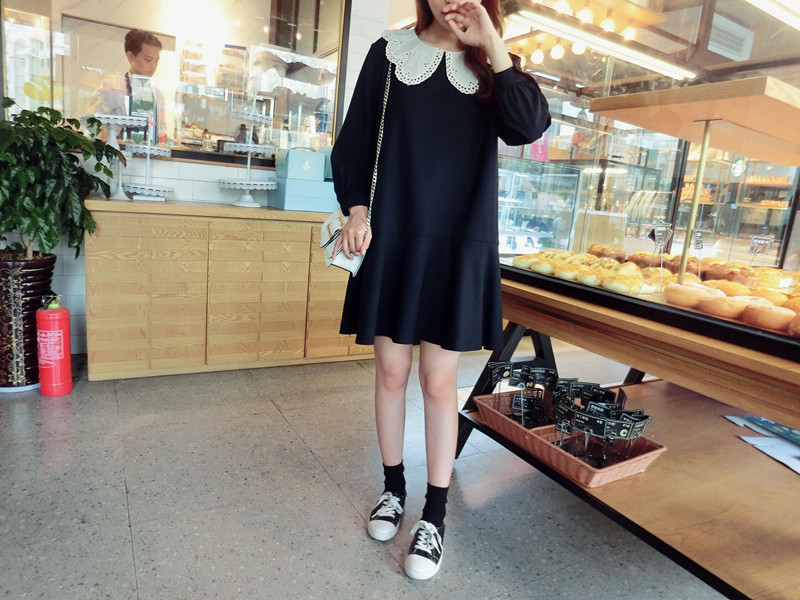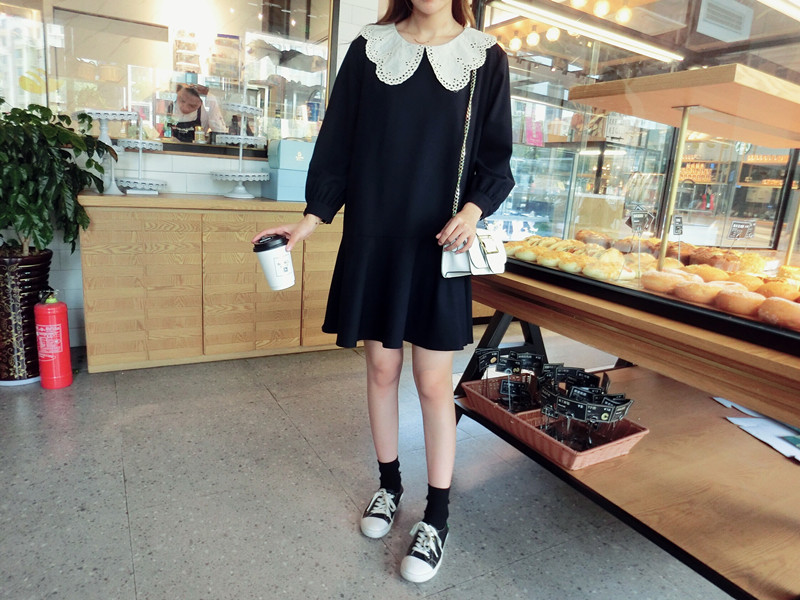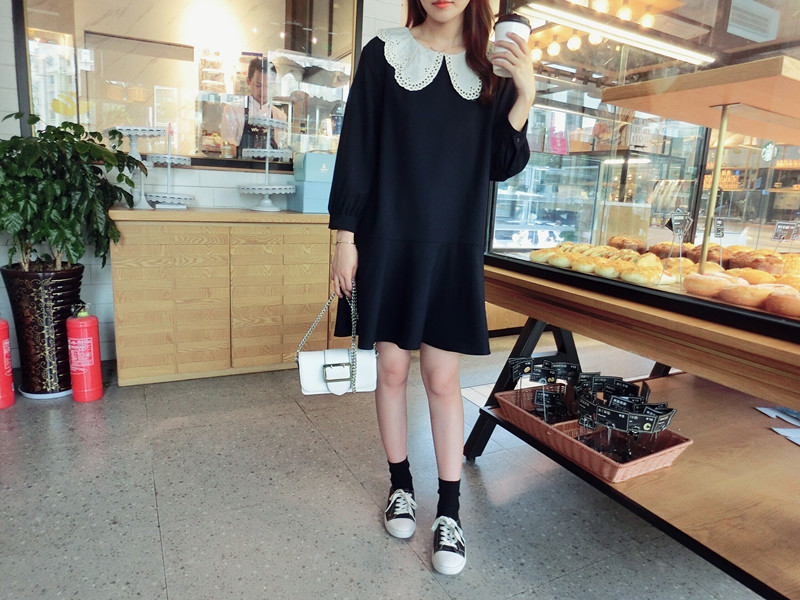 2019秋季新款女裝花邊娃娃領中長款韓版寬松荷葉邊連衣裙1入