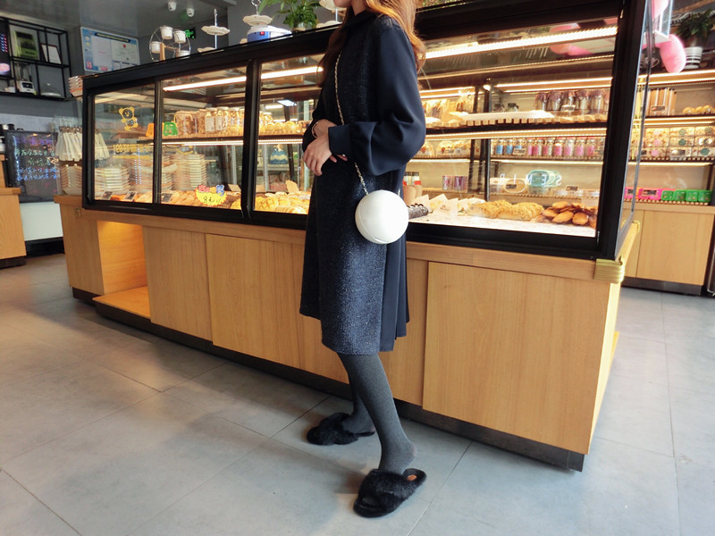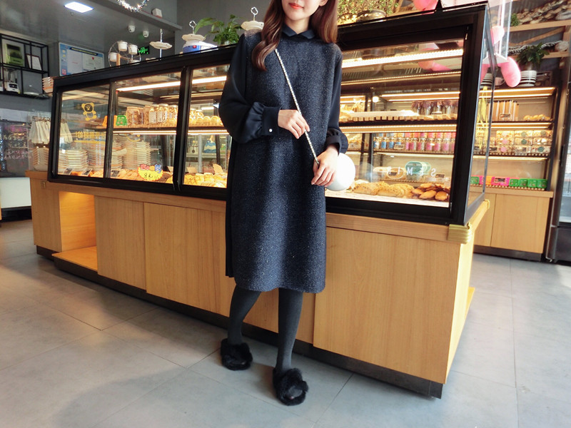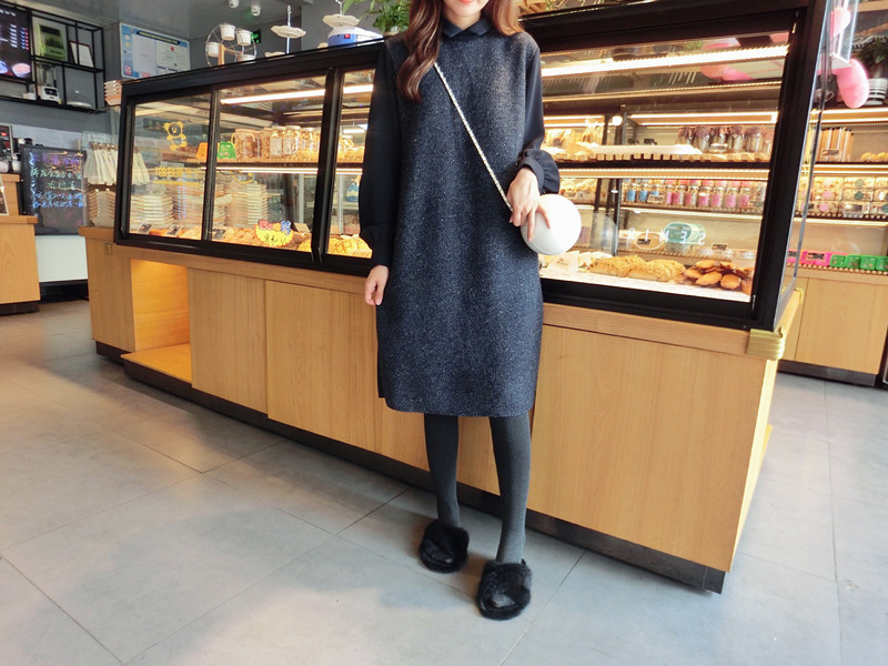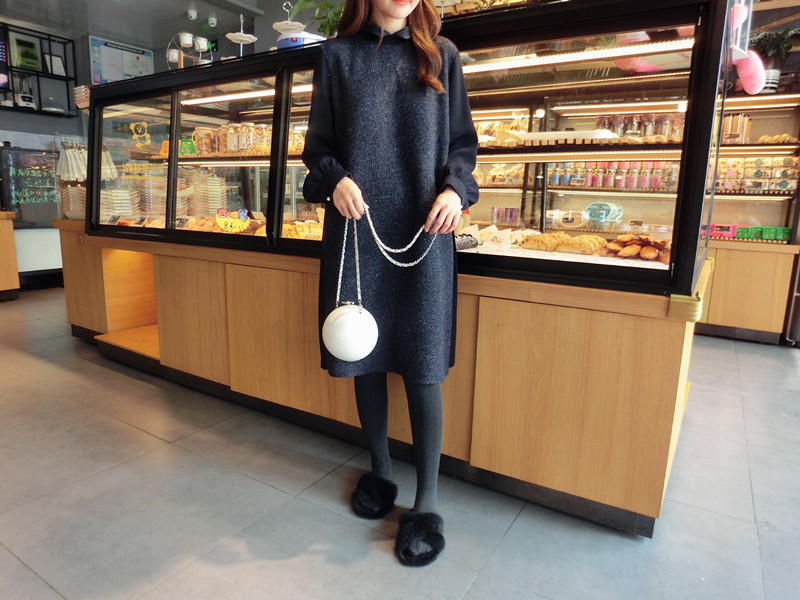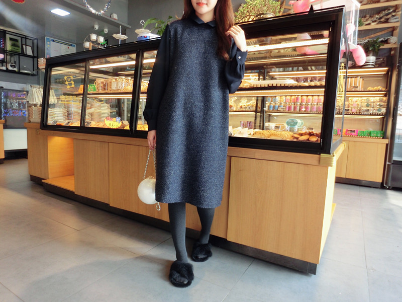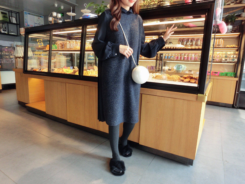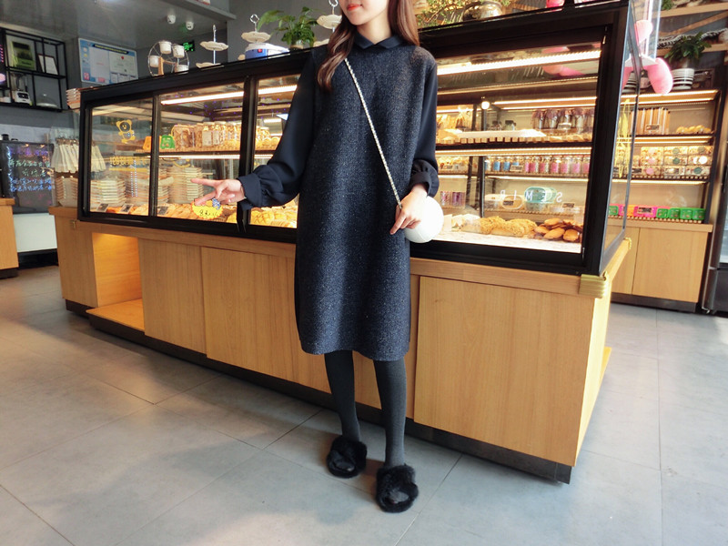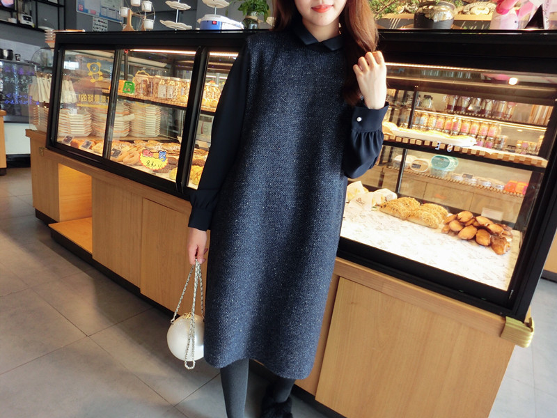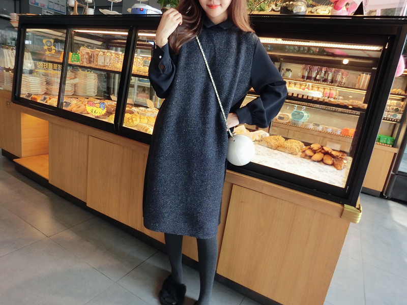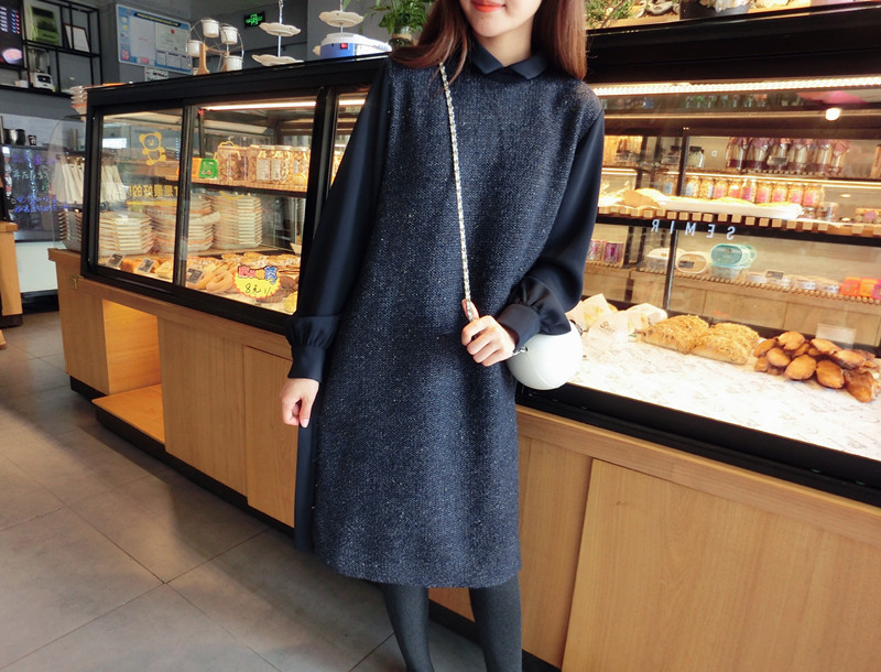 韓版2019秋季新款打底裙中長款韓版寬松百褶針織拼接連衣裙女百搭1入