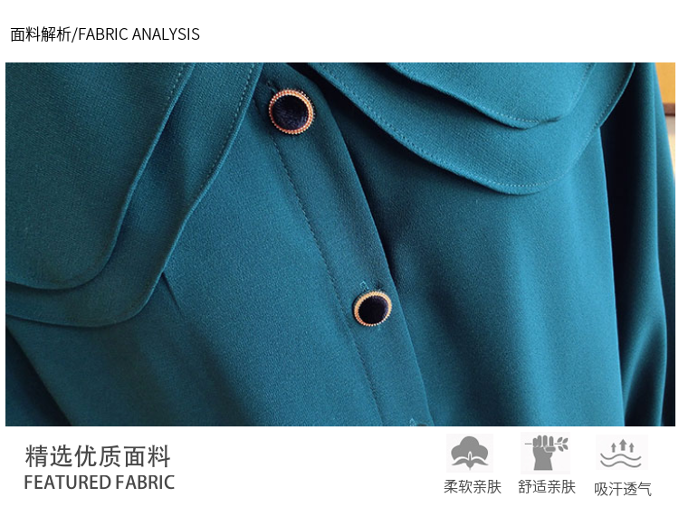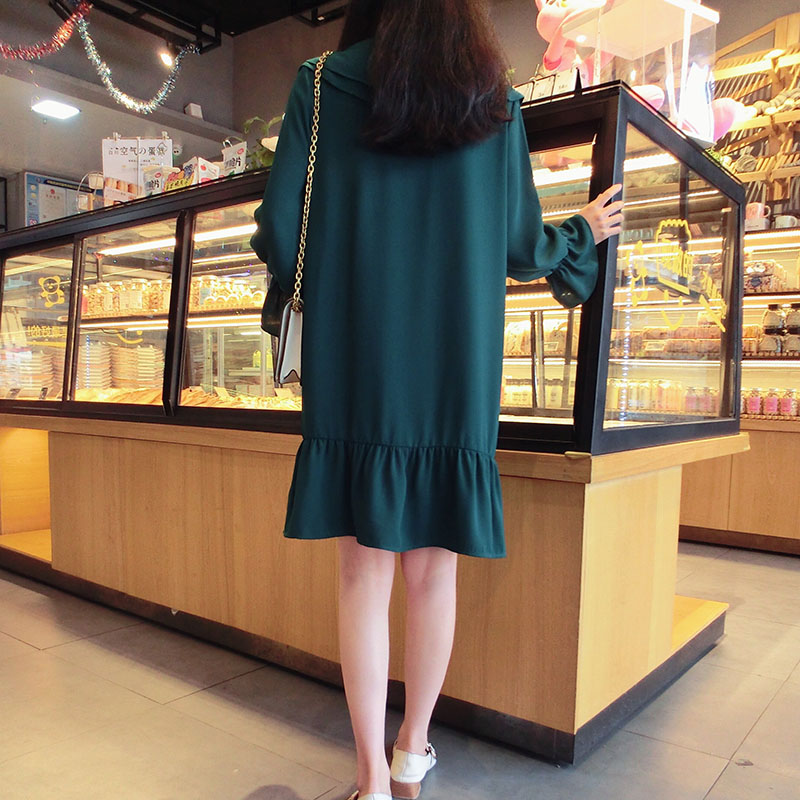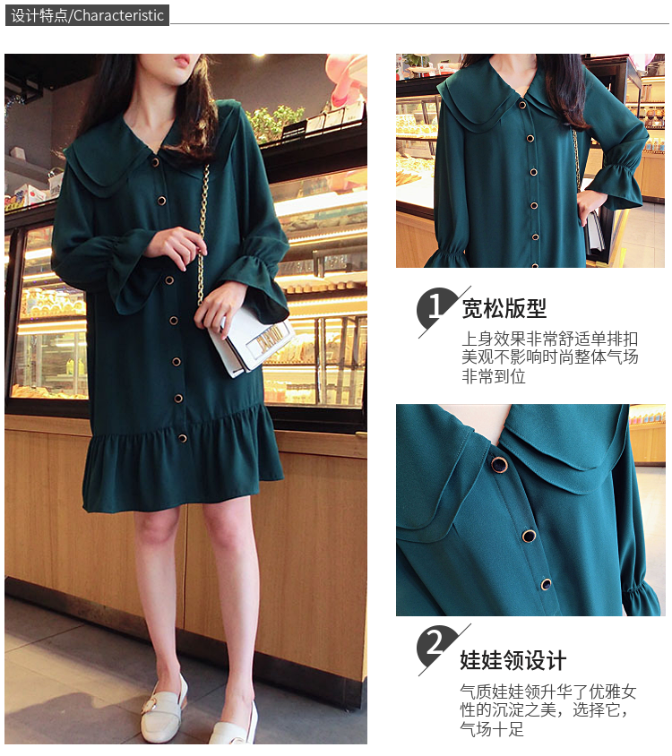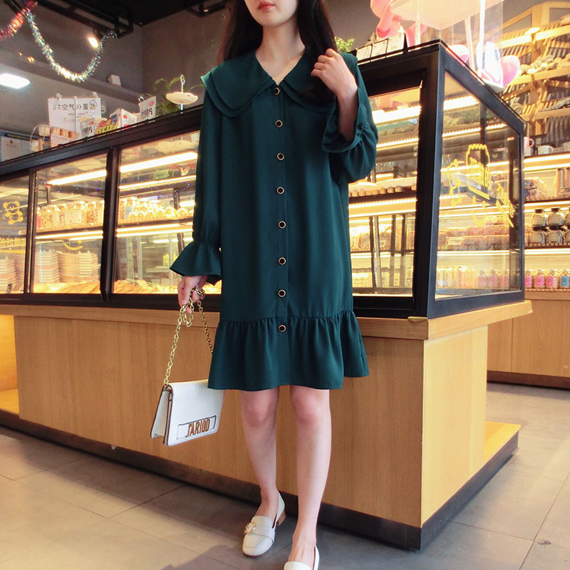 韓版2019春夏新品學院風寬松顯瘦中長款娃娃領單排扣荷葉袖連衣裙1入