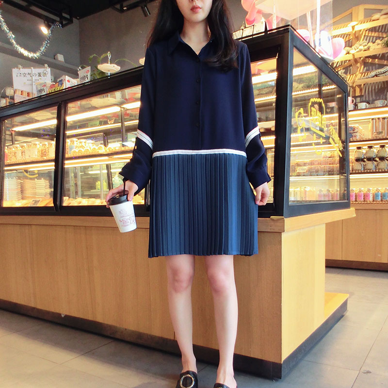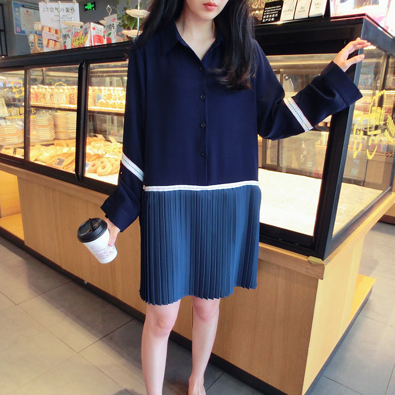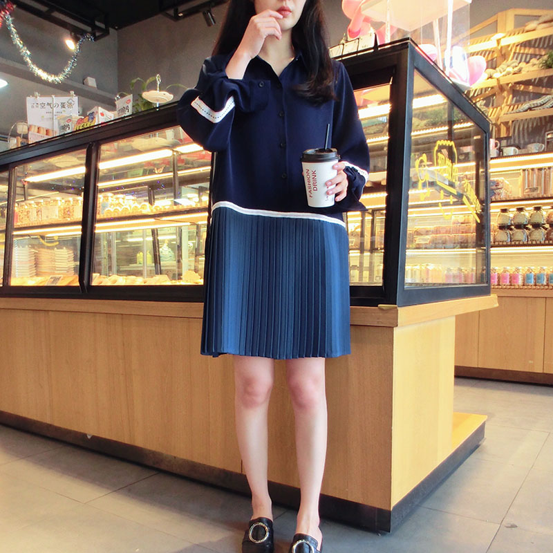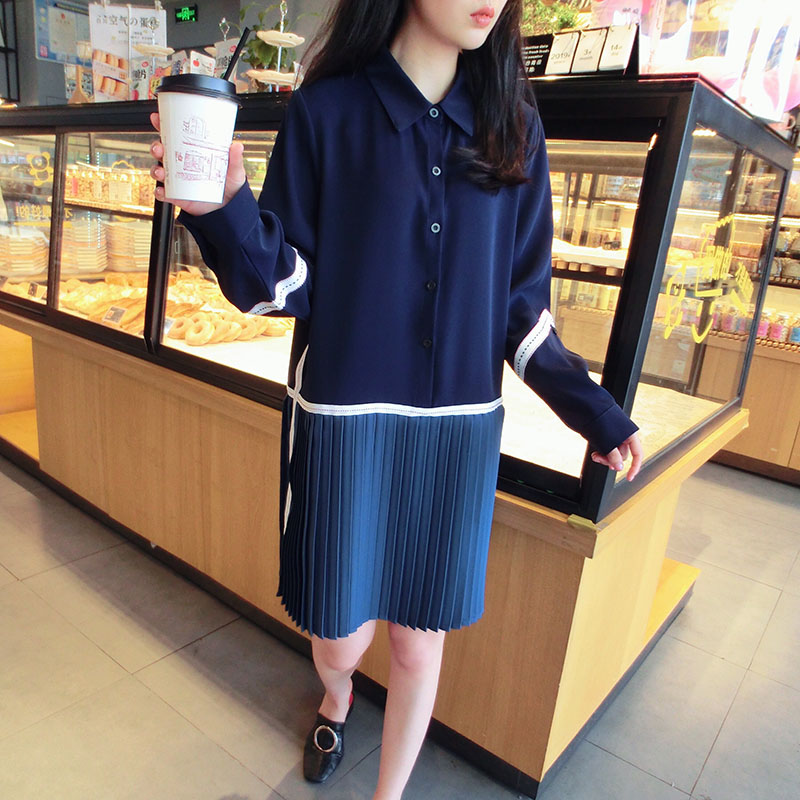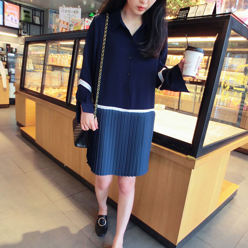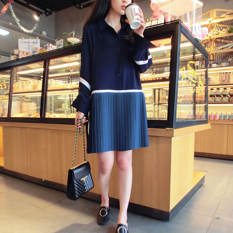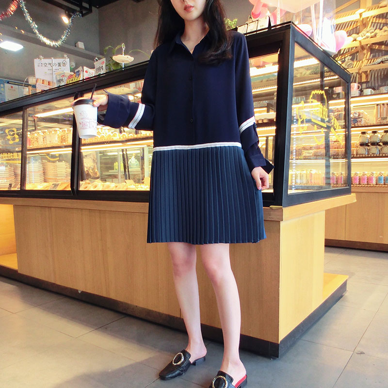 2019春裝新款女裝時尚歐洲站拼接襯衫連衣裙中長款寬松顯瘦百褶裙1入