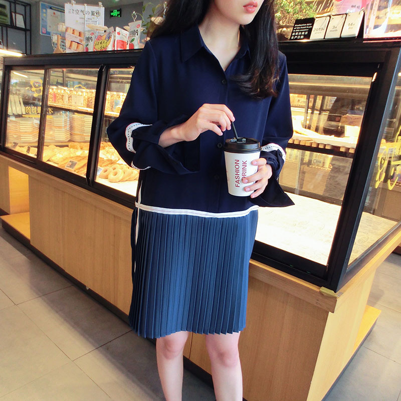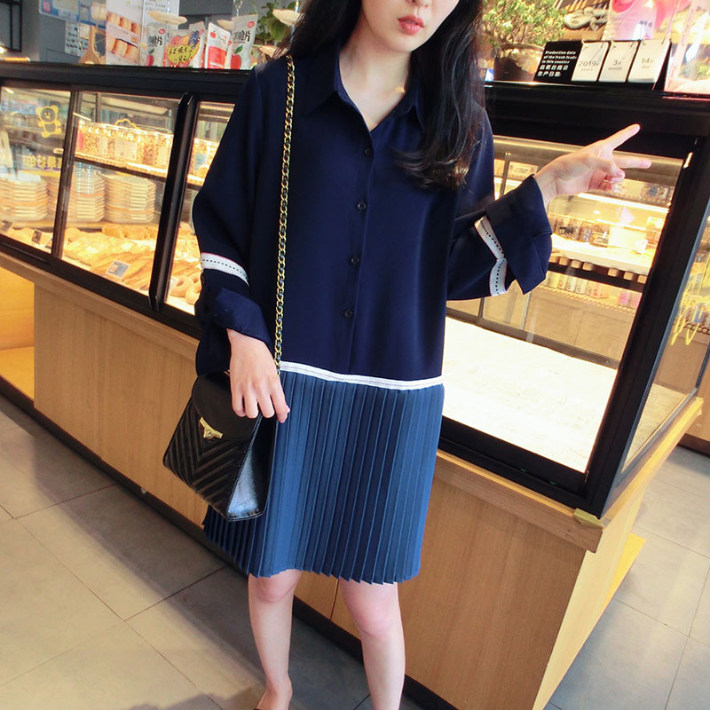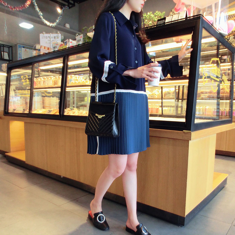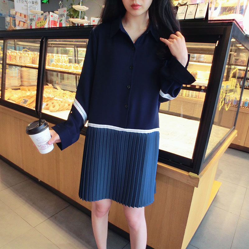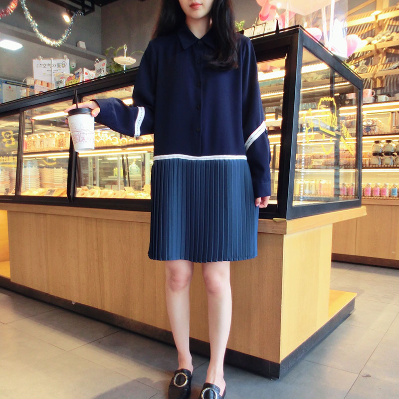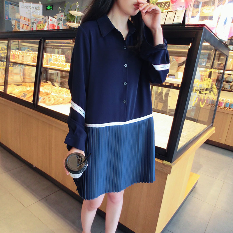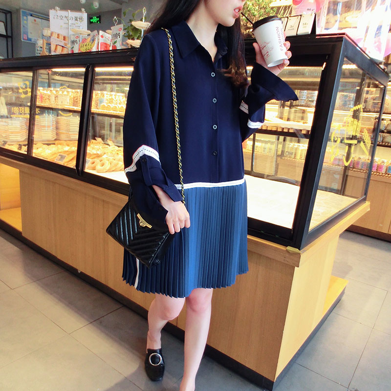 2019春裝新款女裝時尚歐洲站拼接襯衫連衣裙中長款寬松顯瘦百褶裙1入