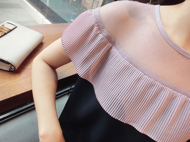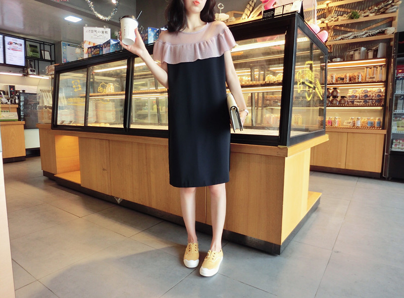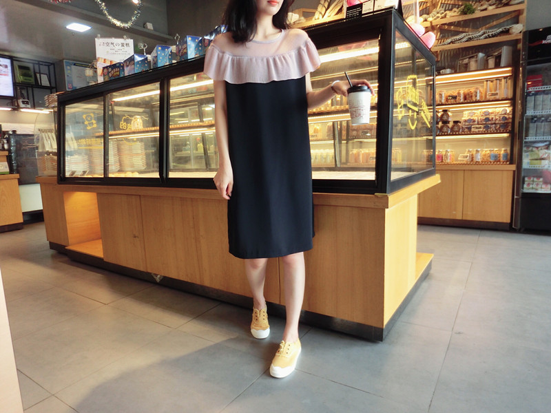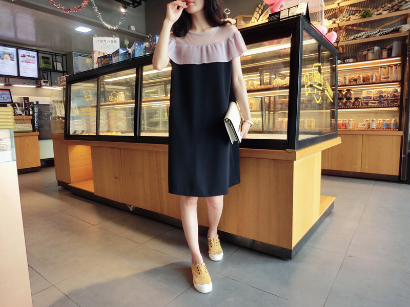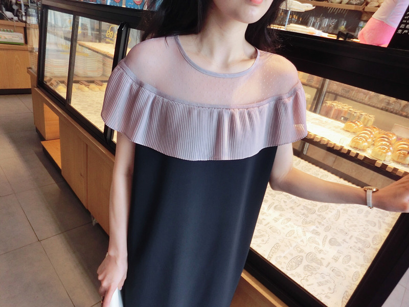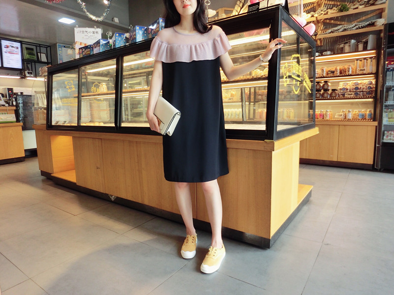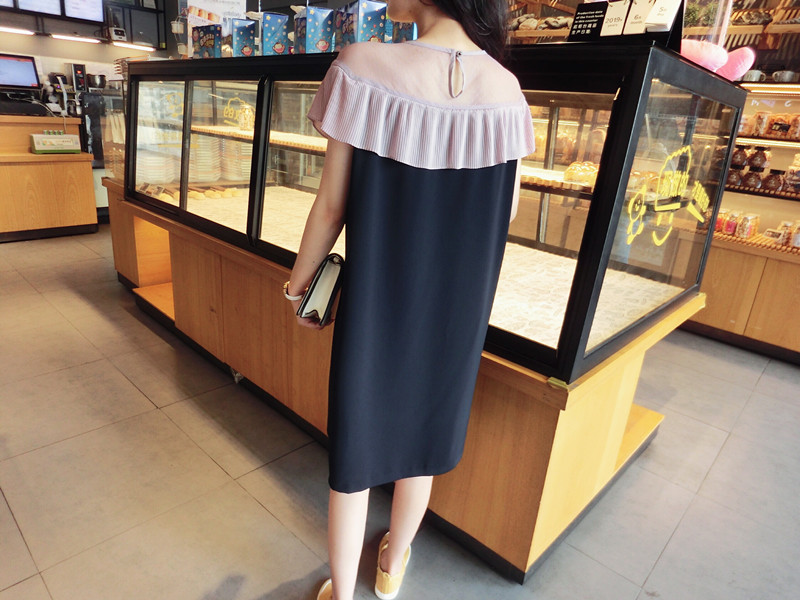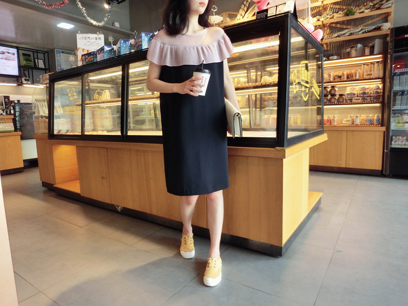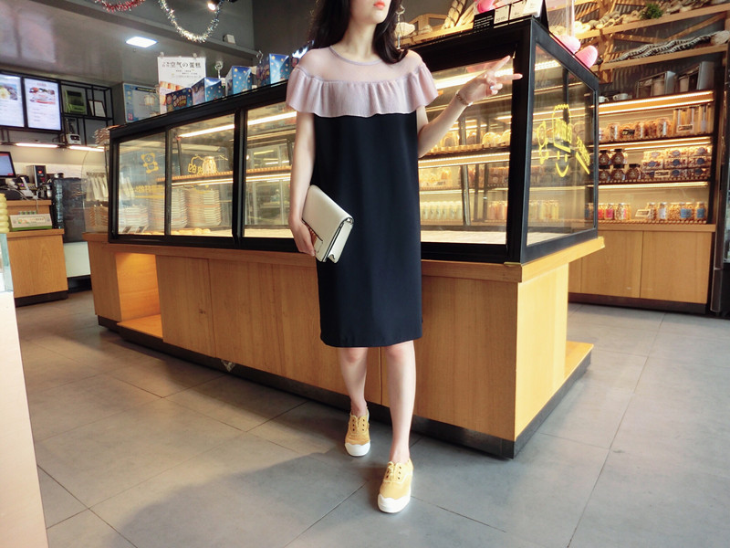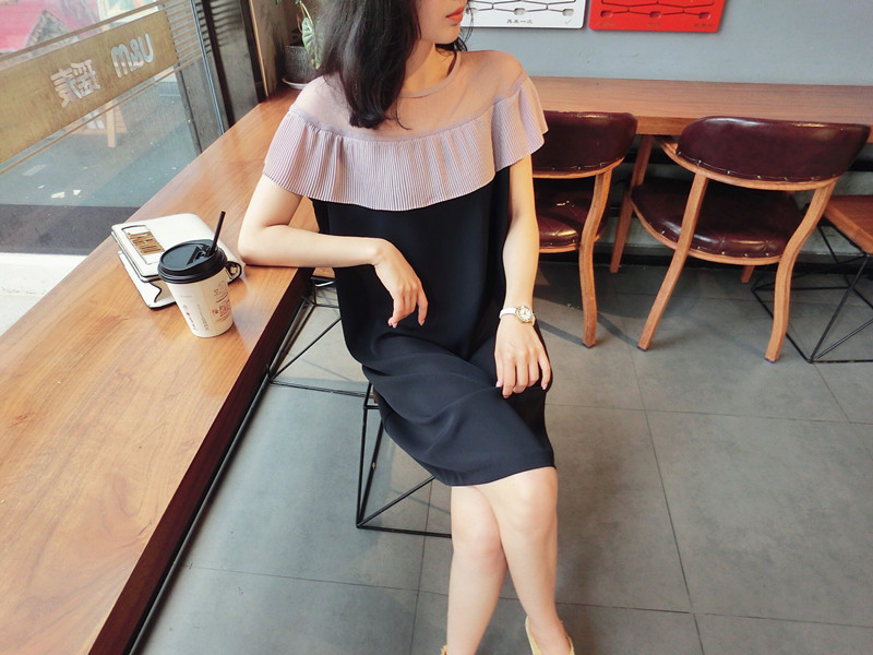 韓國東大門2019夏季新款拼接一字領雪紡百搭女名媛風優雅連衣裙1入