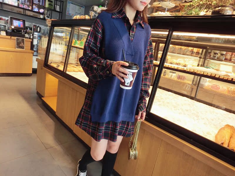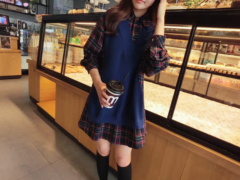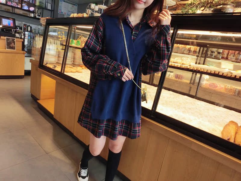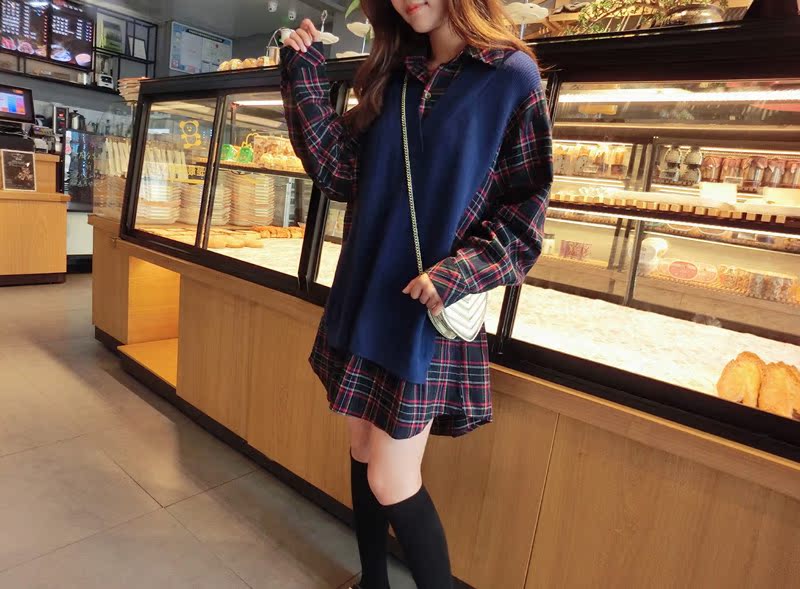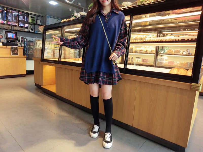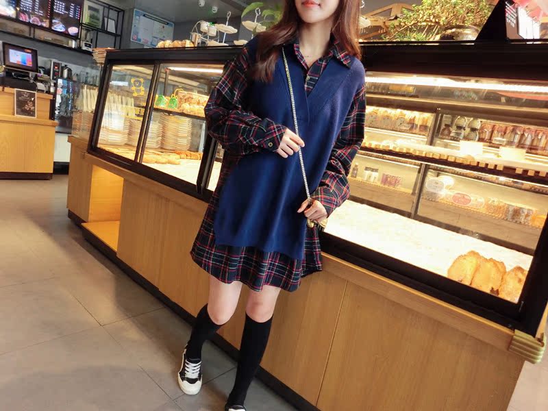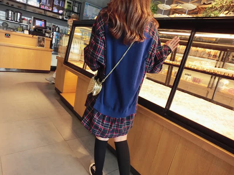 2019秋季新款拼接款格子上衣寬松假兩件衛衣百搭套頭襯衫連衣裙女1入