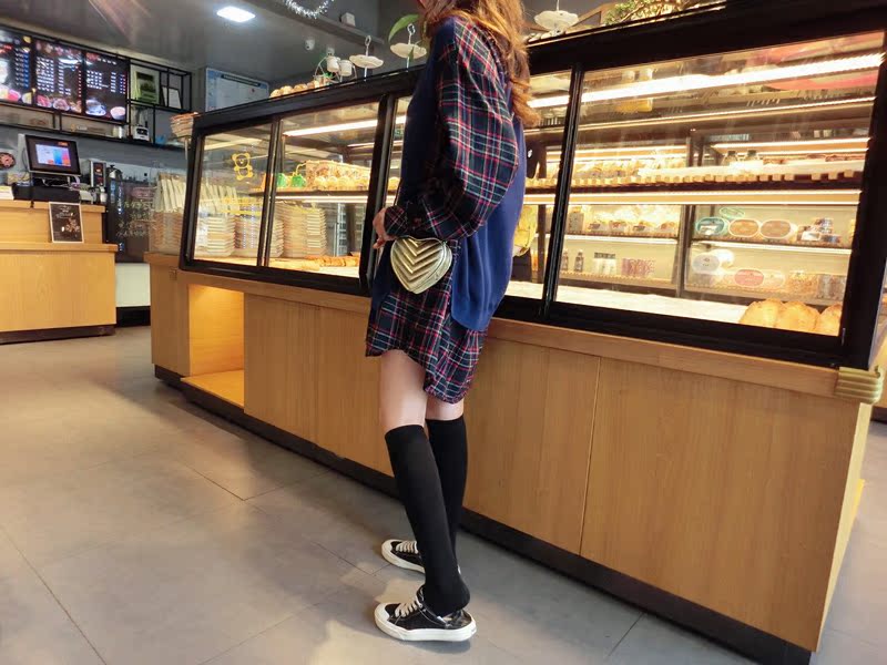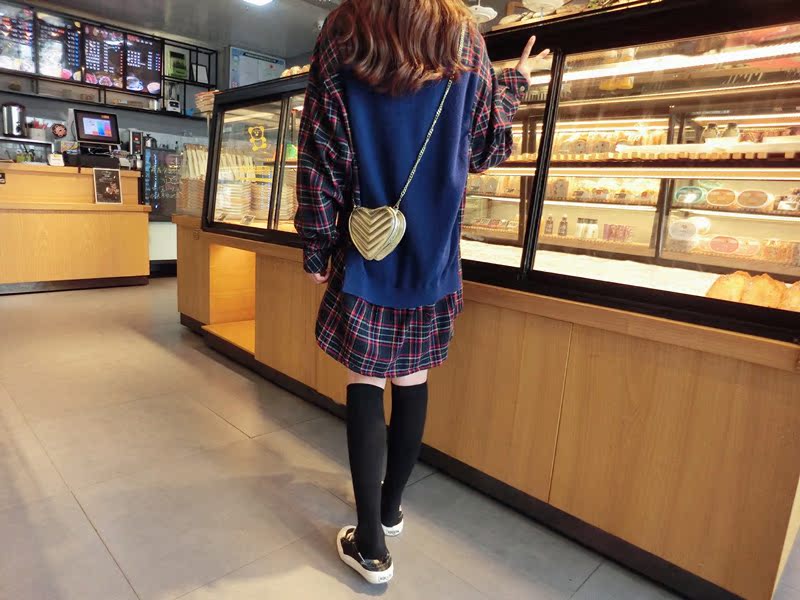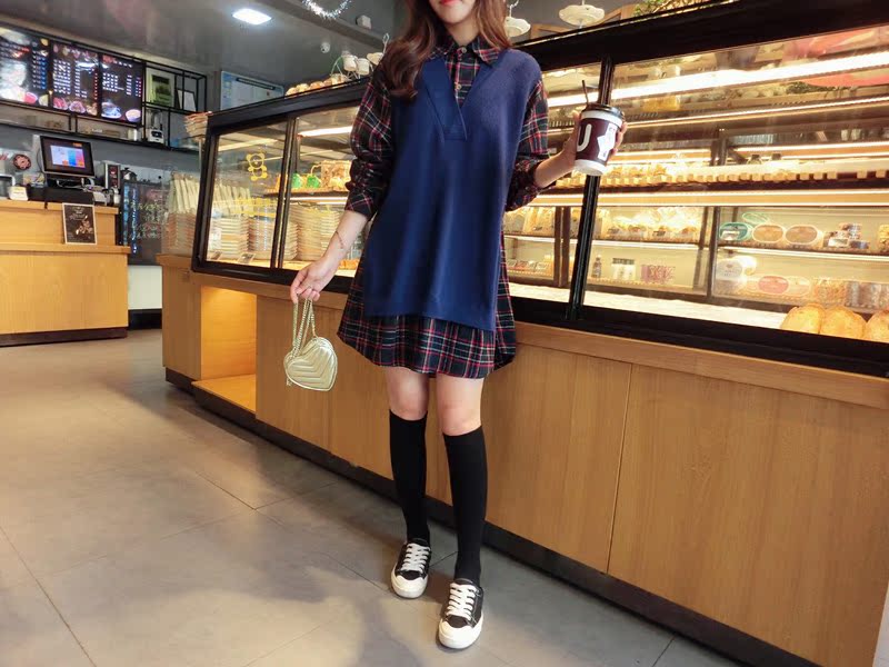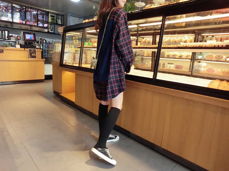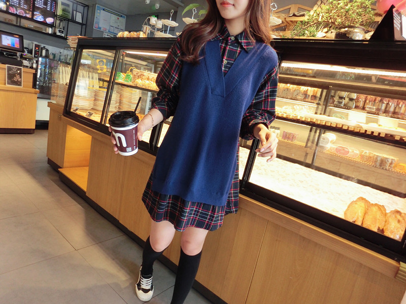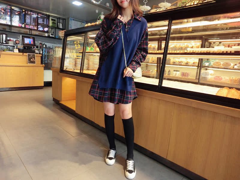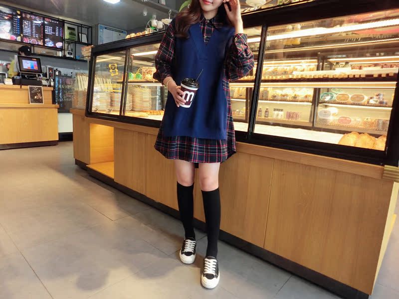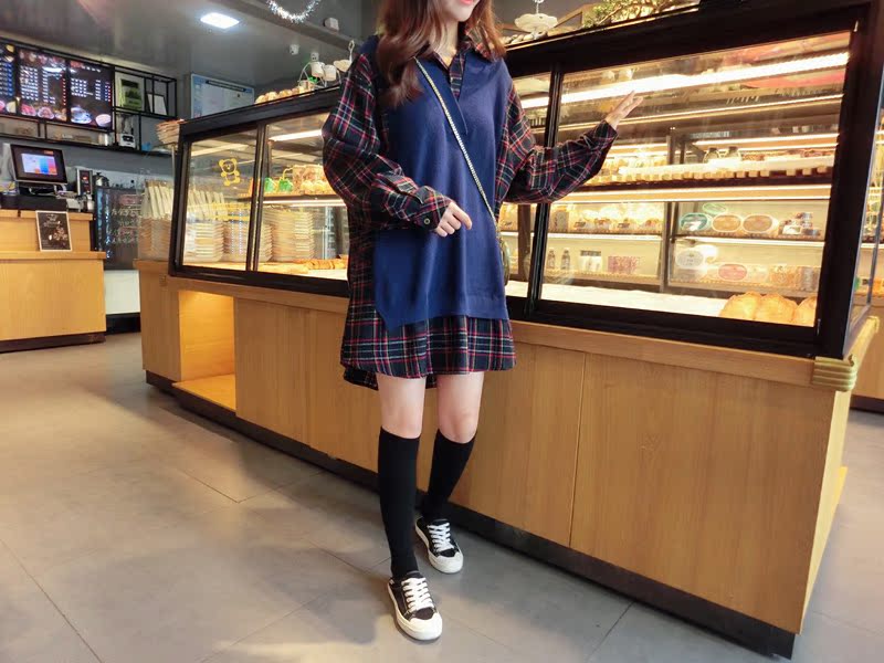2019秋季新款拼接款格子上衣寬松假兩件衛衣百搭套頭襯衫連衣裙女1入