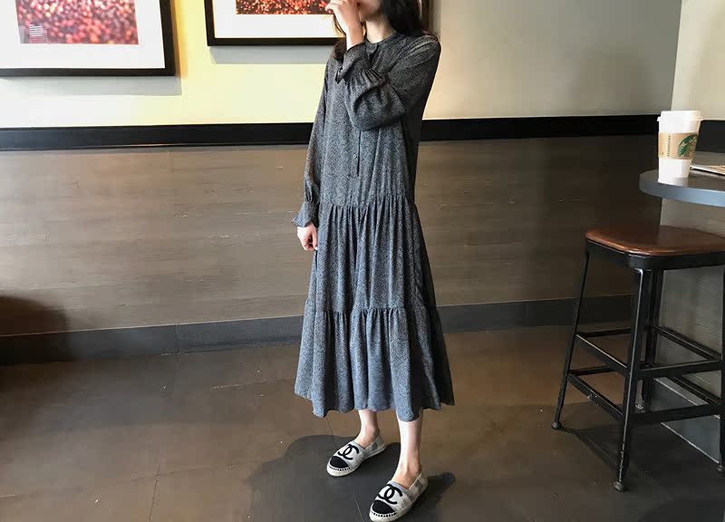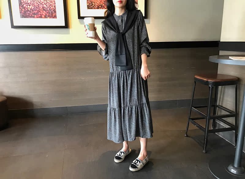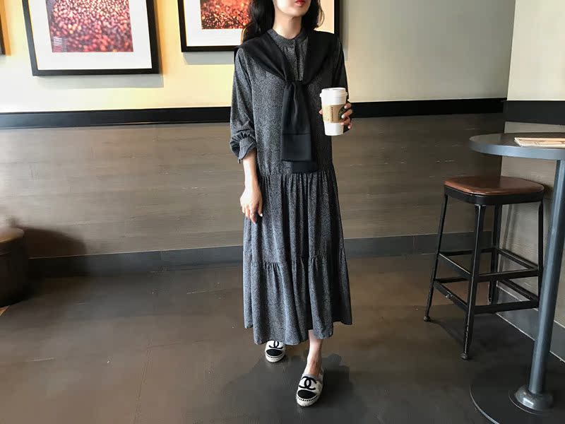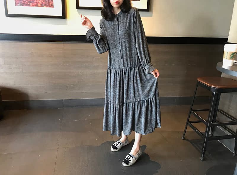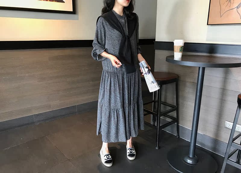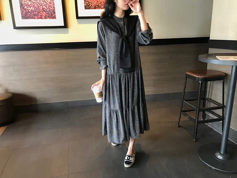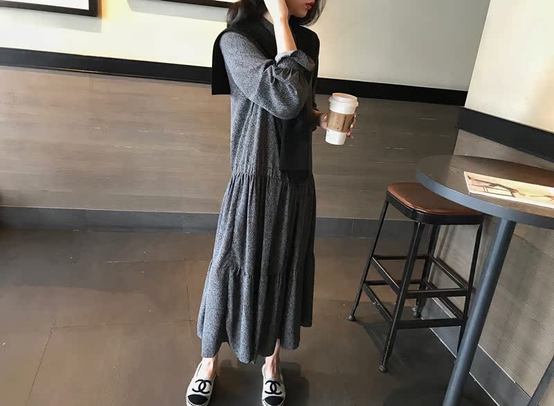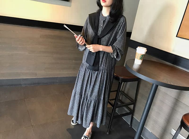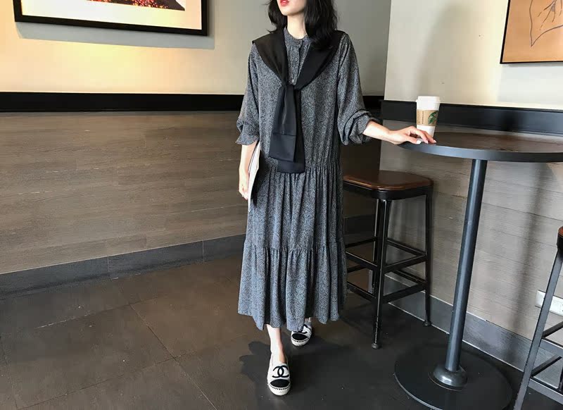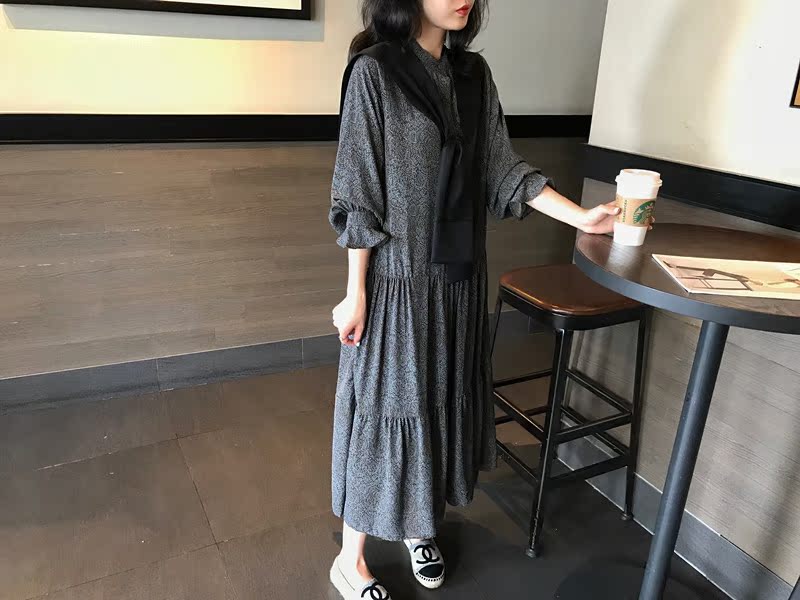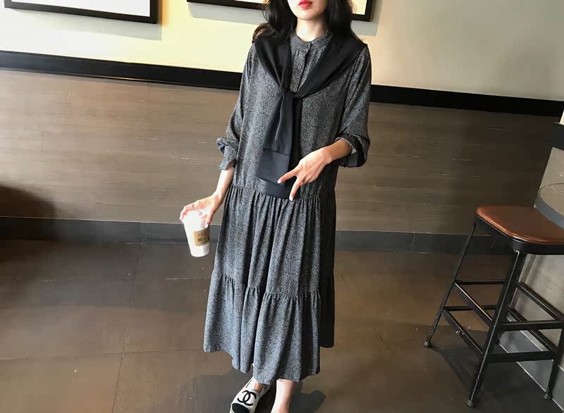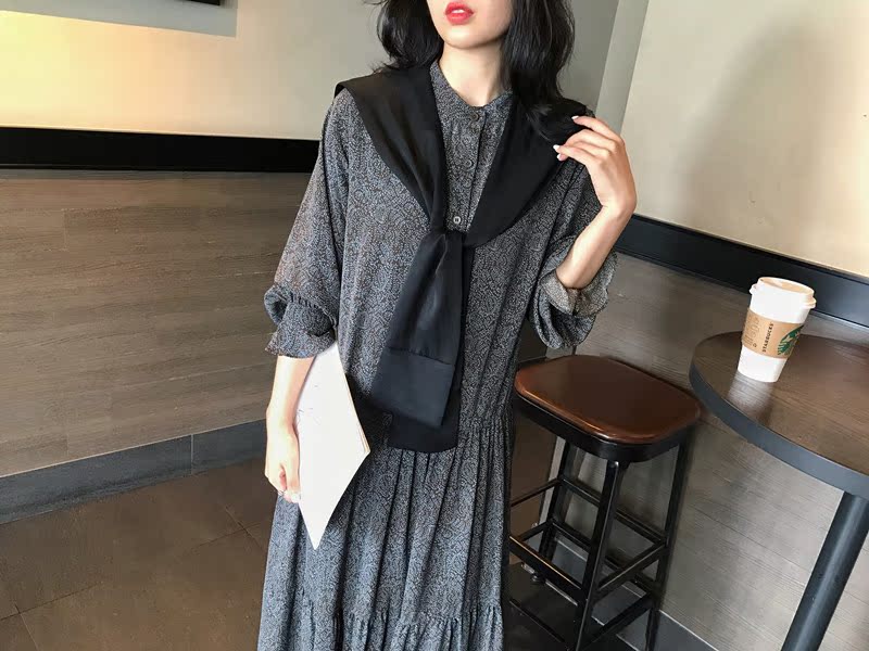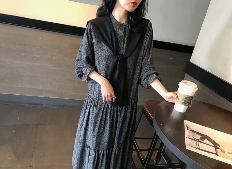 2019秋季新款撞色披肩連衣裙中長款韓版寬松顯瘦學院風碎花打底裙1入