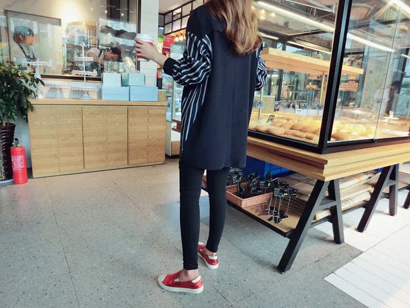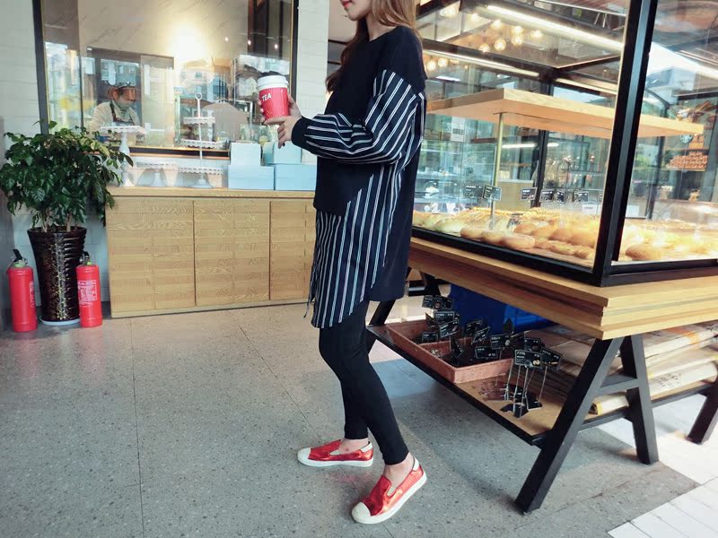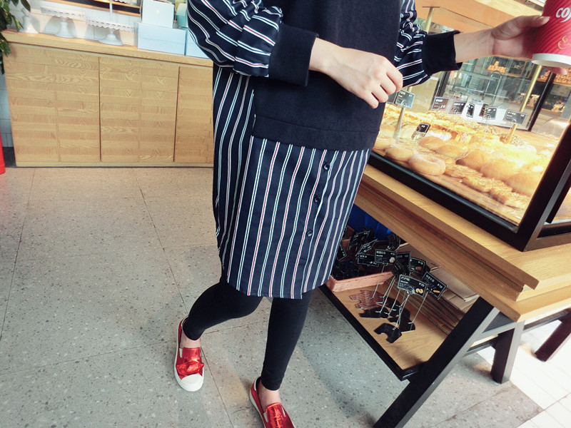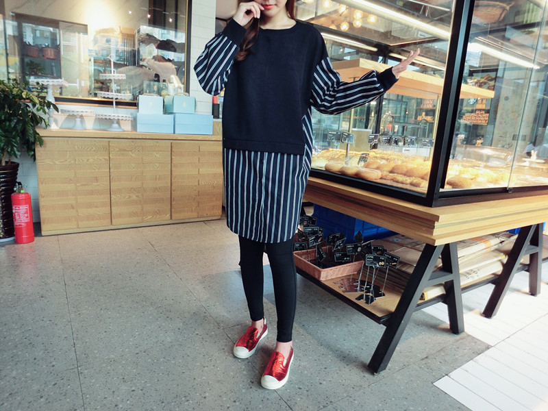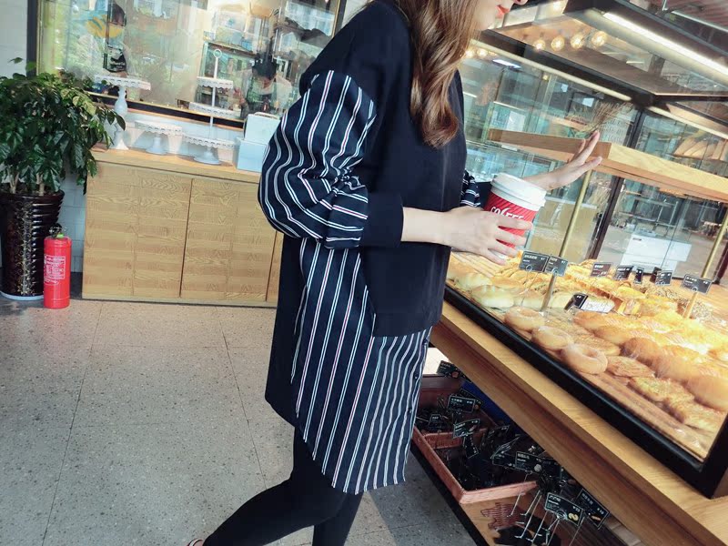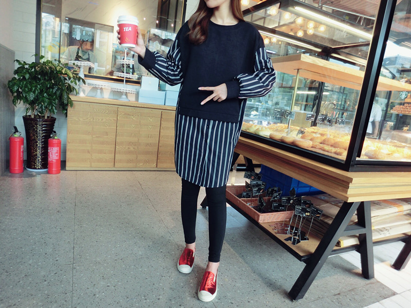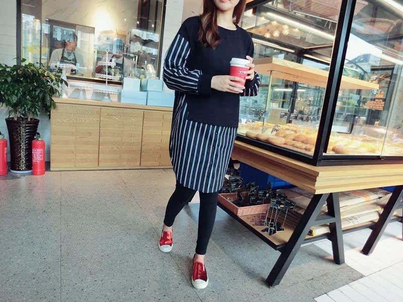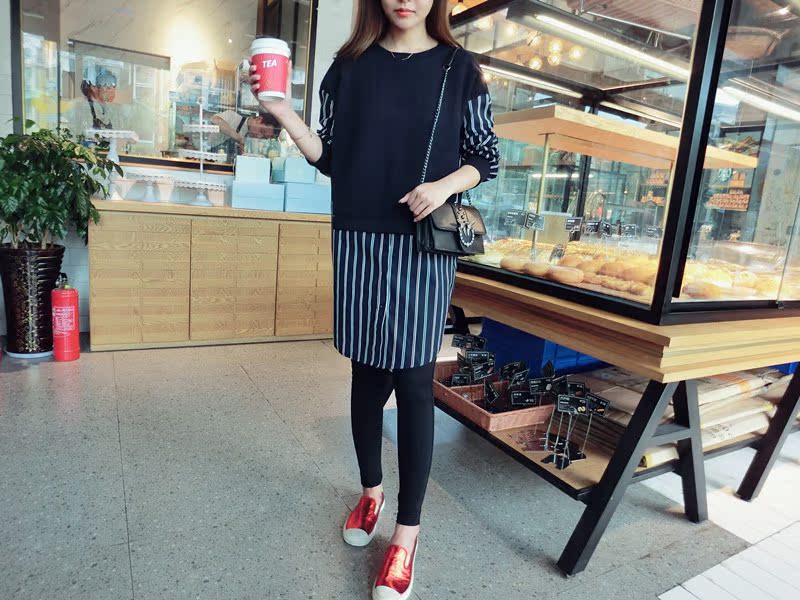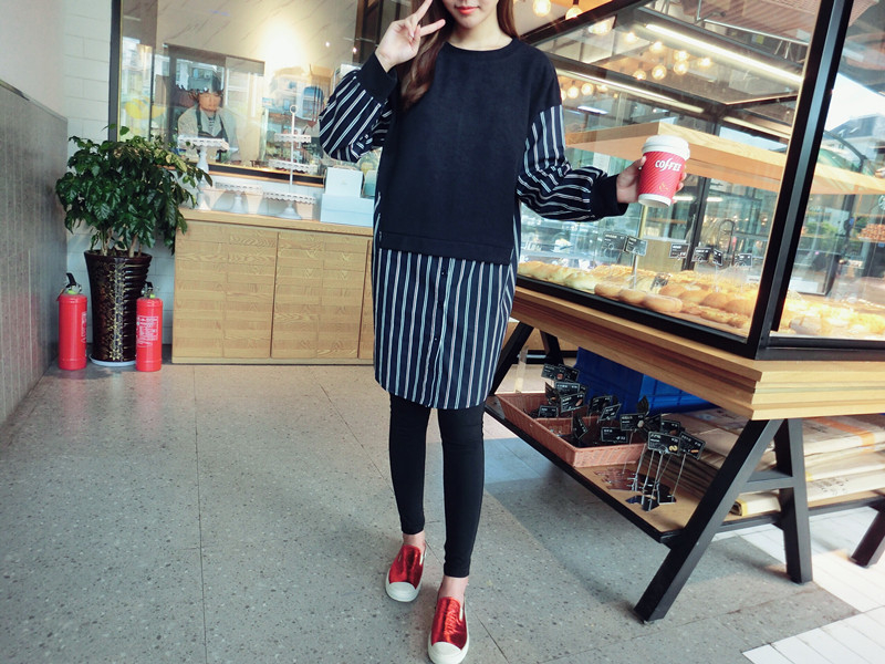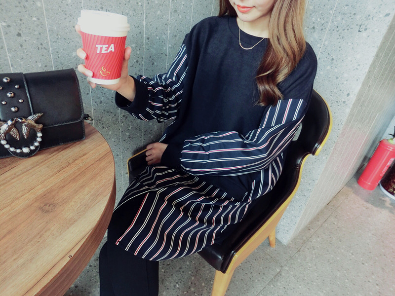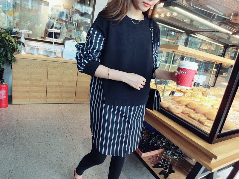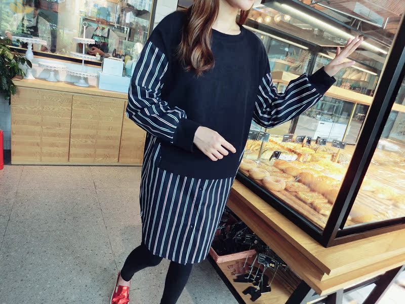 2019秋季大碼女裝韓版原宿chic條紋拼接遮肚洋氣減齡襯衫連衣裙潮1入