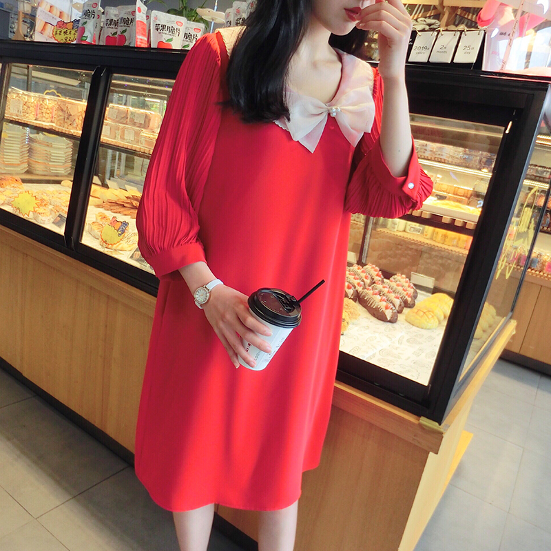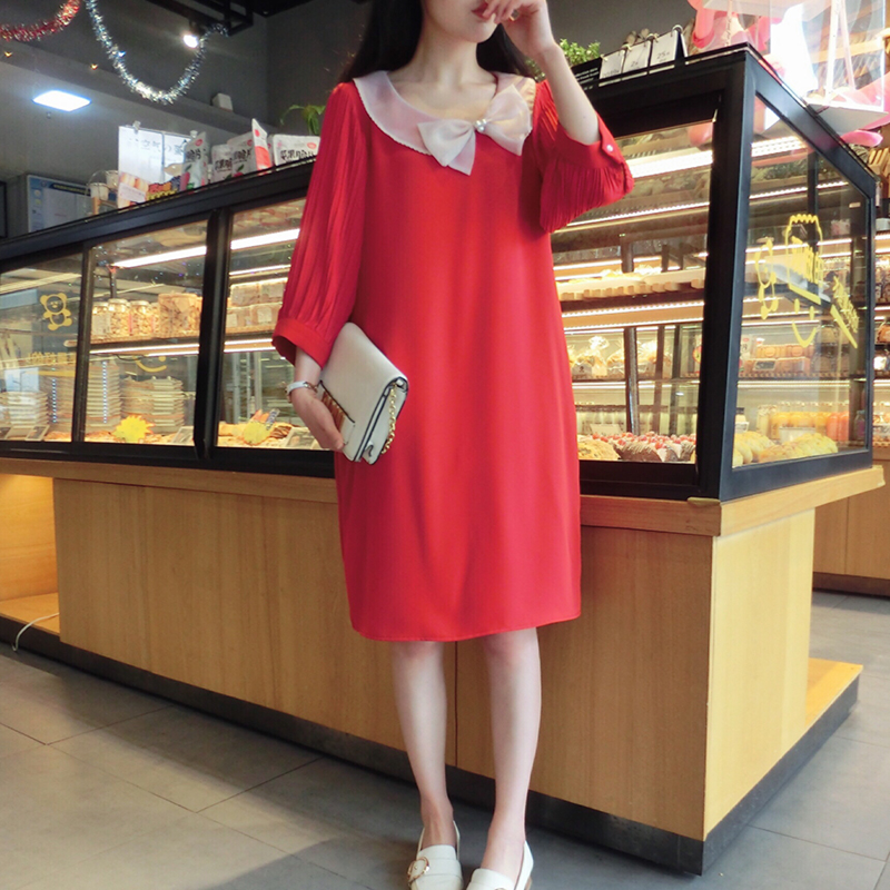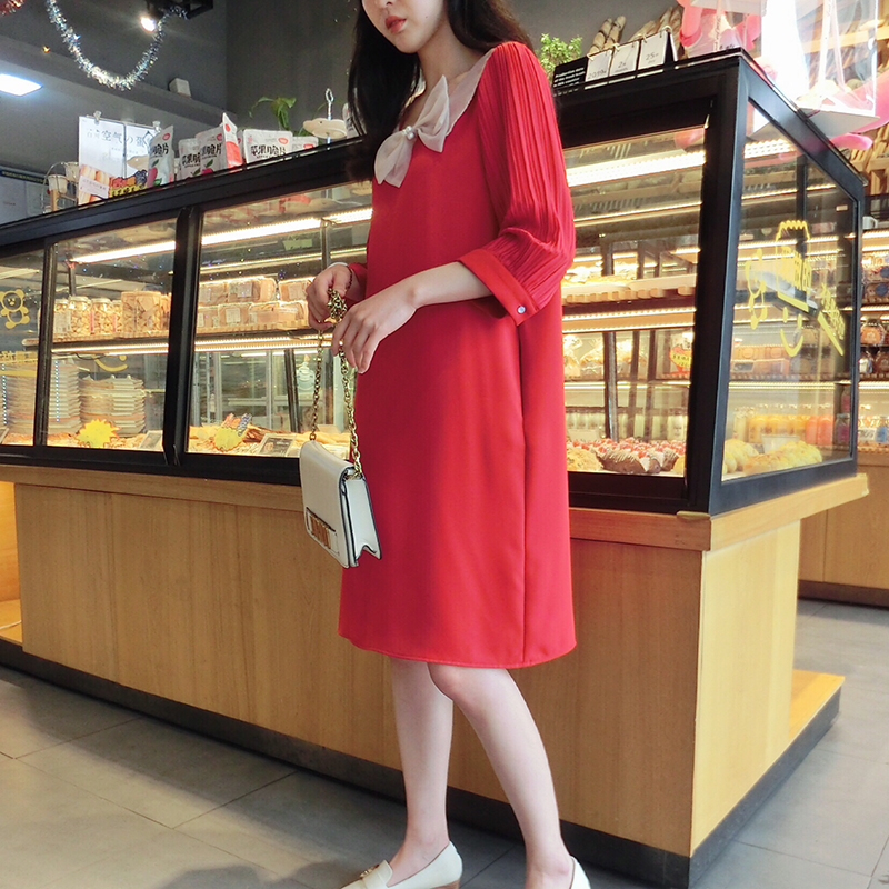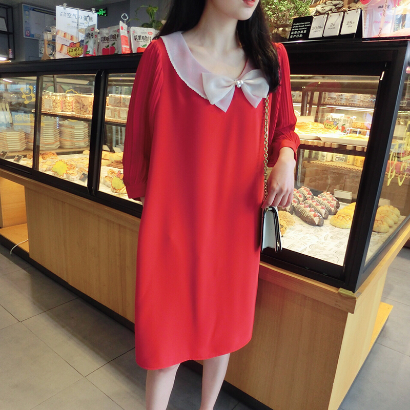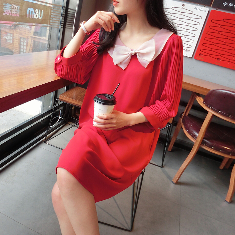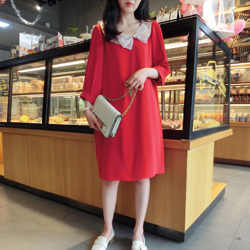 韓版2019春季新款歐根紗蝴蝶結雪紡中長款寬松連衣裙女袖子百褶1入