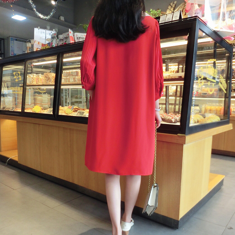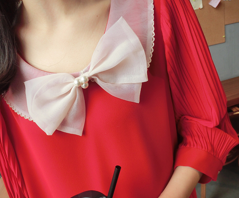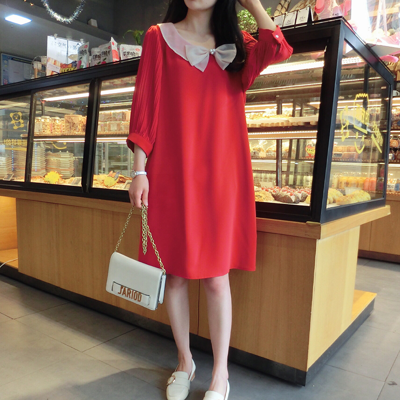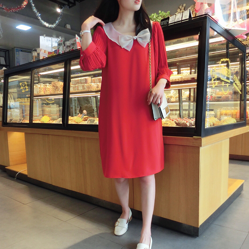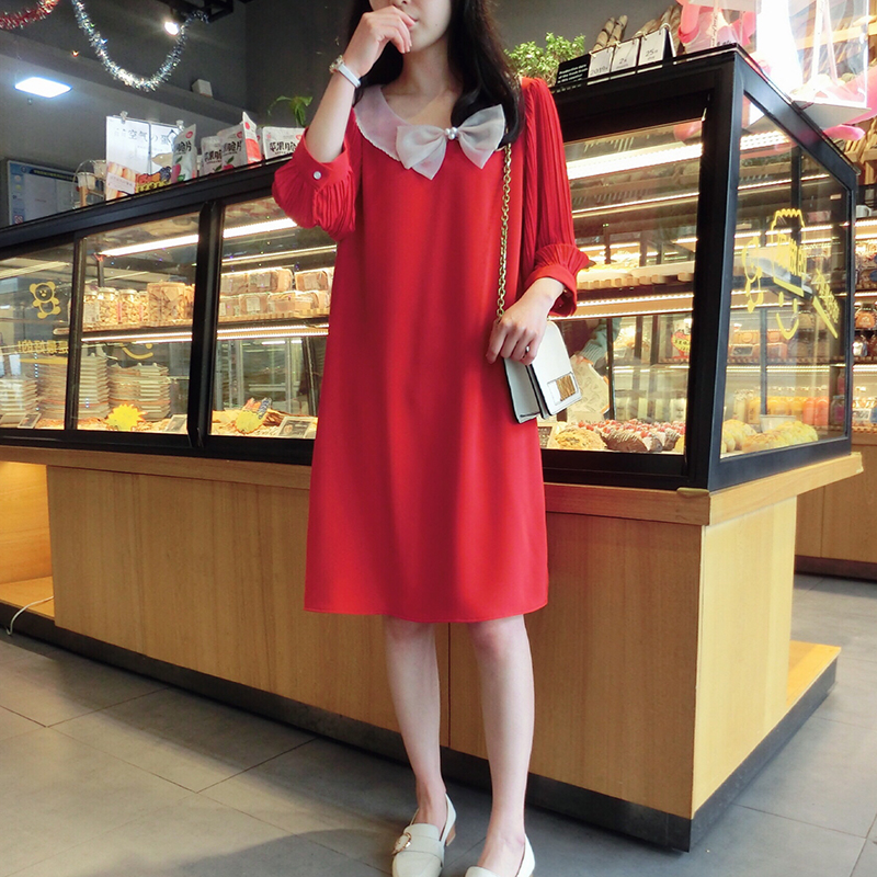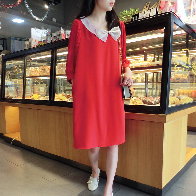 韓版2019春季新款歐根紗蝴蝶結雪紡中長款寬松連衣裙女袖子百褶1入