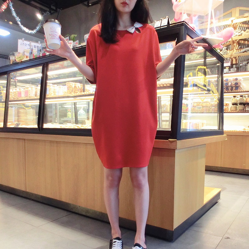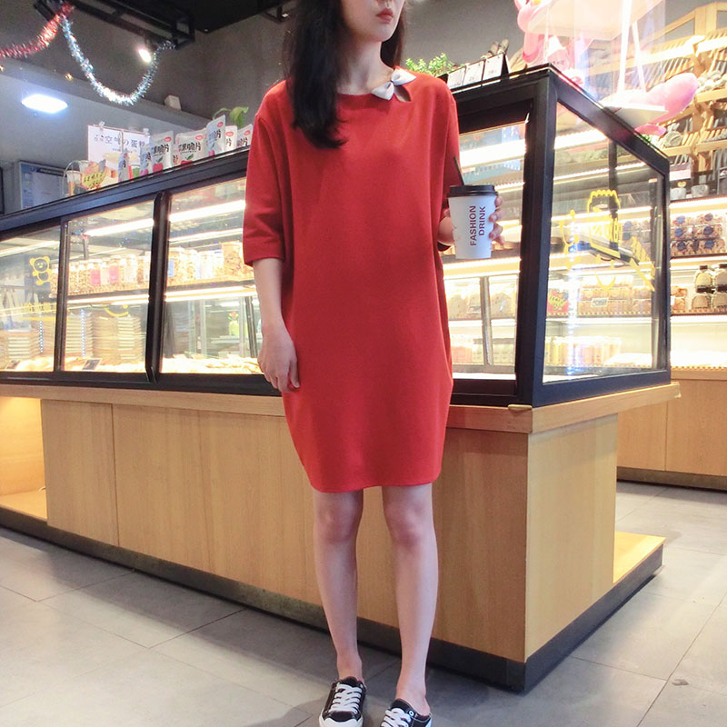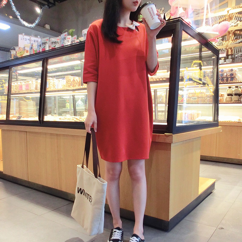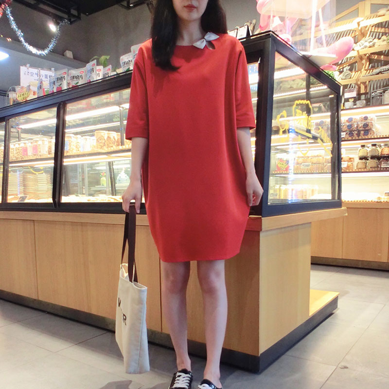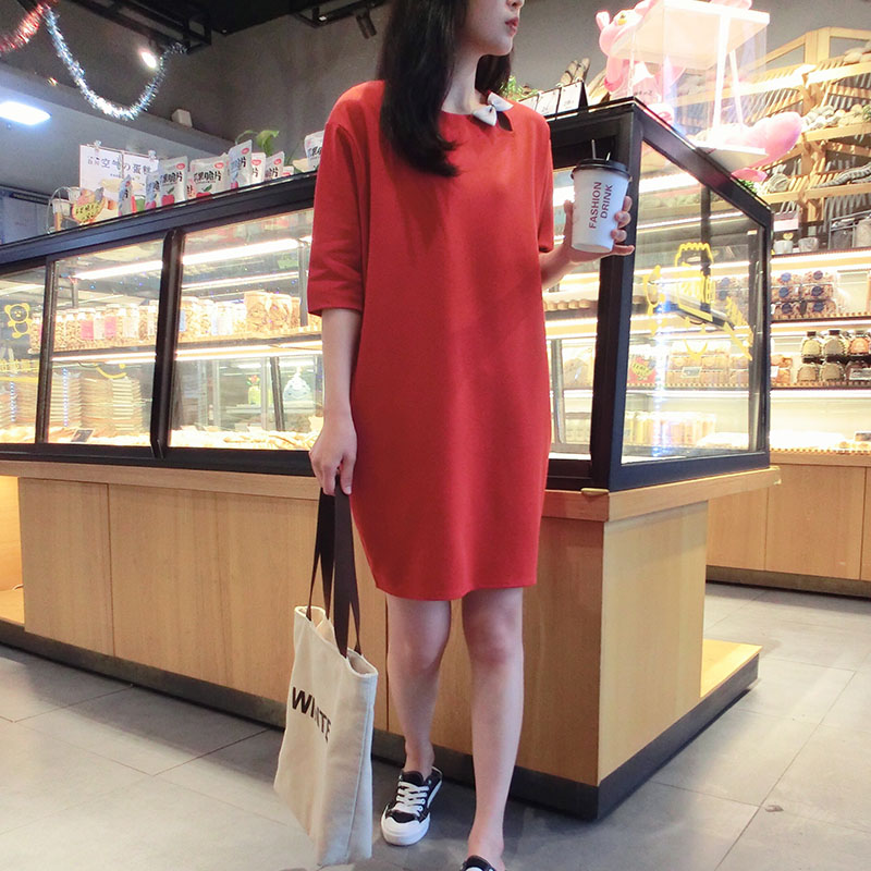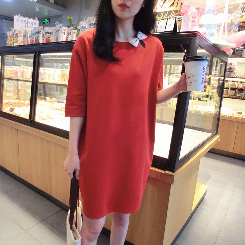 2019韓版新春夏連衣裙女經典圓領蝴蝶結寬松顯瘦繭型中長款學院風1入