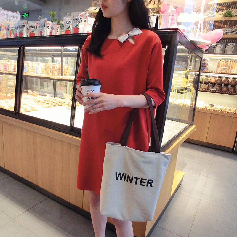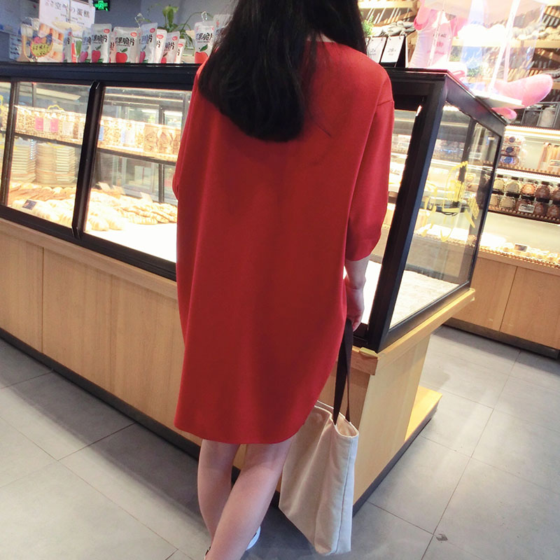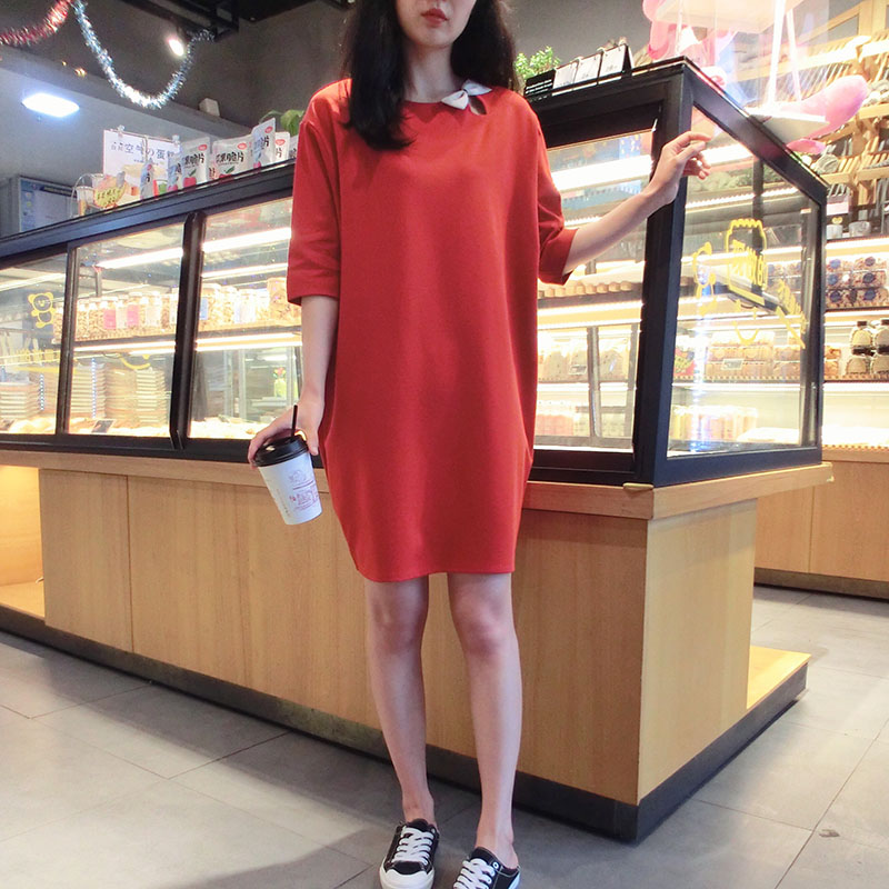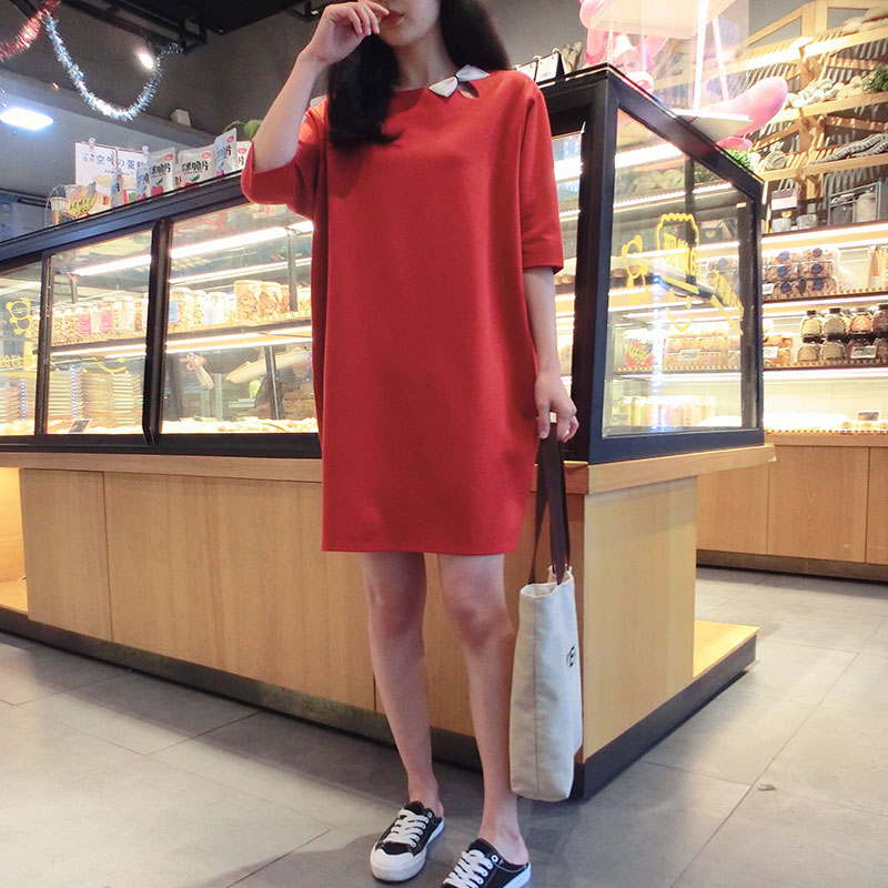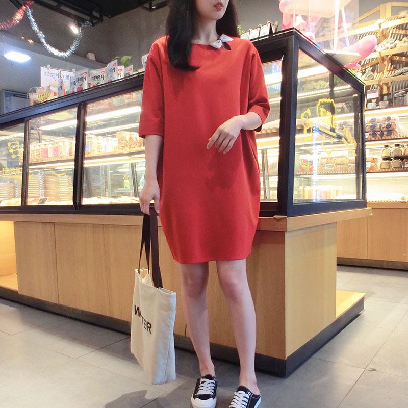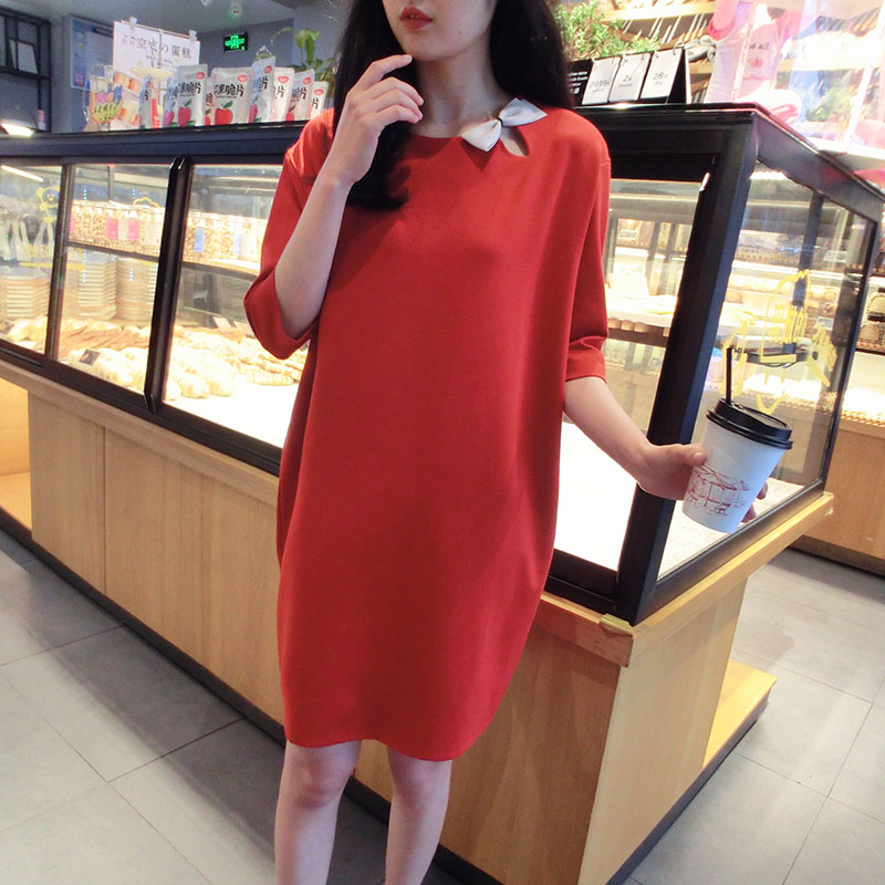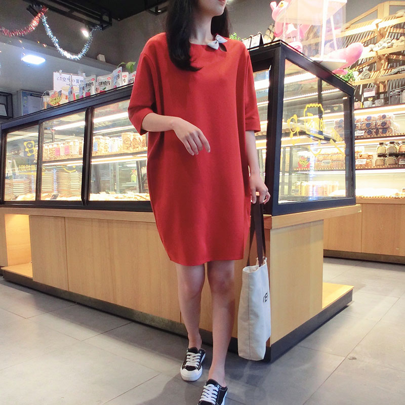 2019韓版新春夏連衣裙女經典圓領蝴蝶結寬松顯瘦繭型中長款學院風1入