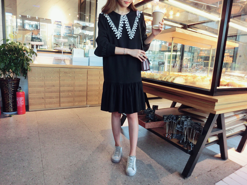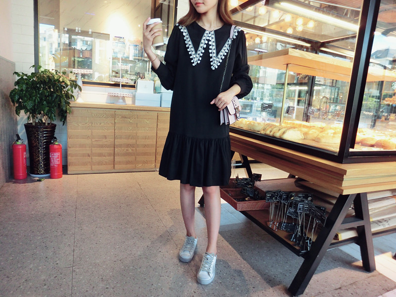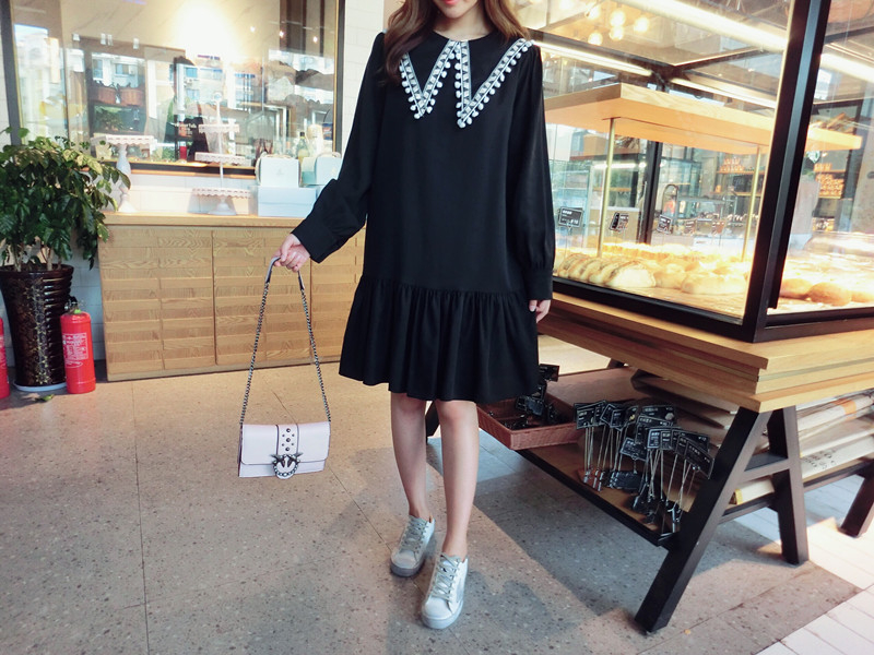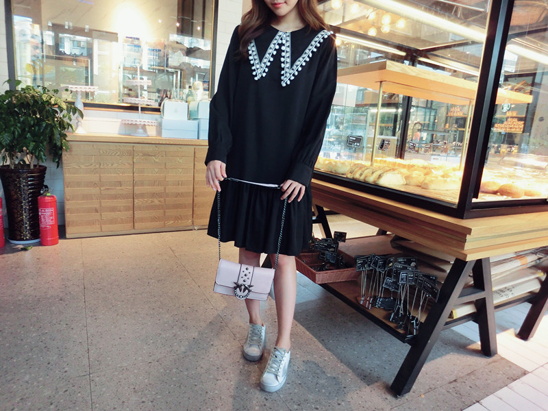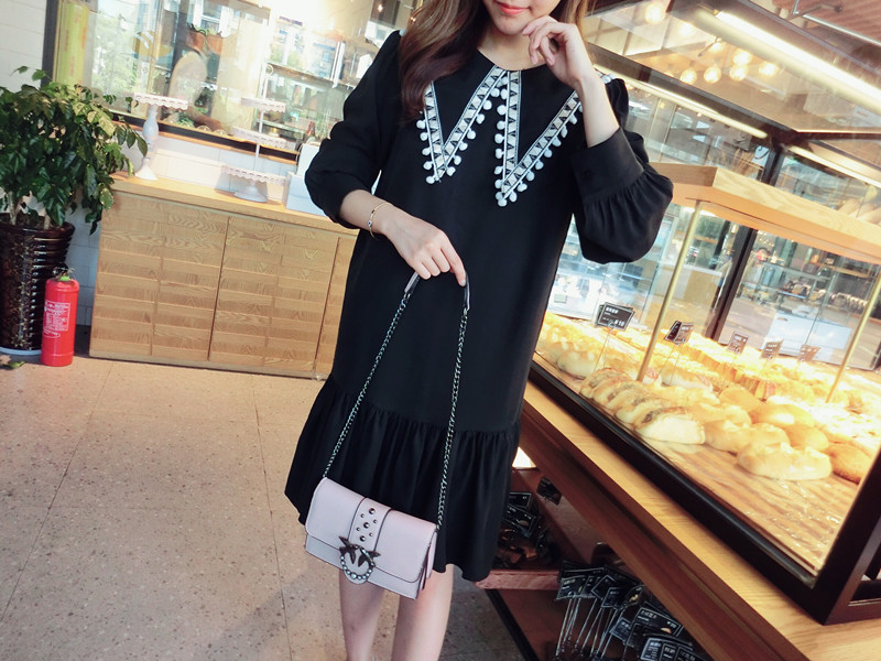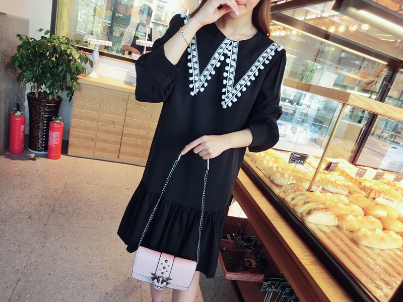 2019秋季新款女裝中長款韓版學院風大三角領流蘇荷葉邊連衣裙1入