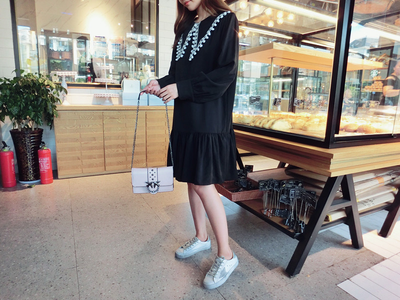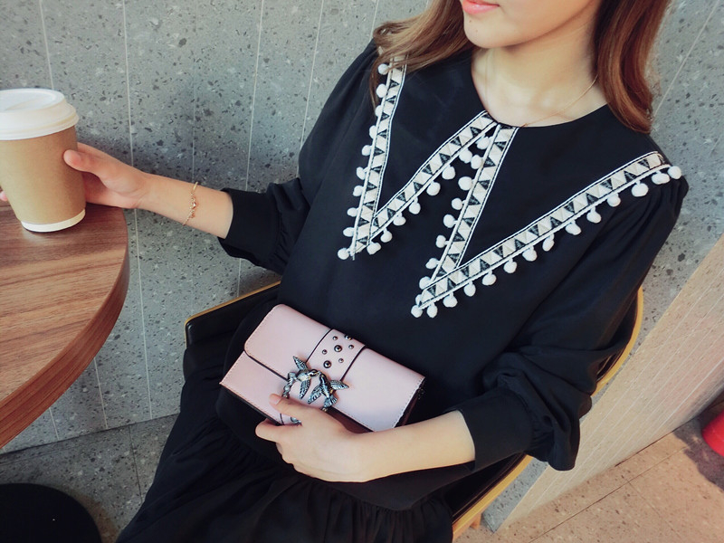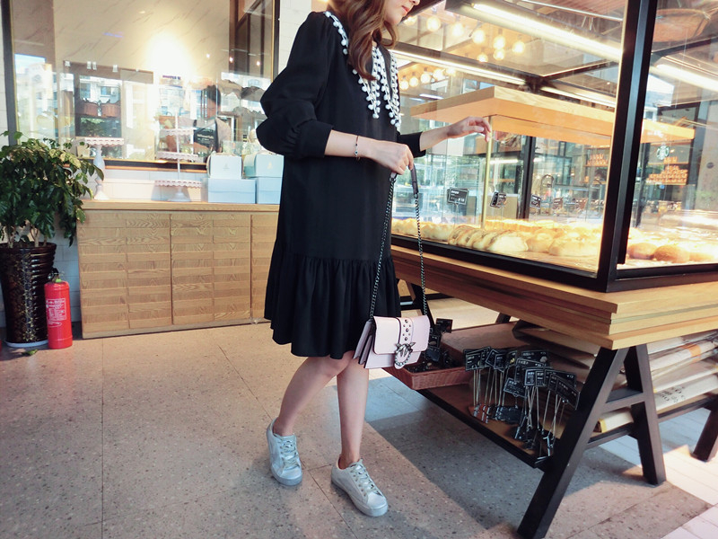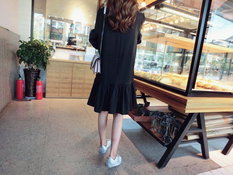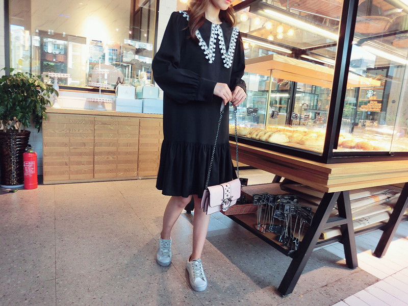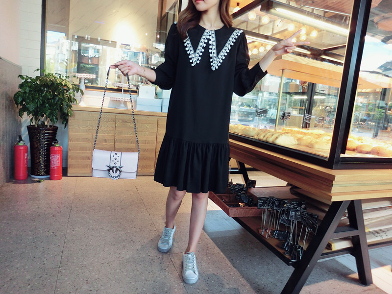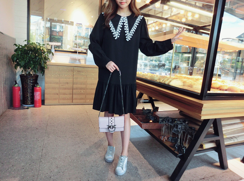 2019秋季新款女裝中長款韓版學院風大三角領流蘇荷葉邊連衣裙1入