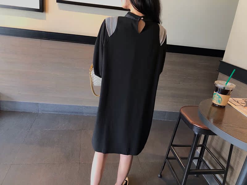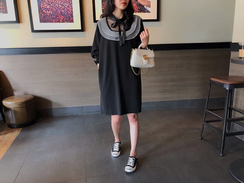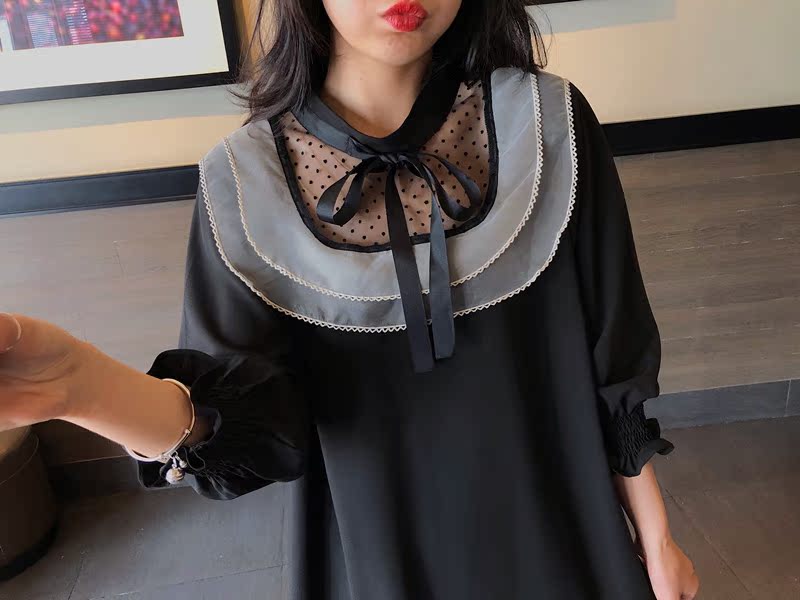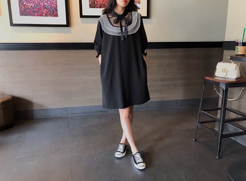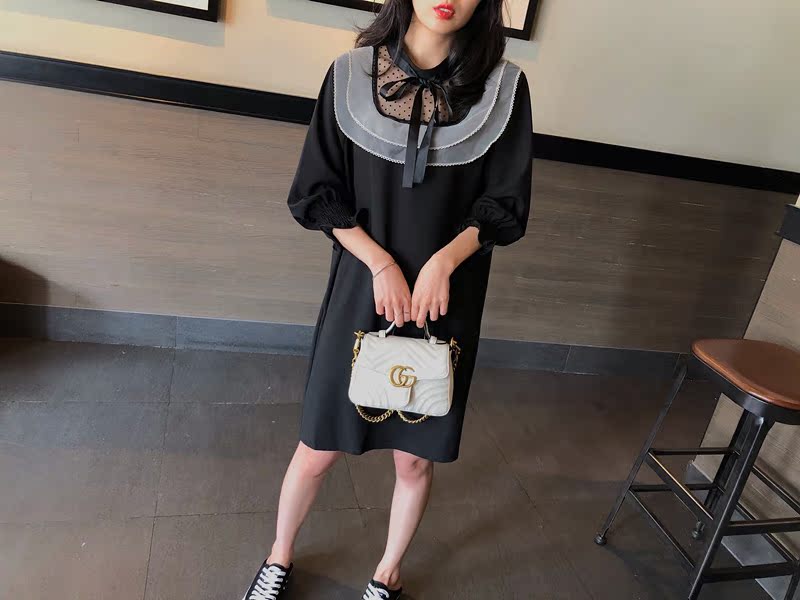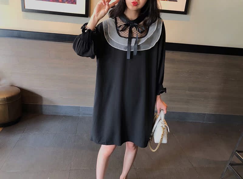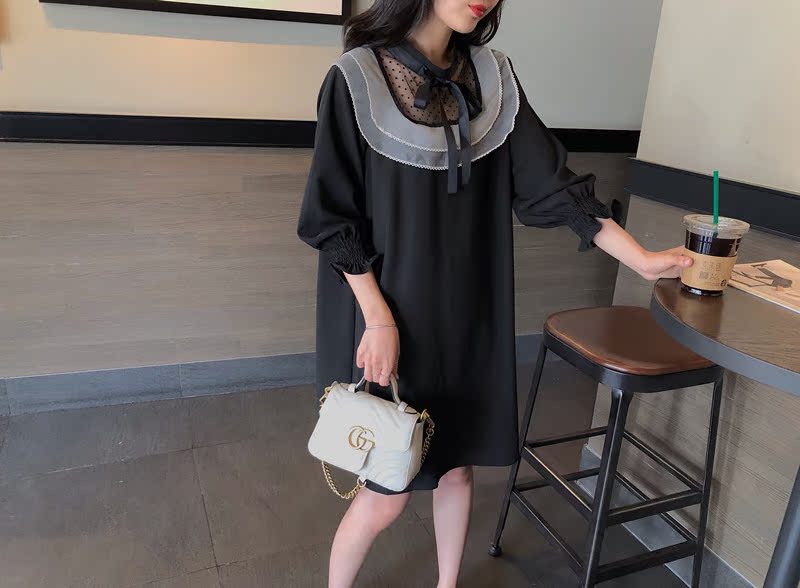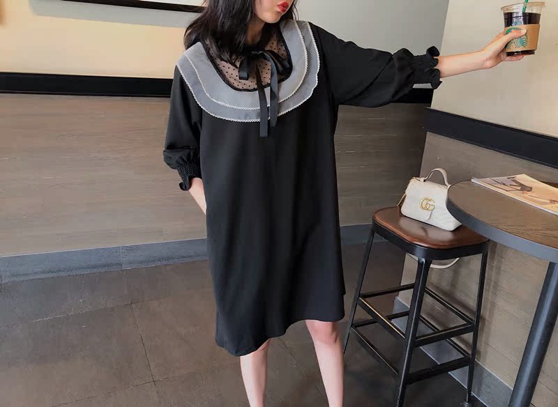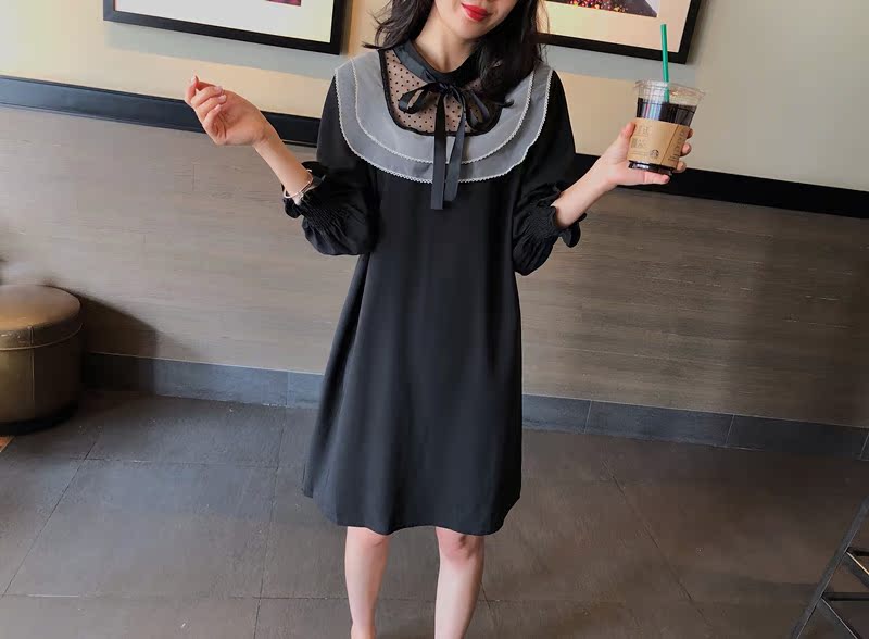 韓國東大門2019秋冬新款荷葉邊寬松中長款韓版系帶打底連衣裙女1入