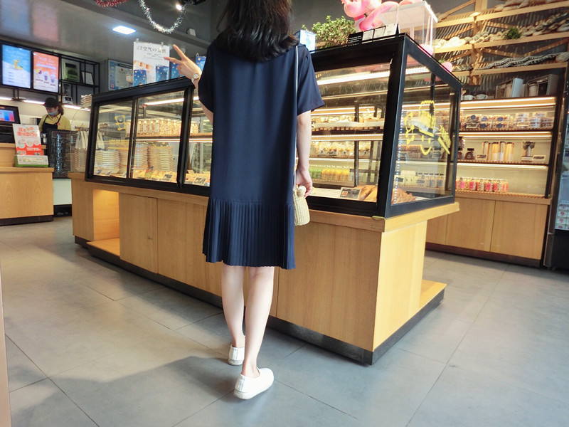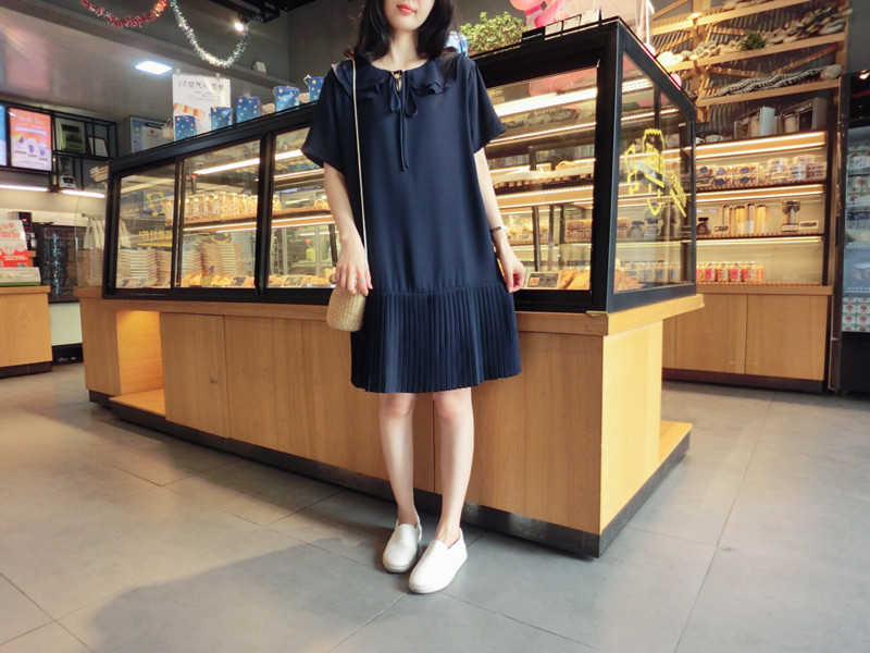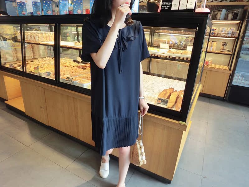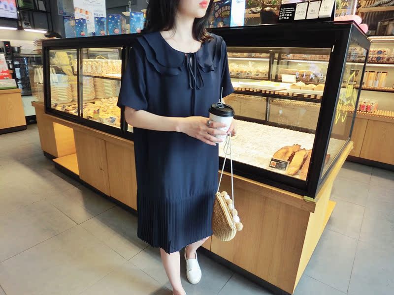 19雙層娃娃領綁帶寬松文藝復古純色雪紡百褶裙擺中長款夏季連衣裙1入