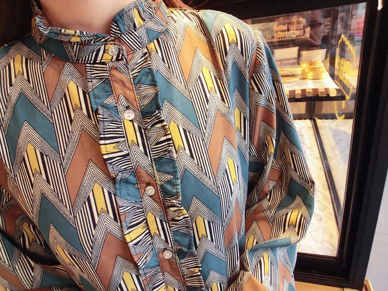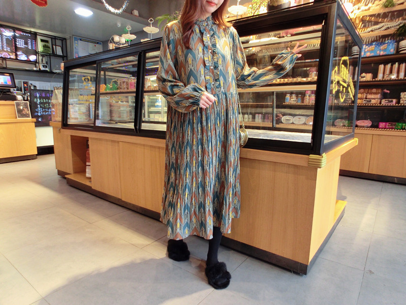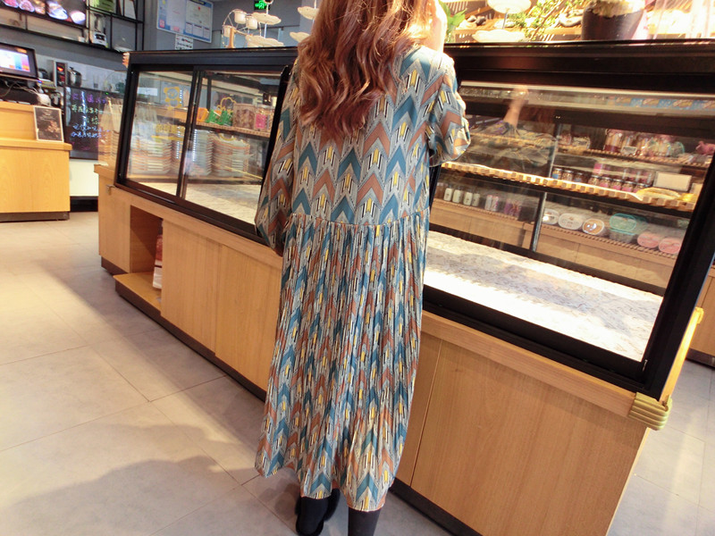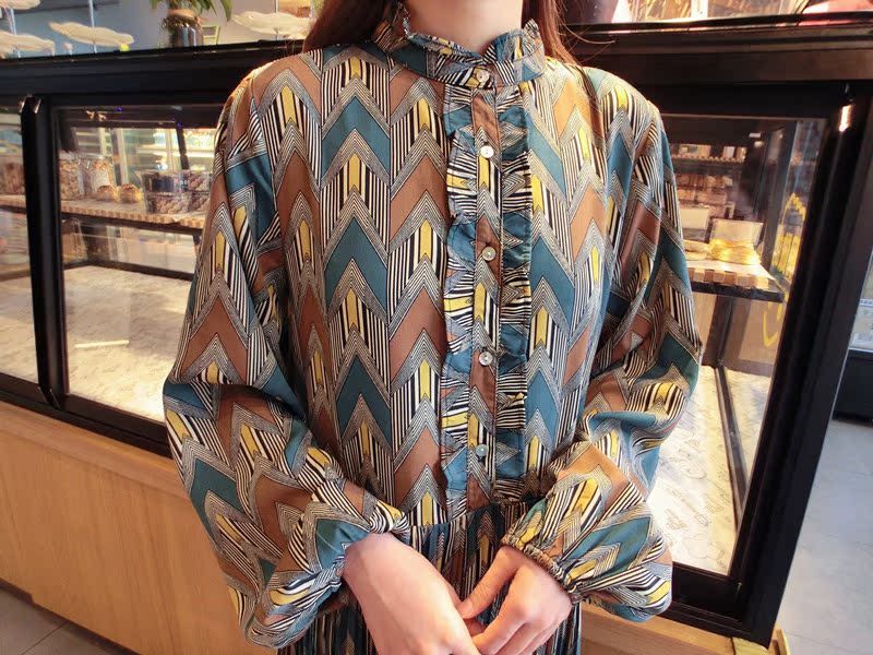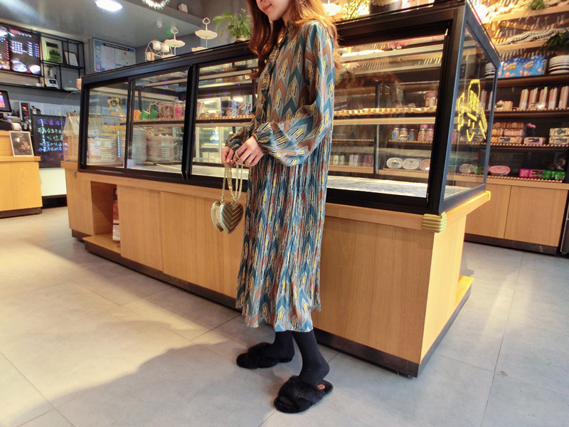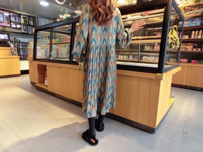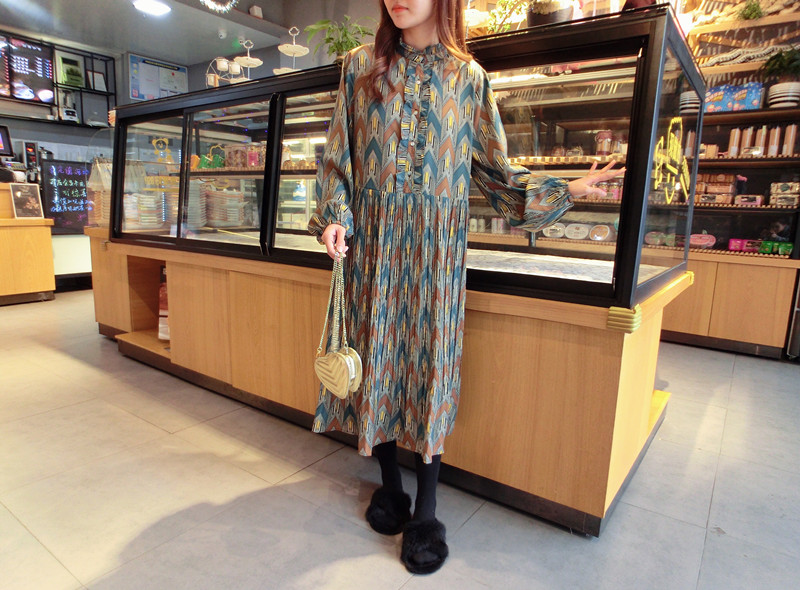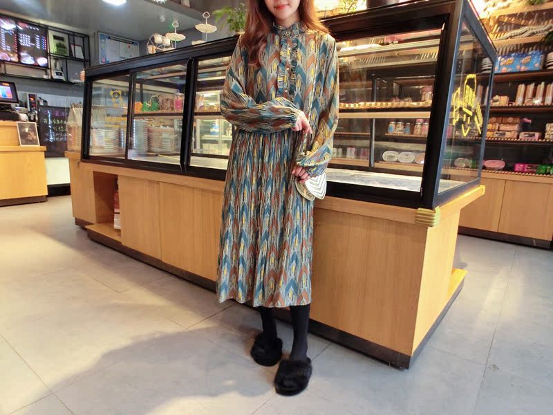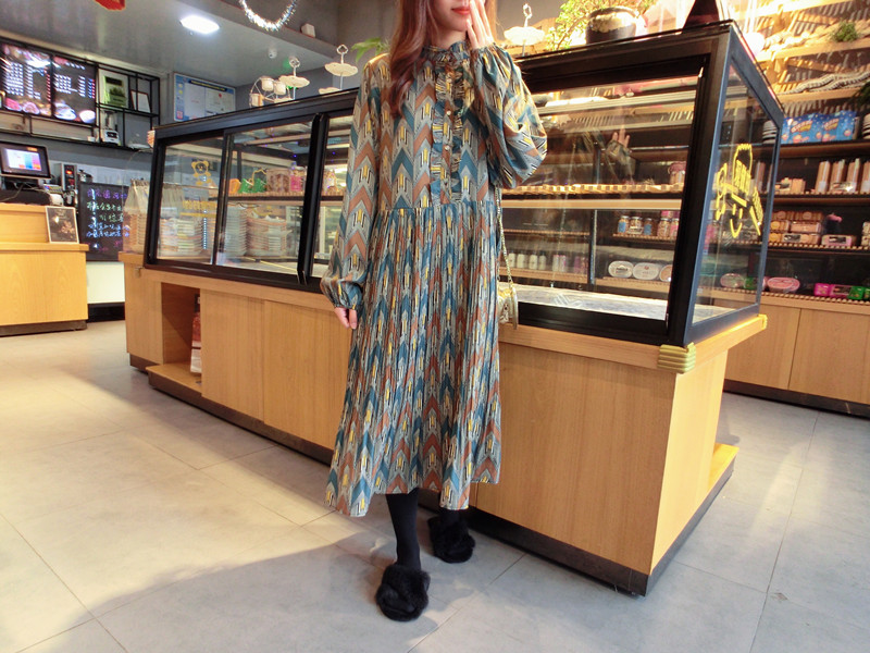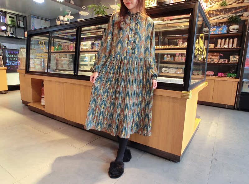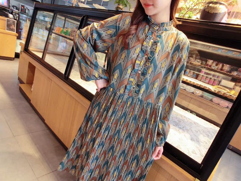 韓版18秋冬新品女裝寬松顯瘦復古碎花立領連衣裙中長款百褶打底裙1入