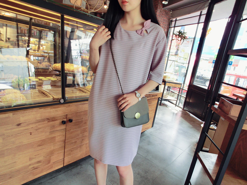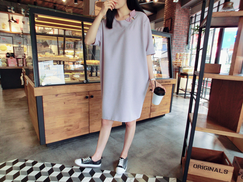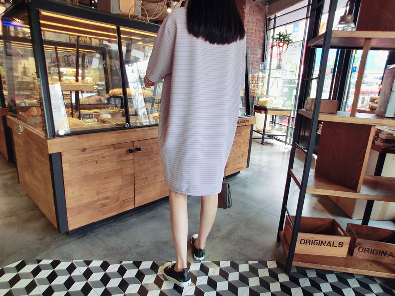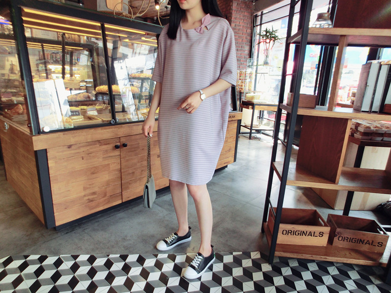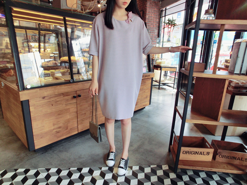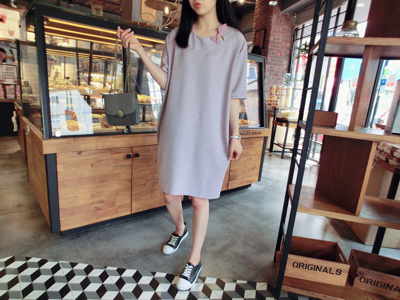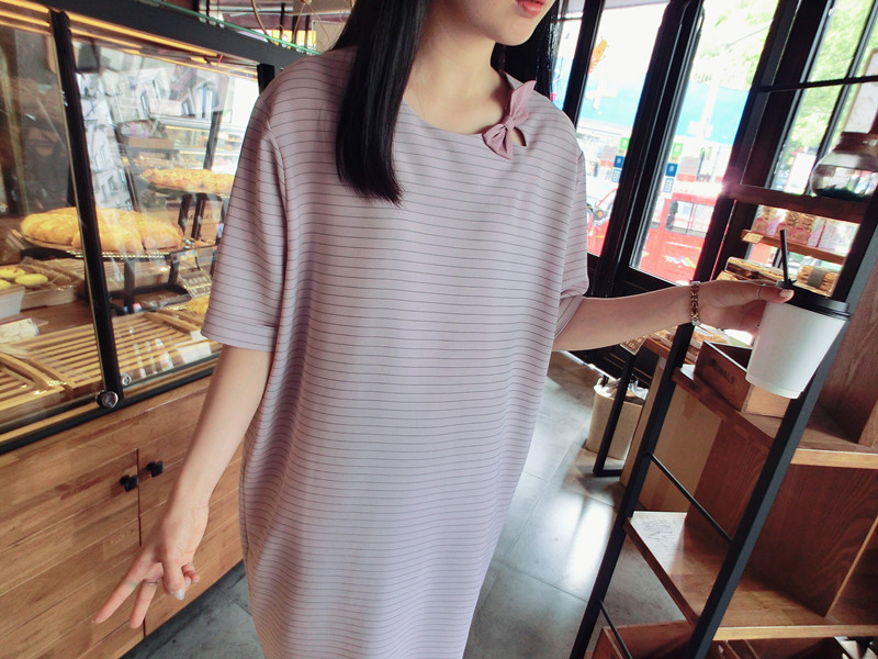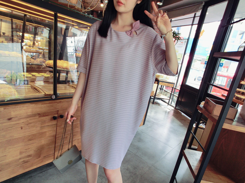 2019春夏新品女裝大碼時尚雪紡裙中長款學院風寬松繭型條紋連衣裙1入