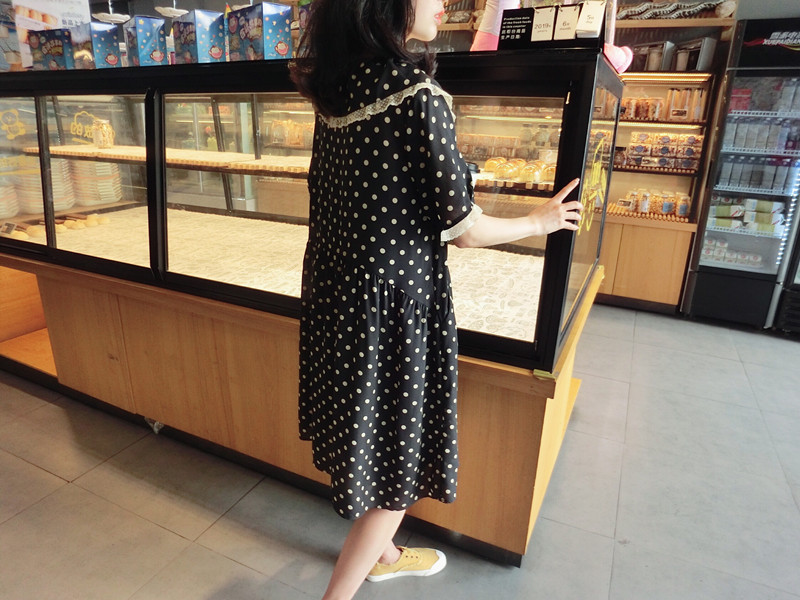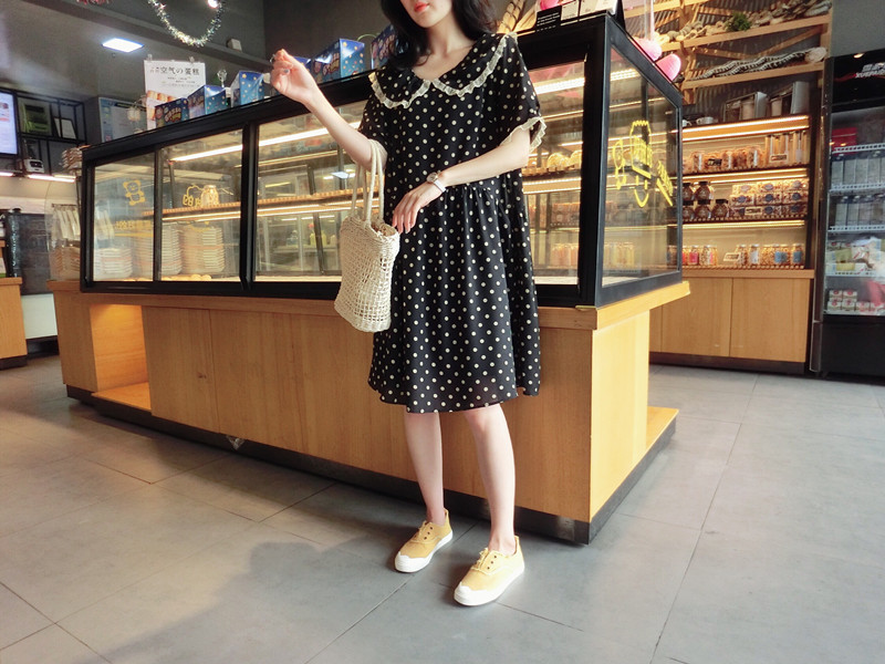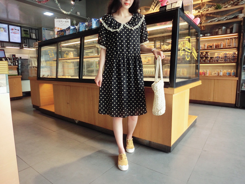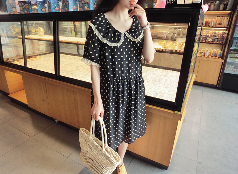 2019夏季新款復古小眾設計感娃娃領蕾絲邊波點連衣裙甜美減齡1入
