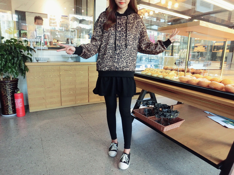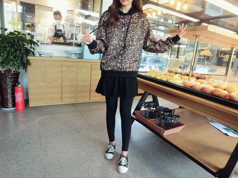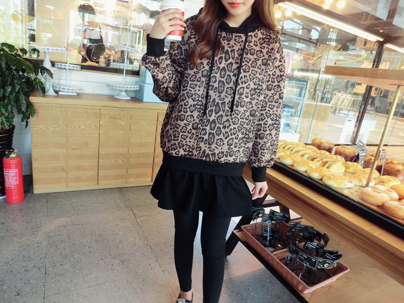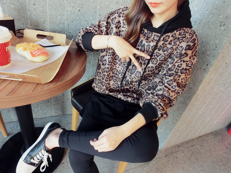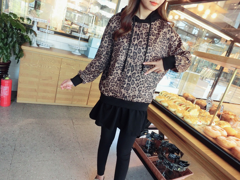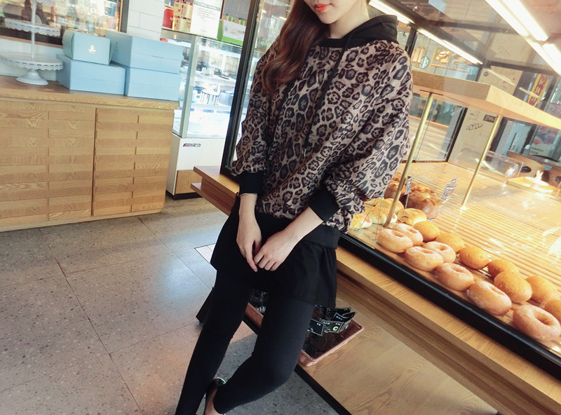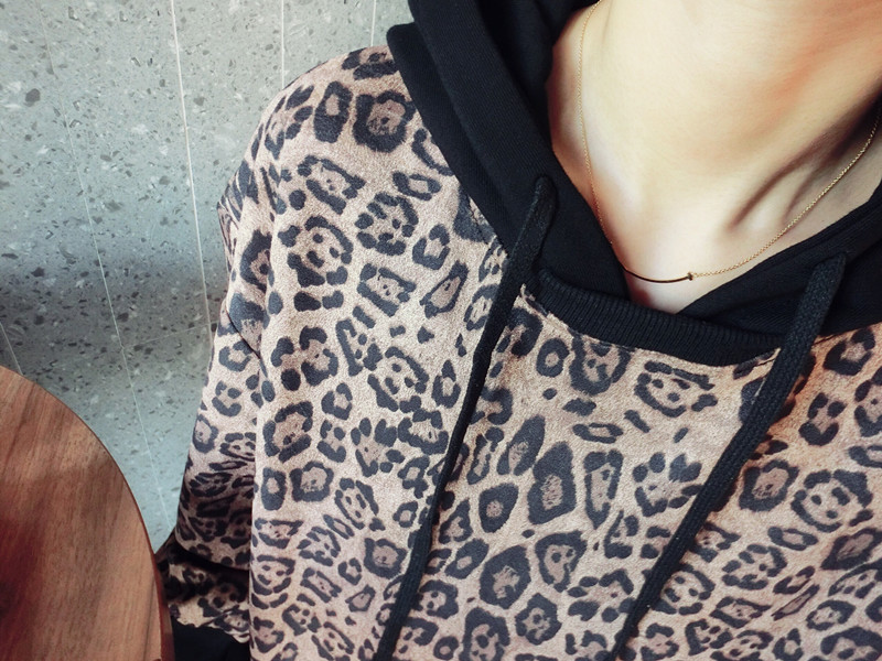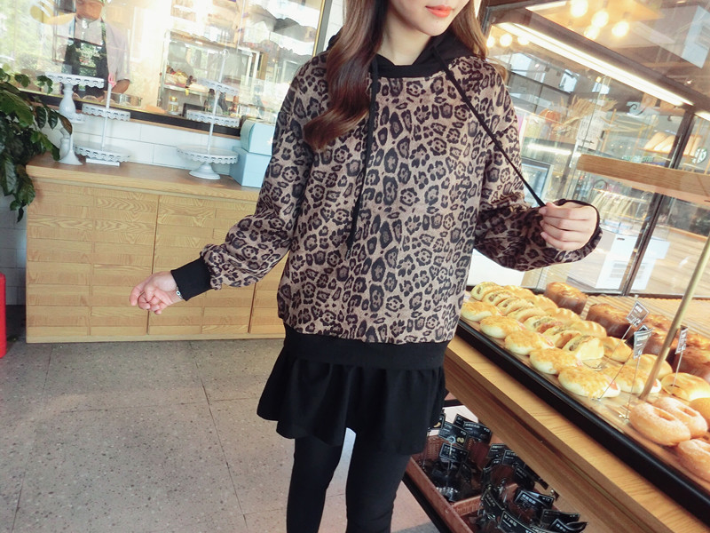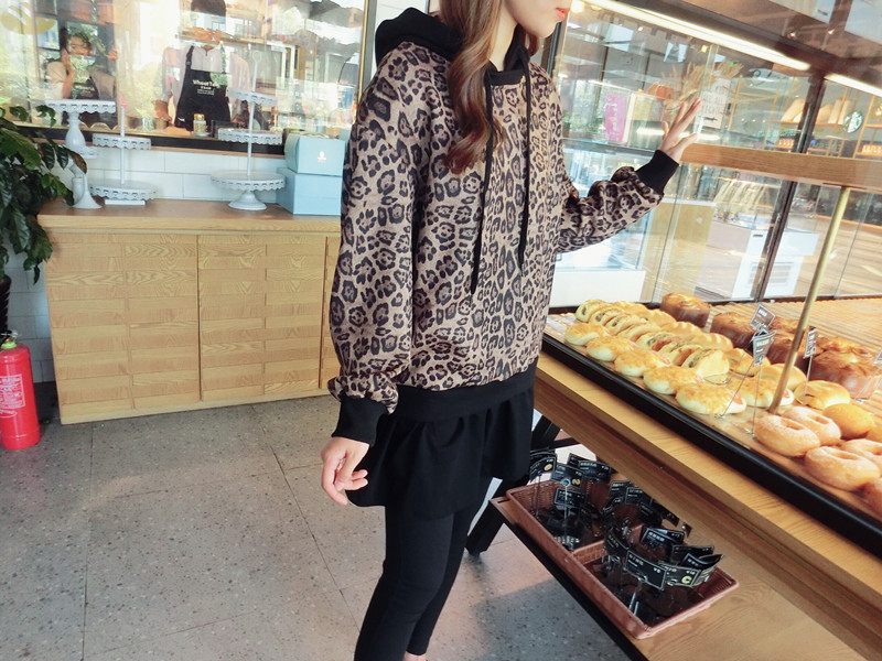 豹紋假兩件連帽女寬松衛衣2019秋季新款韓版氣質女中長款上衣潮流1入