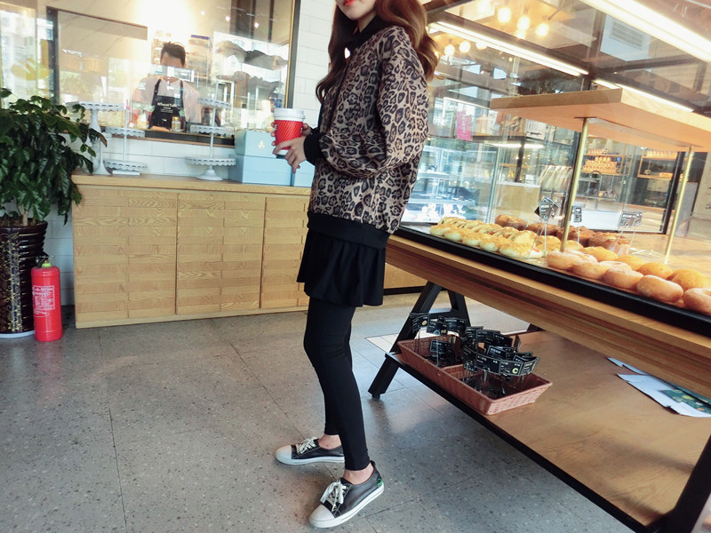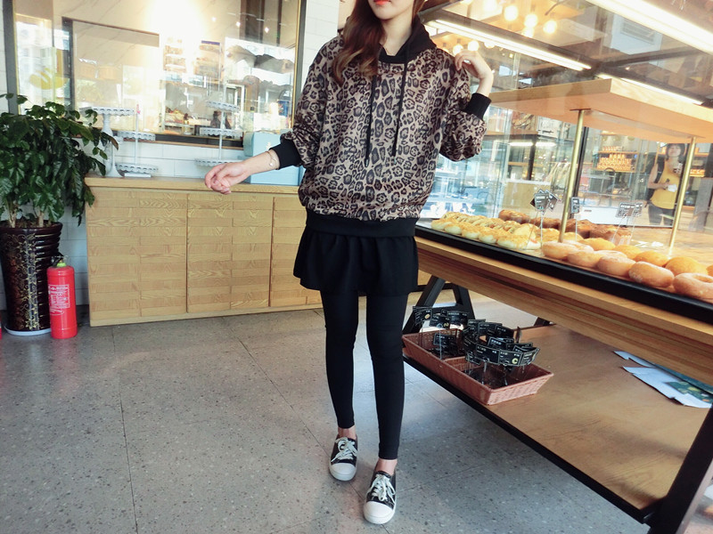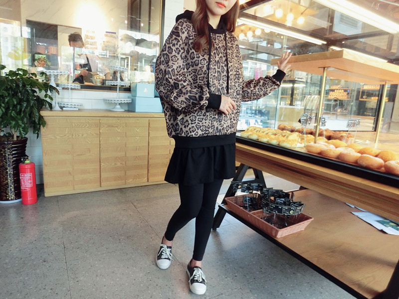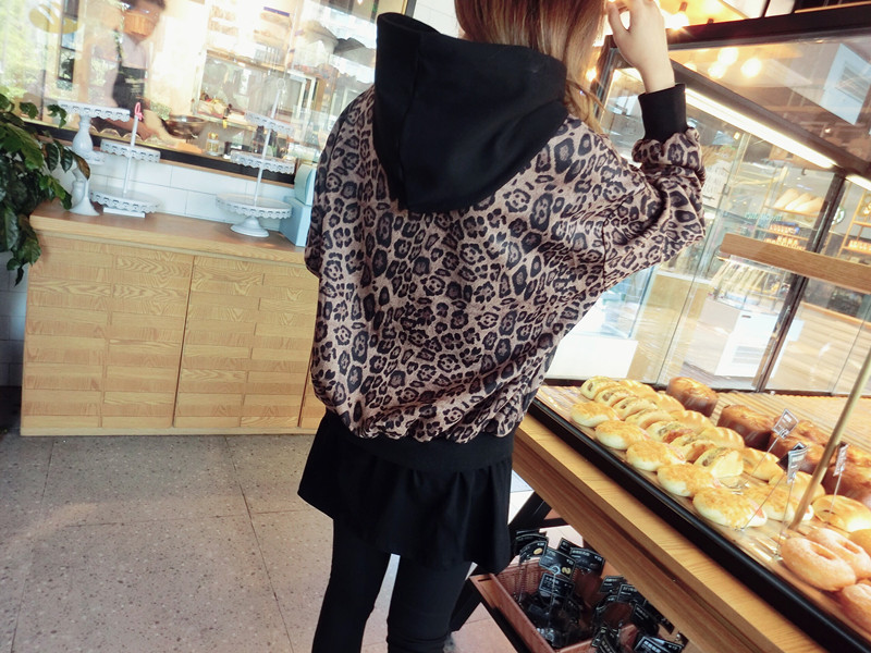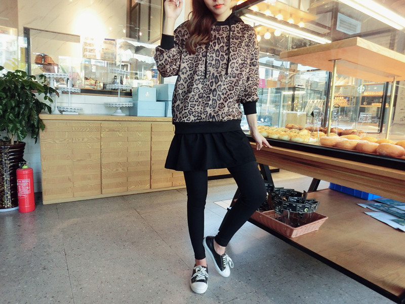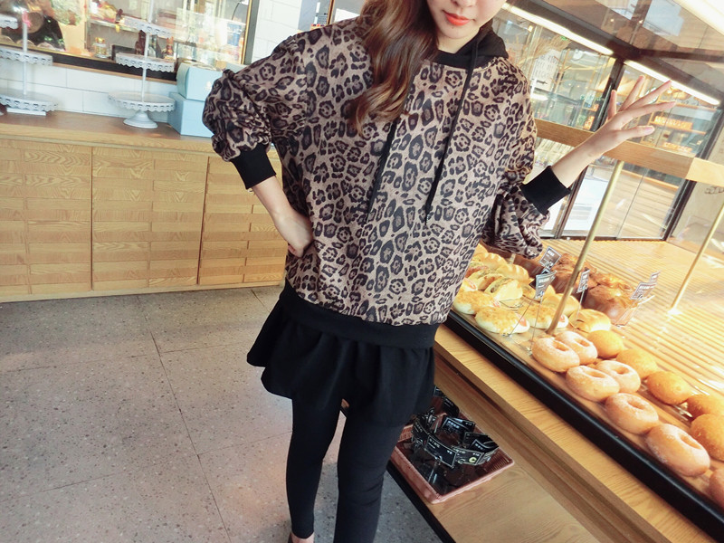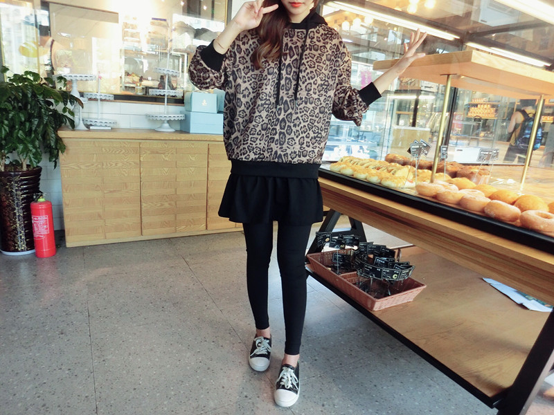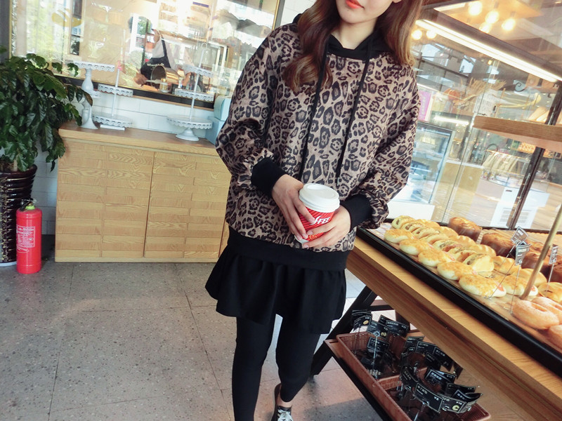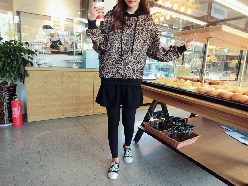 豹紋假兩件連帽女寬松衛衣2019秋季新款韓版氣質女中長款上衣潮流1入