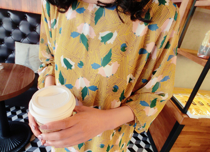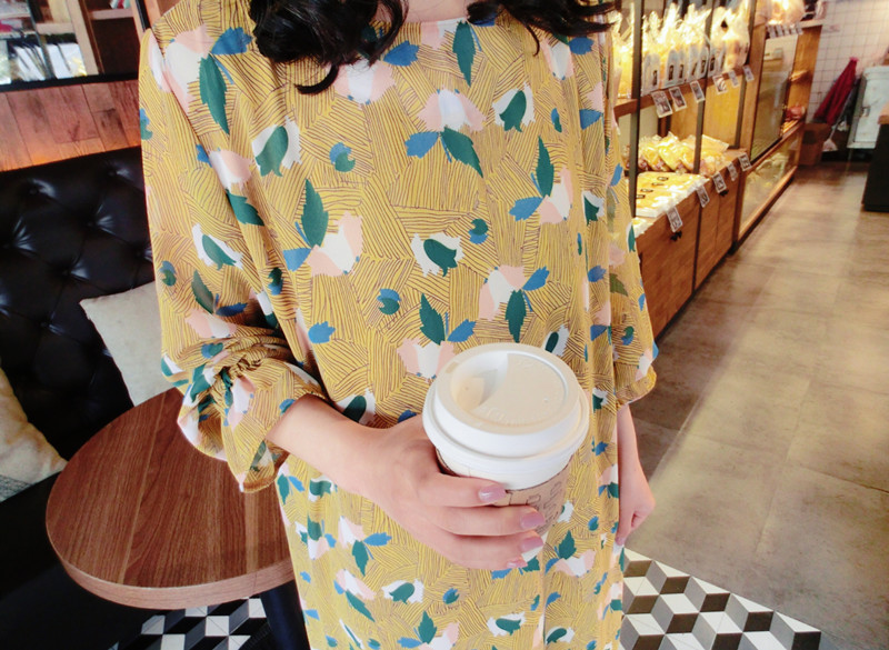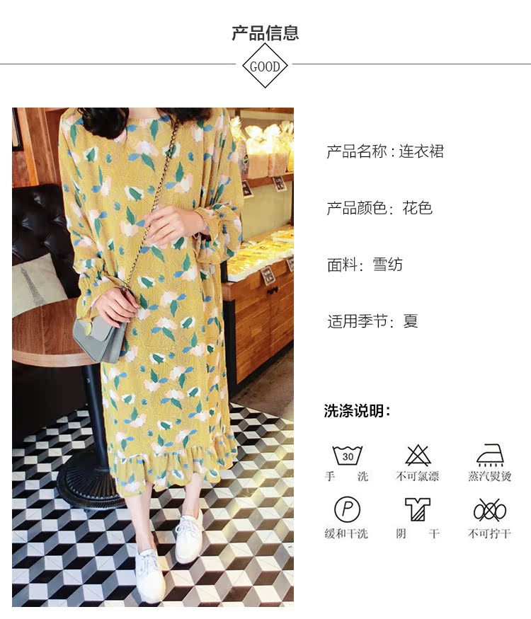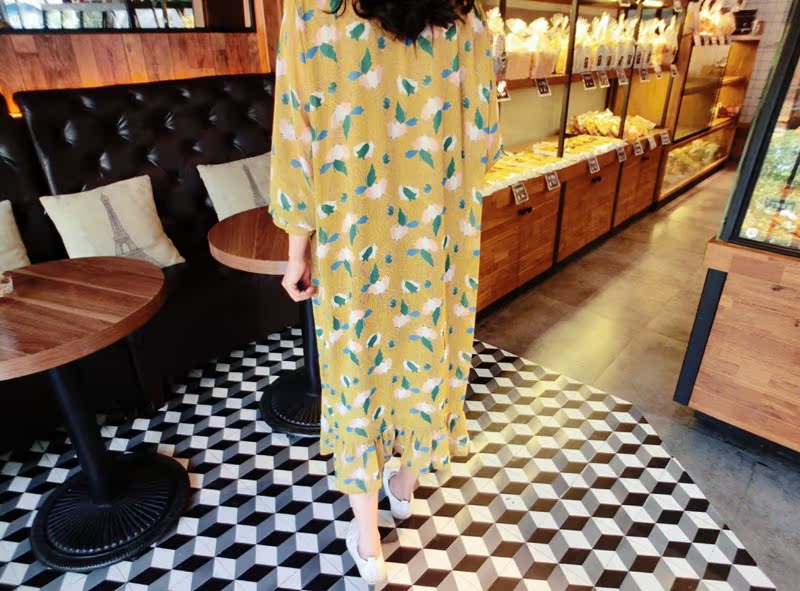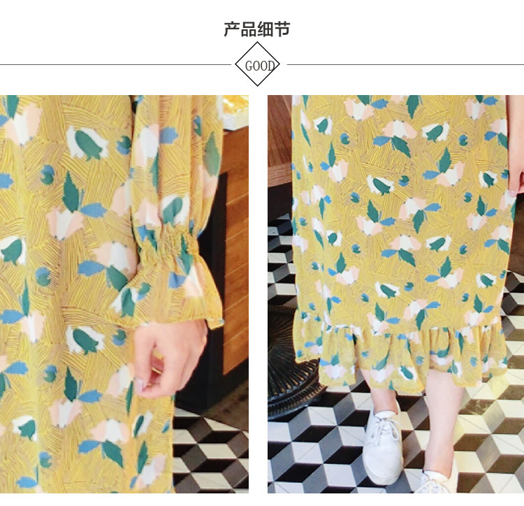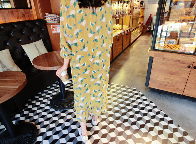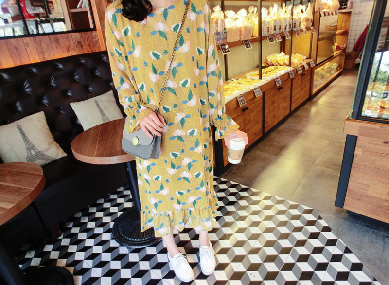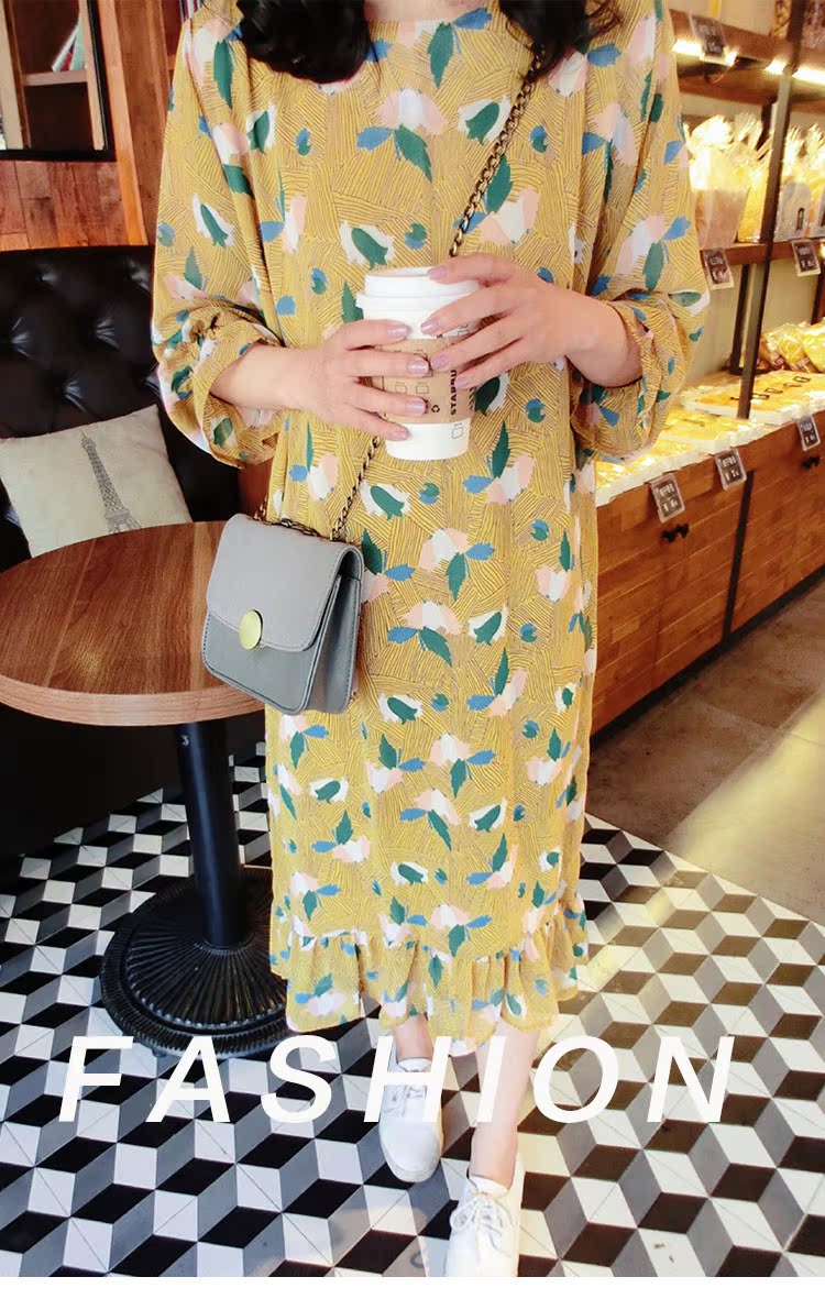2018韓國春裝新款碎花連衣裙女雪紡喇叭袖魚尾裙荷葉邊春秋a字裙1入
