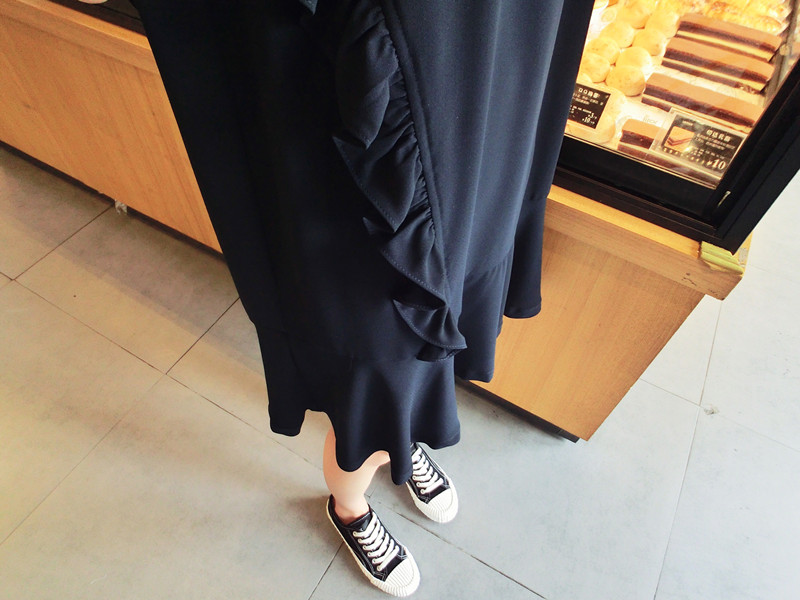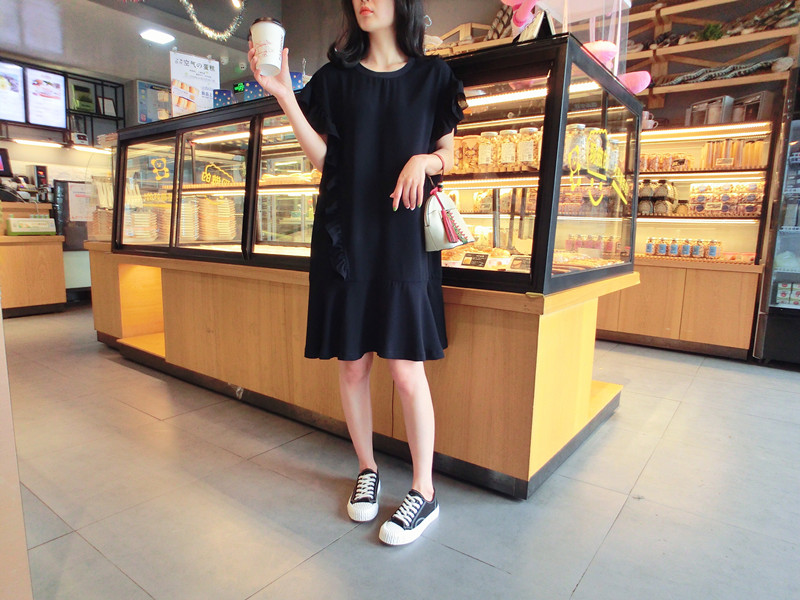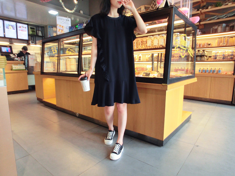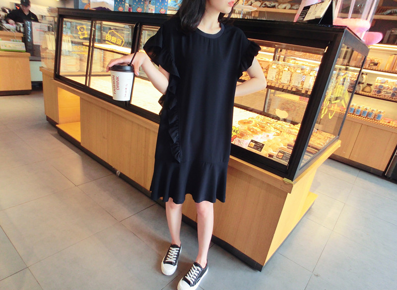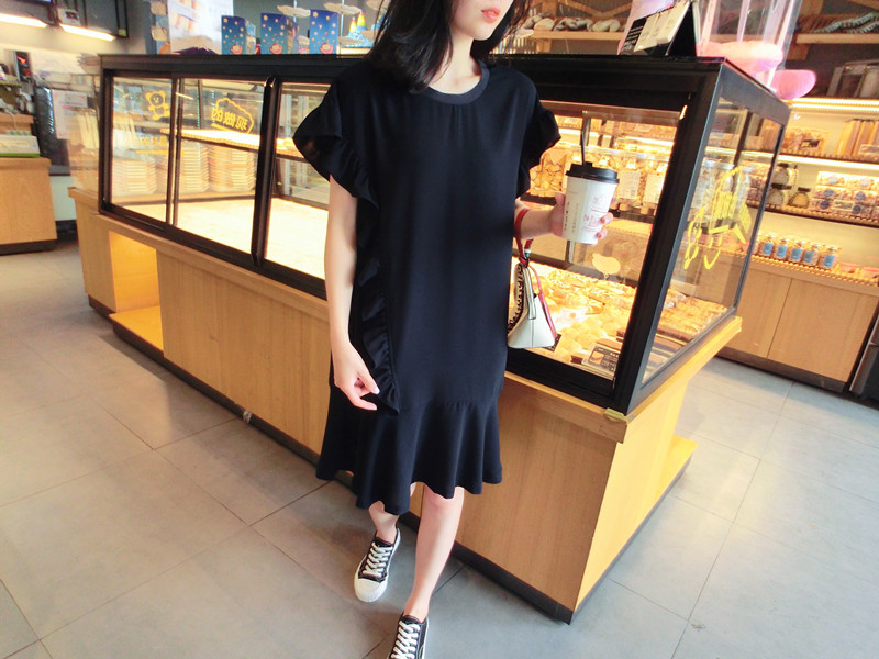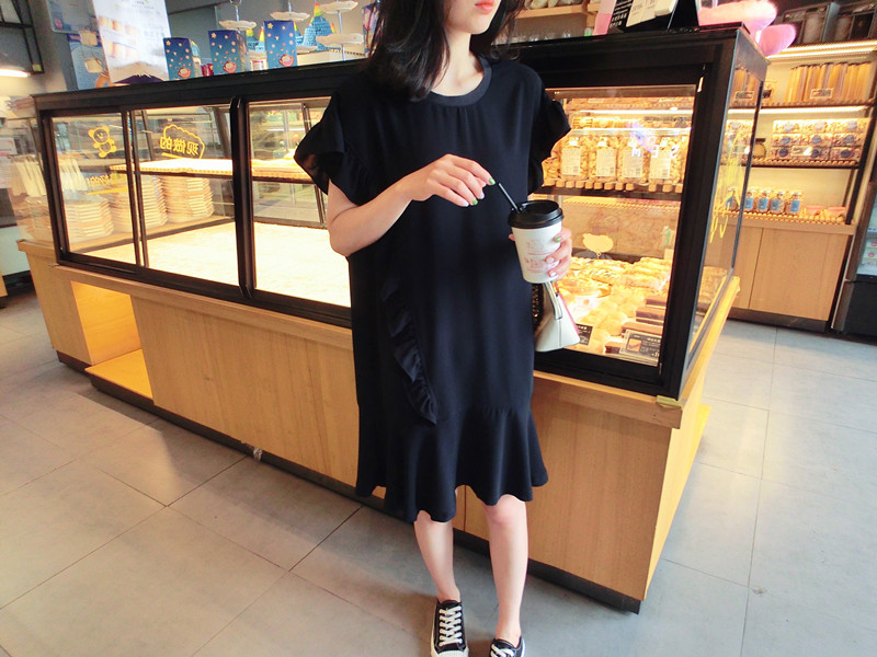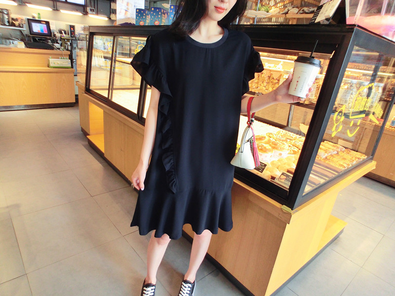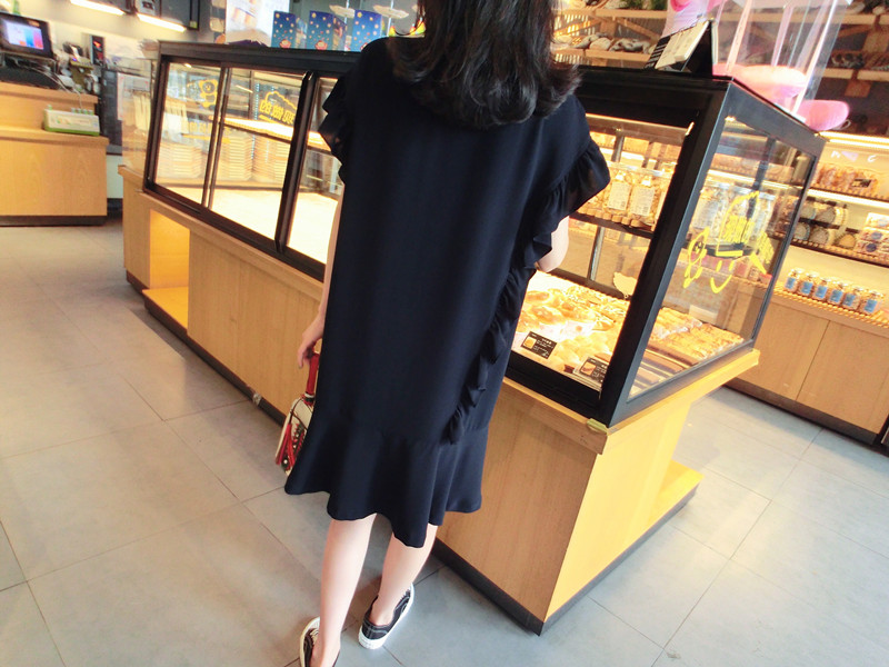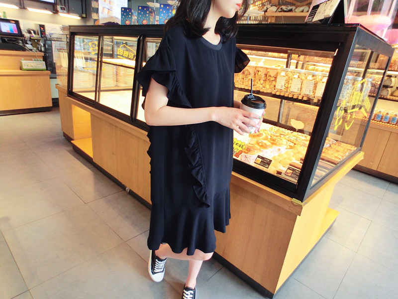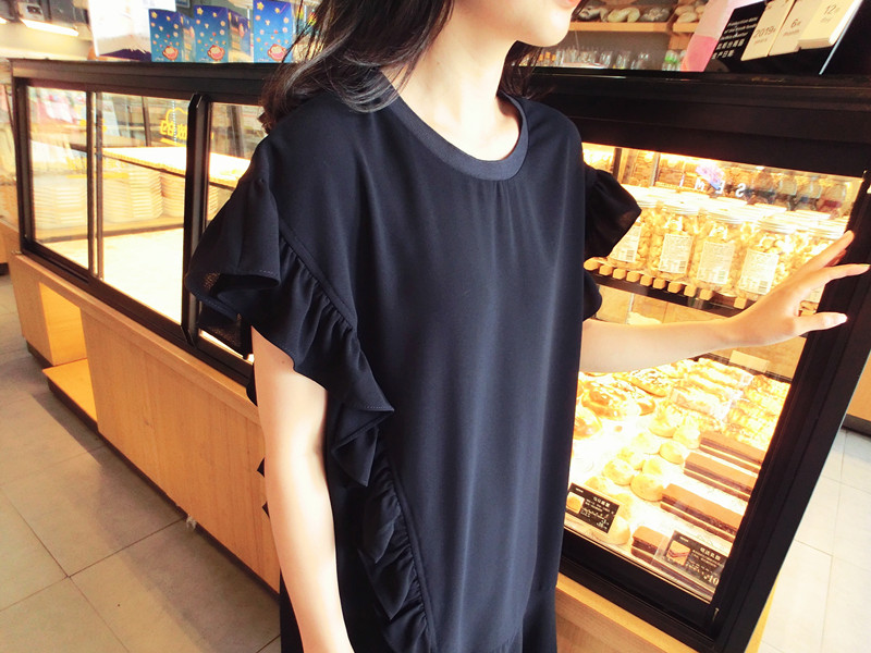 2019夏季新品荷葉邊甜美百搭純色韓版荷葉袖短袖雪紡連衣裙女1入