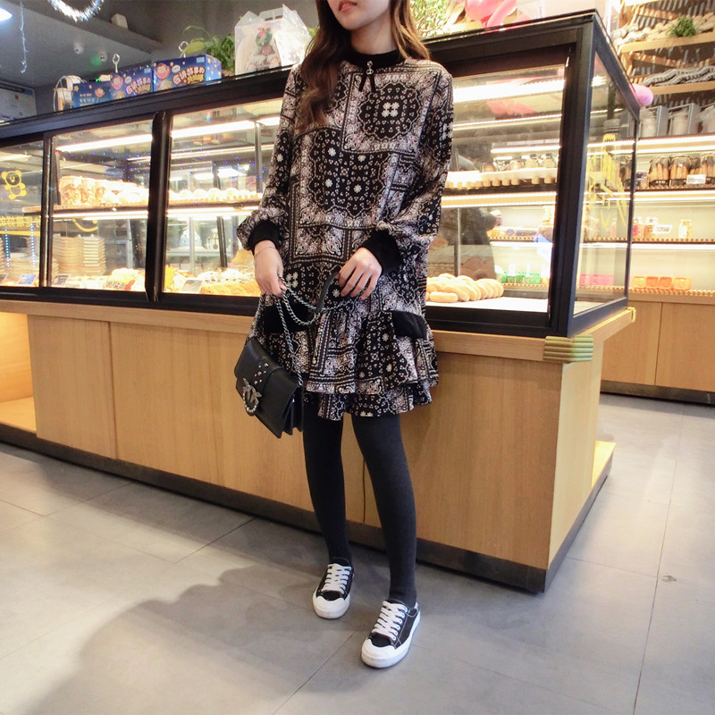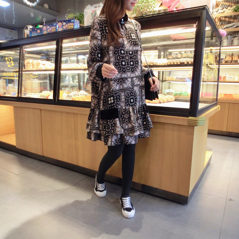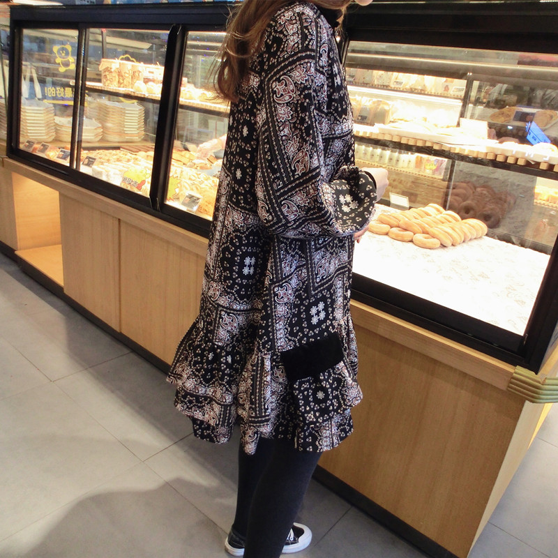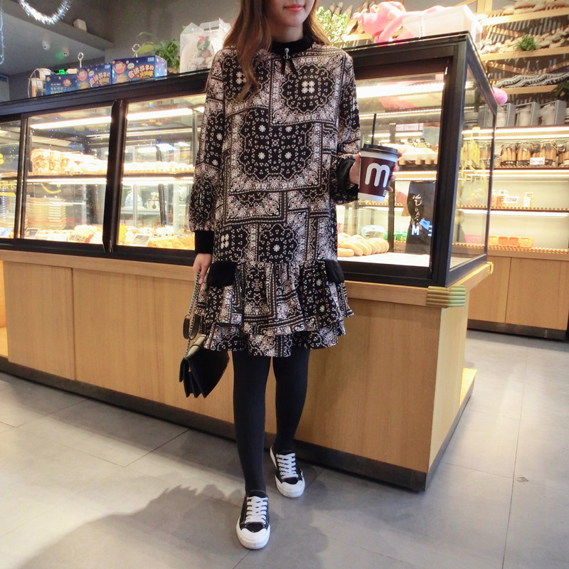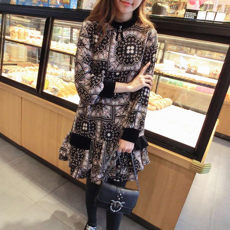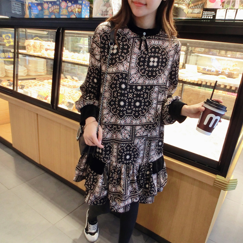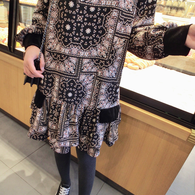 2019春季新款女裝復古風 格子印花 撞色中長款韓版碎花連衣裙1入