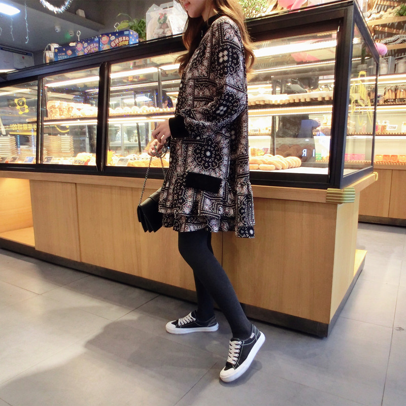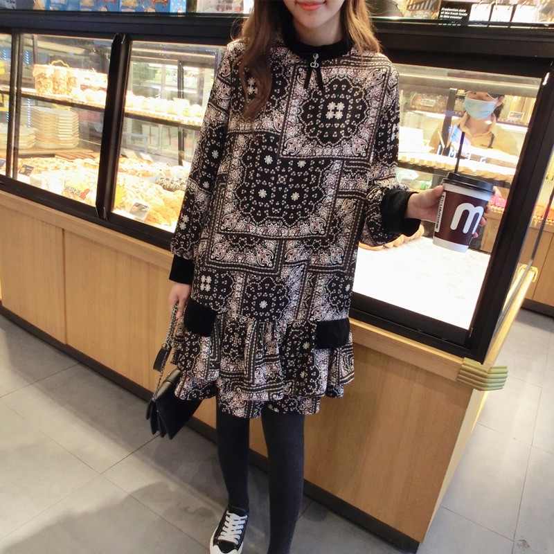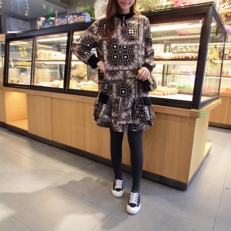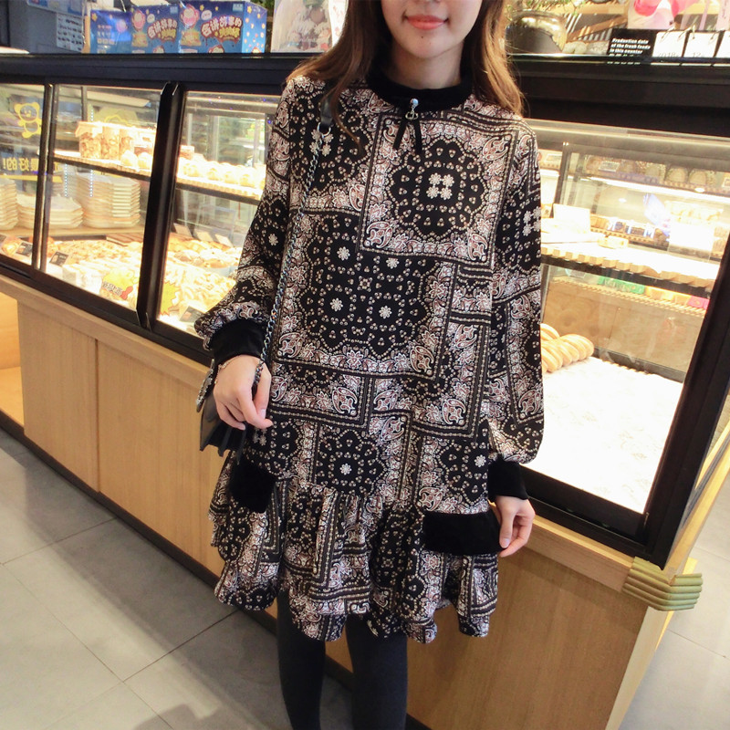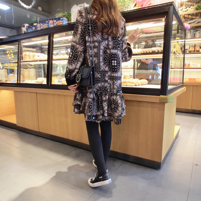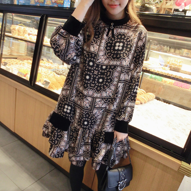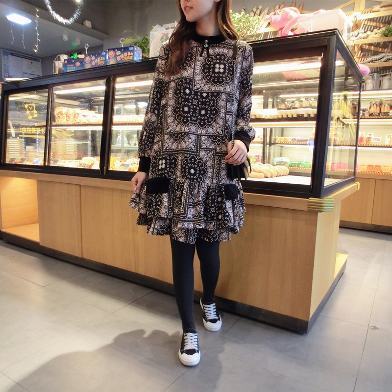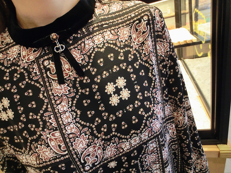 2019春季新款女裝復古風 格子印花 撞色中長款韓版碎花連衣裙1入