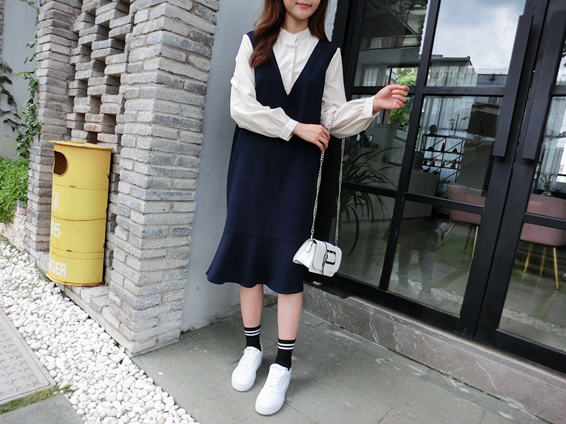 2018秋季新款拼接襯衣假兩件荷葉邊裙中長春秋韓版時尚連衣裙1入