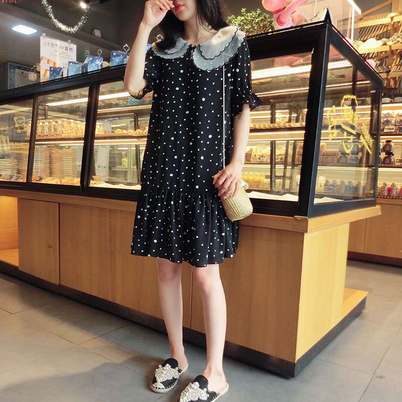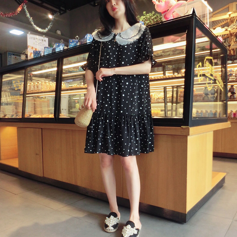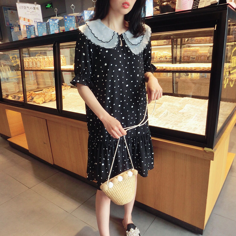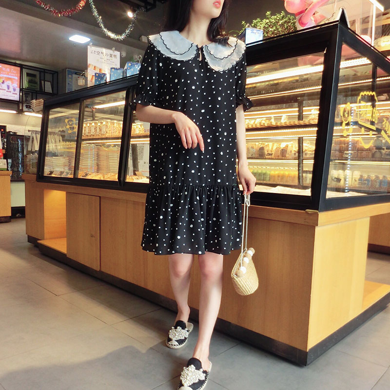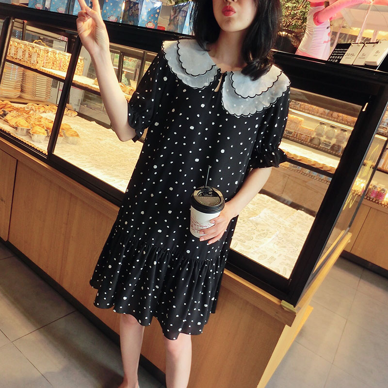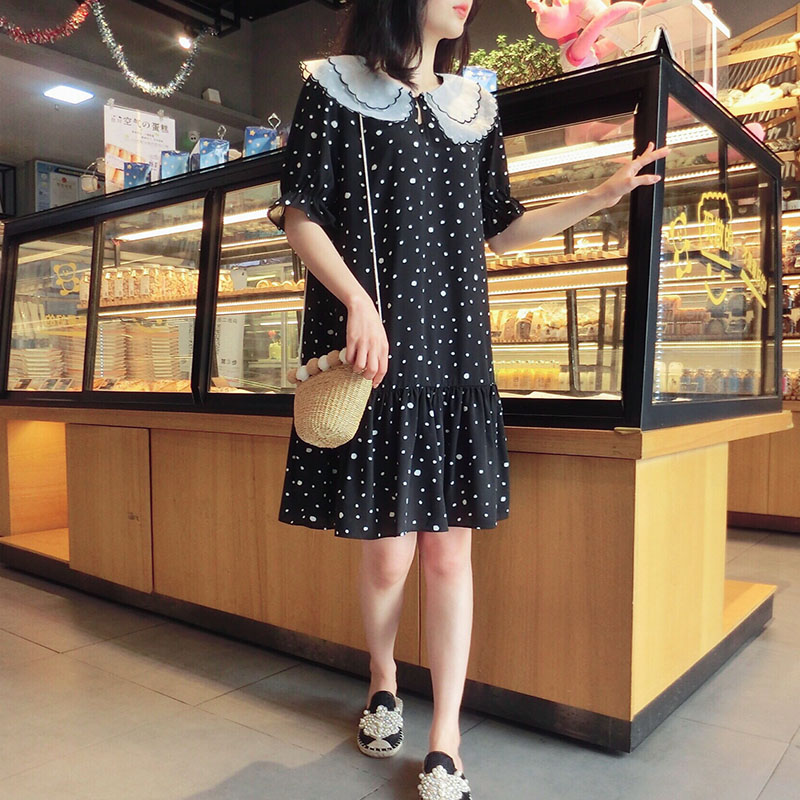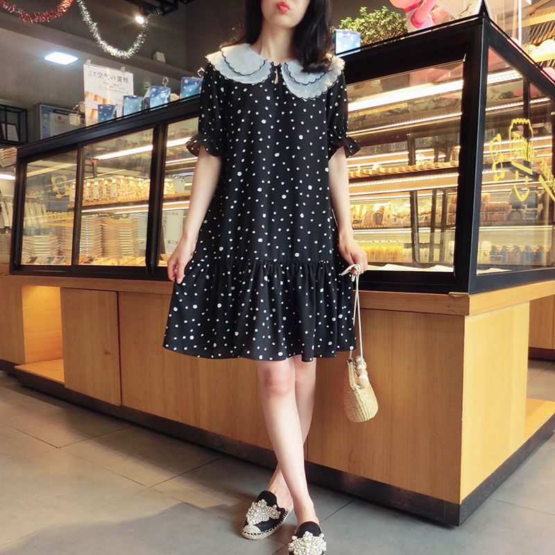 韓版2019夏季新款學院風女氣質波點裙子寬松顯瘦雪紡娃娃領連衣裙1入