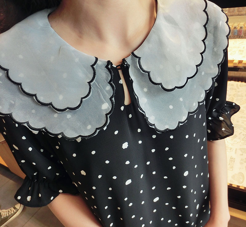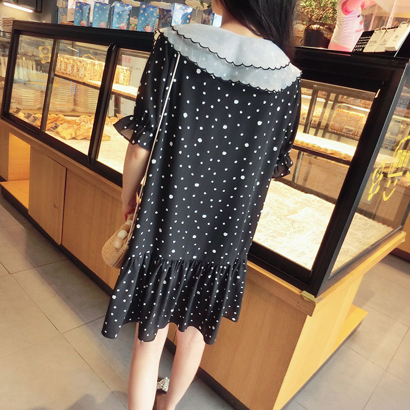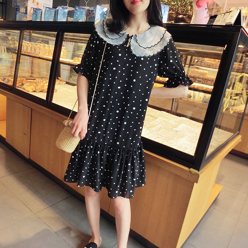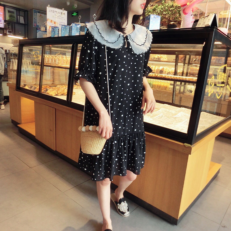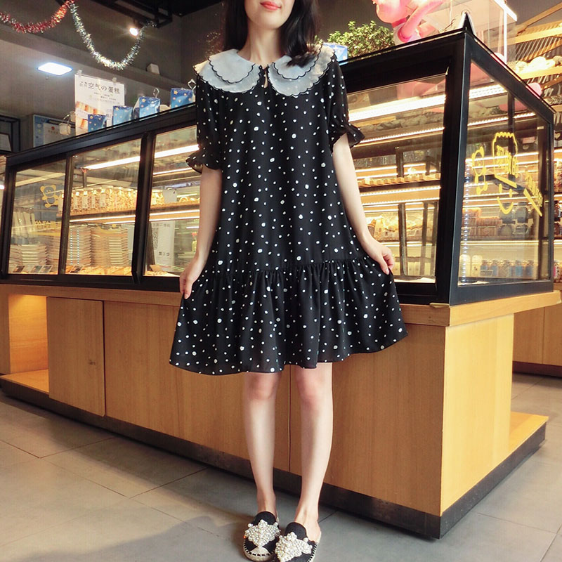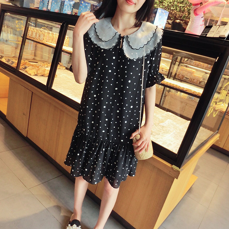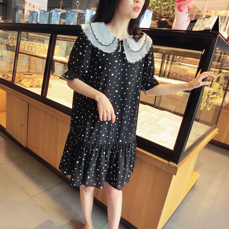 韓版2019夏季新款學院風女氣質波點裙子寬松顯瘦雪紡娃娃領連衣裙1入