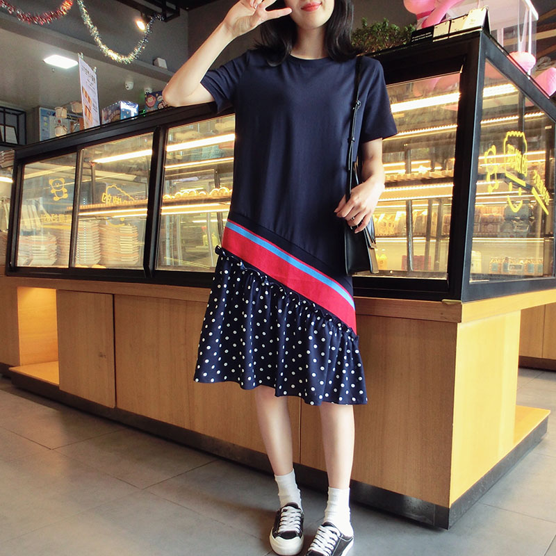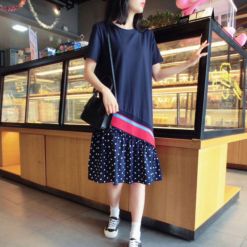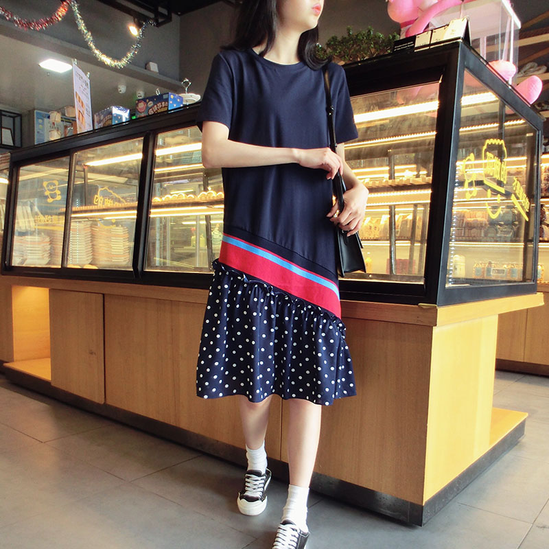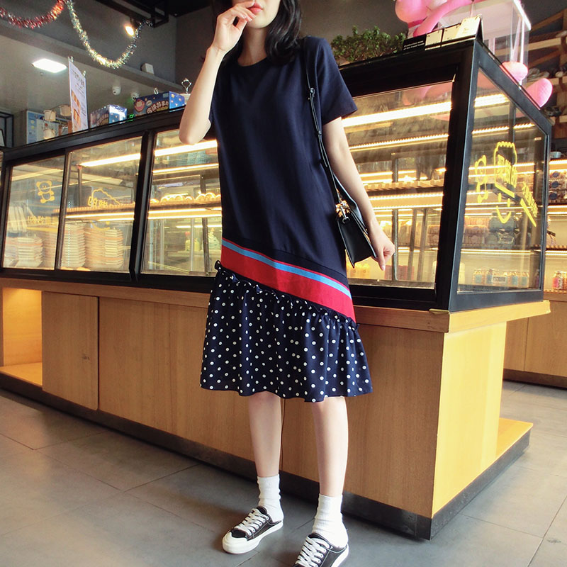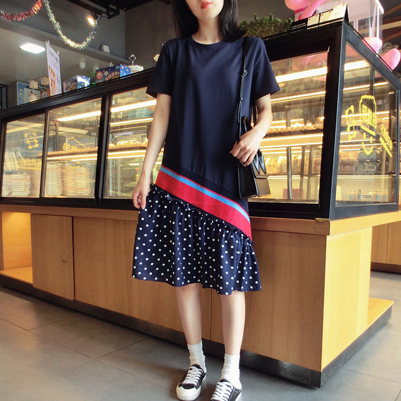 韓版2019夏季新款智熏桔梗法式彩條拼接波點中長款寬松連衣裙女1入