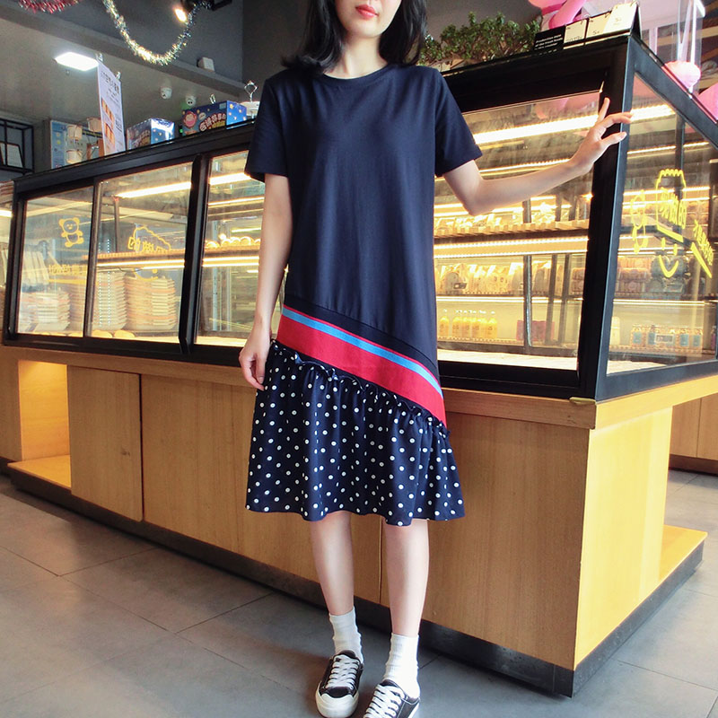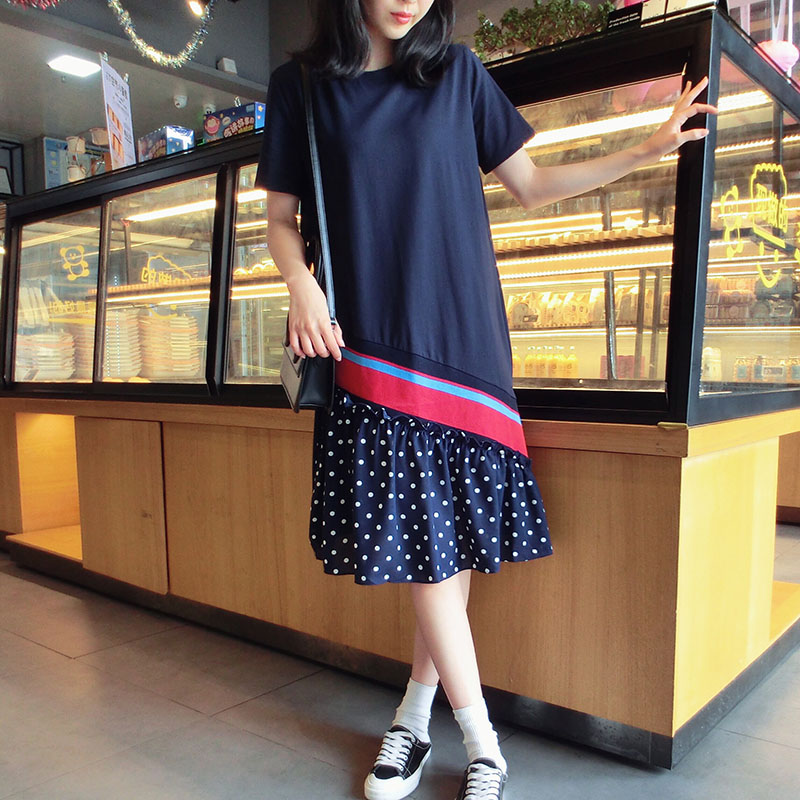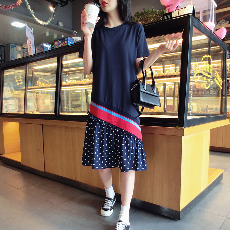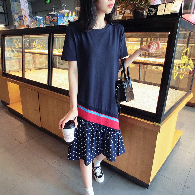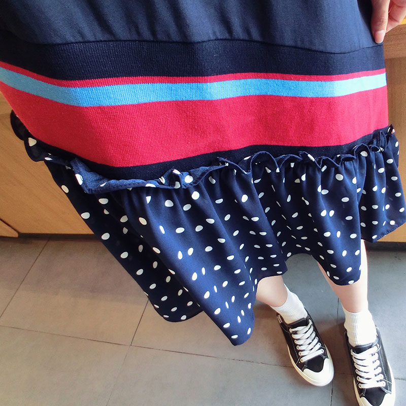韓版2019夏季新款智熏桔梗法式彩條拼接波點中長款寬松連衣裙女1入