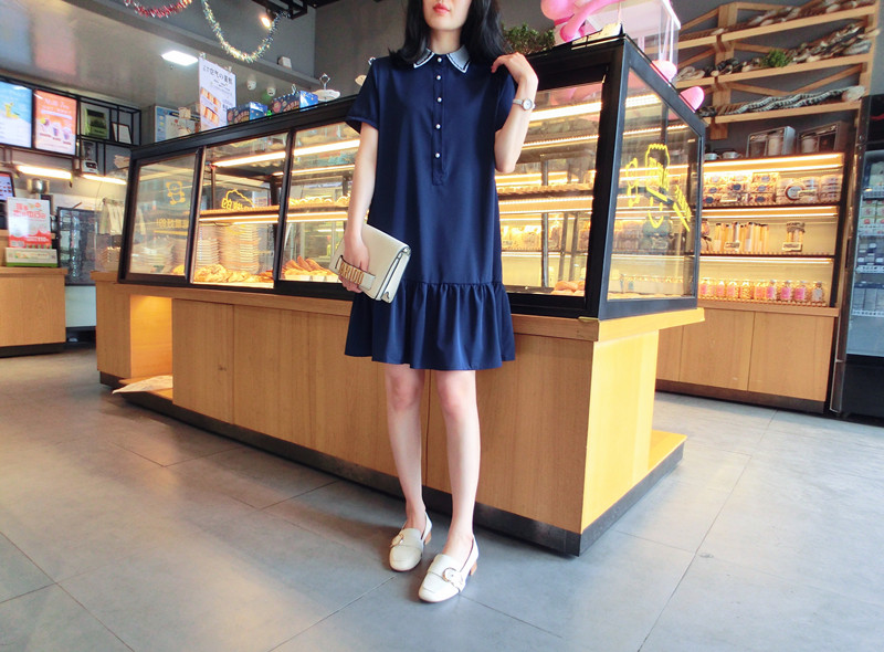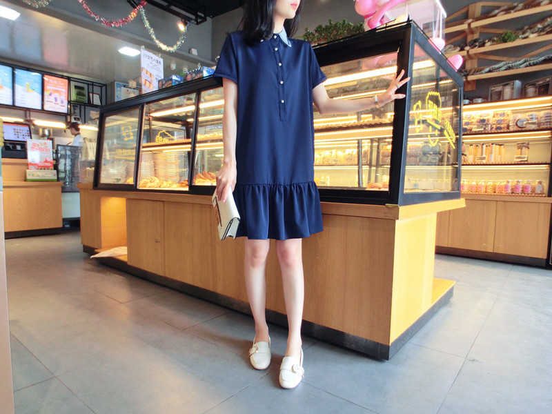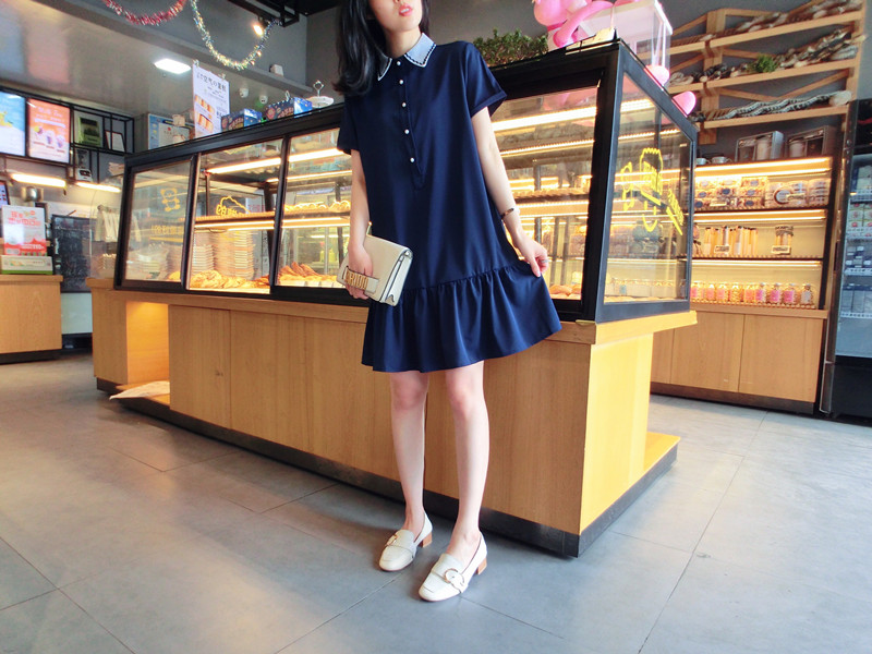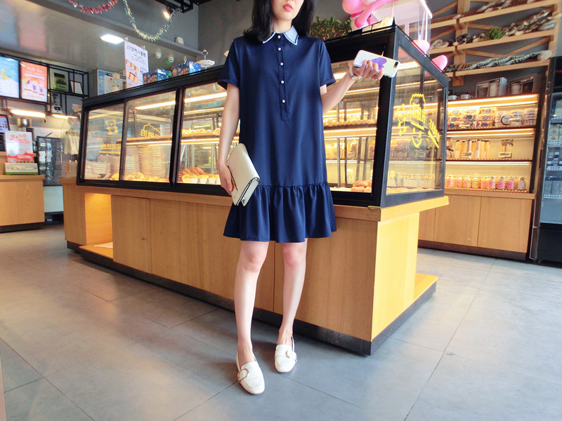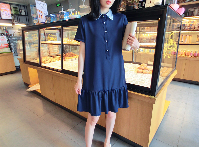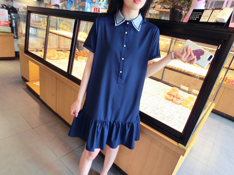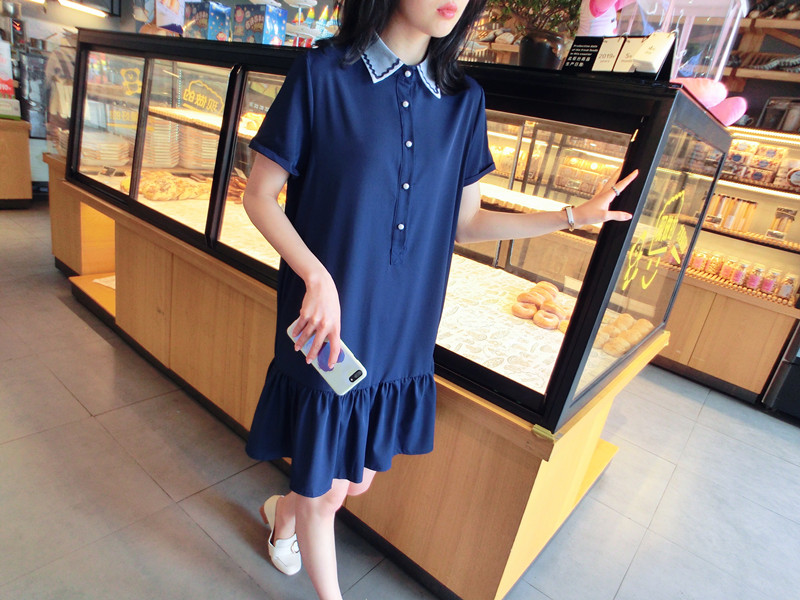 2019夏季新款魚尾裙蕾絲歐根紗翻領中長款垂感寬松顯瘦短袖連衣裙1入