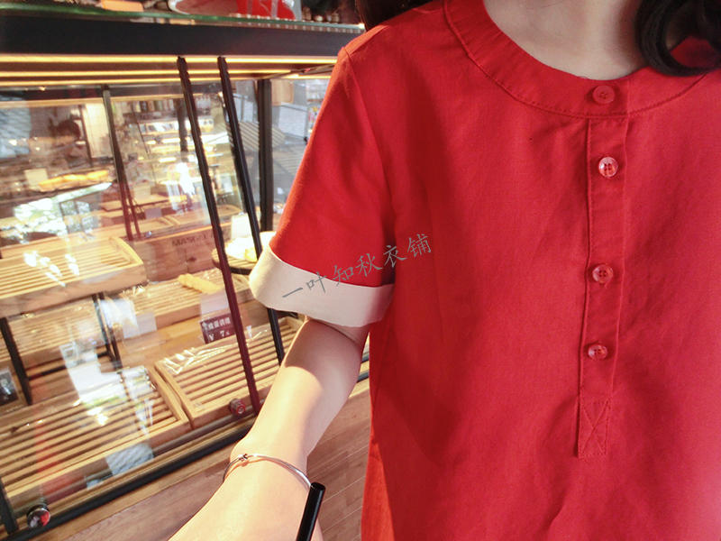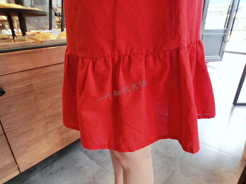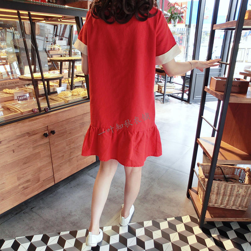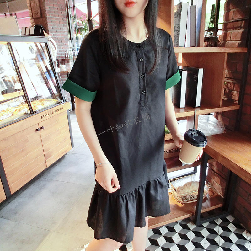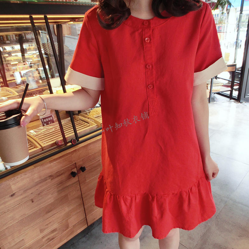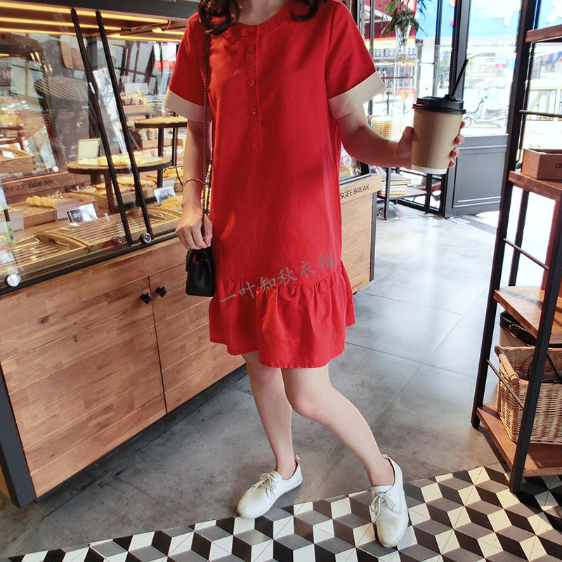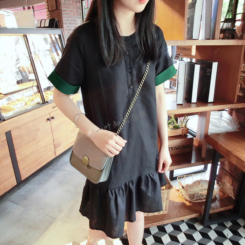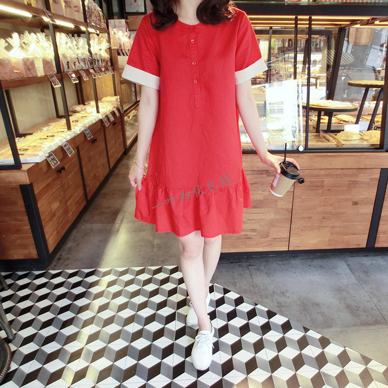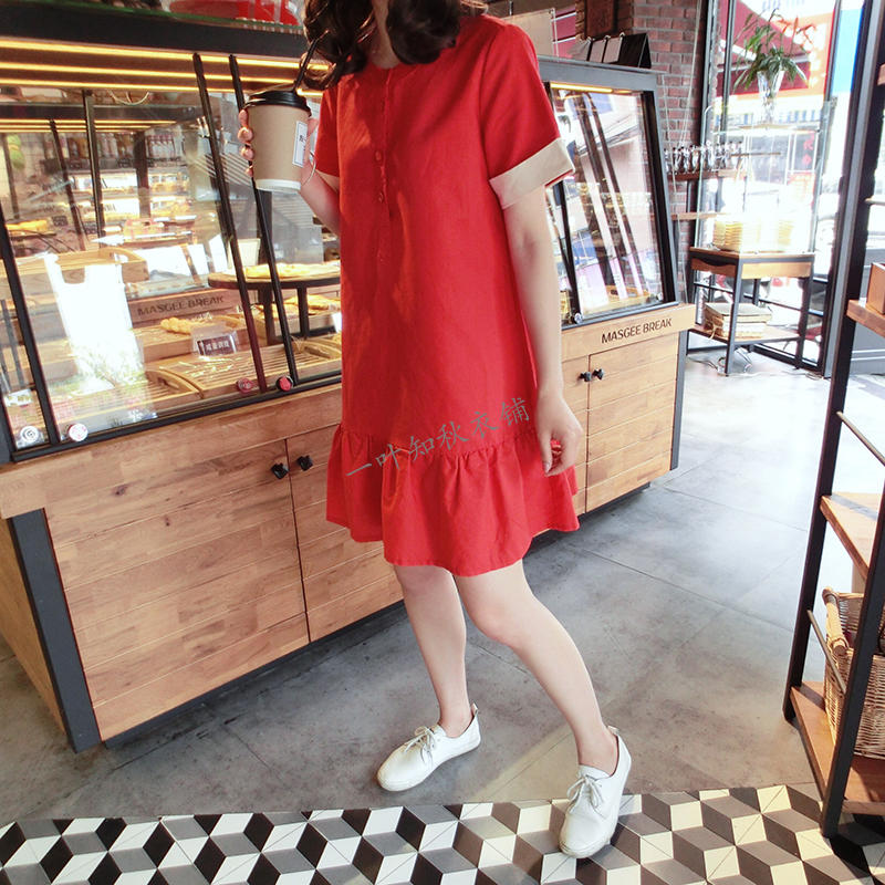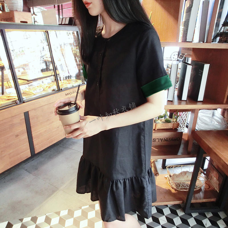 韓版2019春夏新款襯衫短袖寬松顯瘦荷葉邊棉麻連衣裙女圓領中長款1入