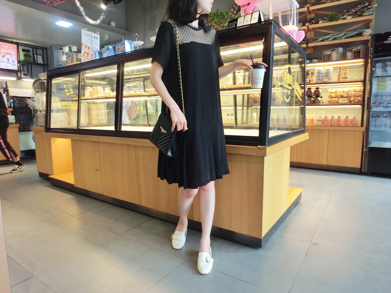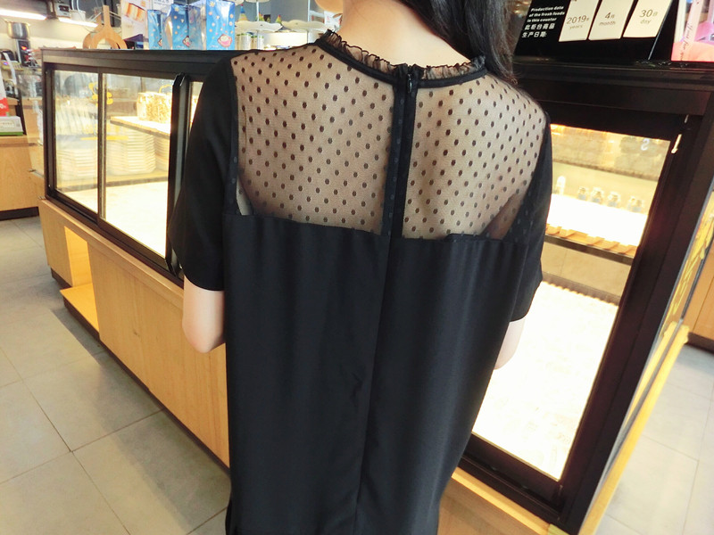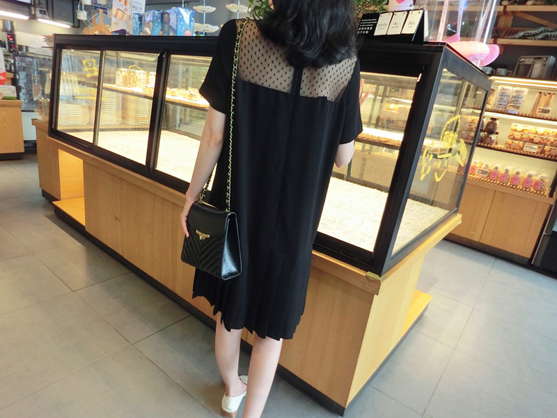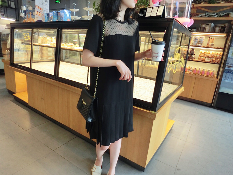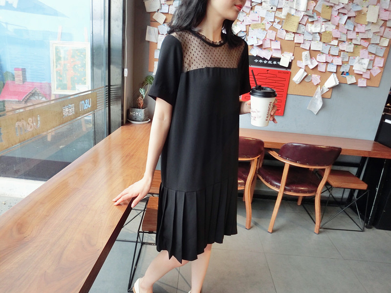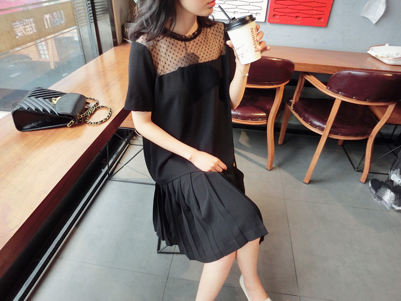 2019夏季新款拼接蕾絲網紗黑色性感雪紡連衣裙女寬松版下擺百褶裙1入
