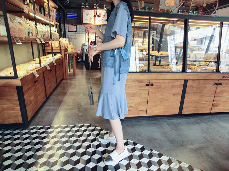 2019 夏季新款短袖魚尾邊寬松百搭蕾絲ins超火的冷淡風兩件套裙1入