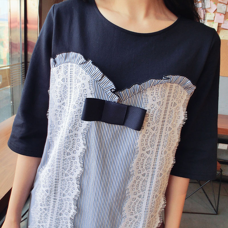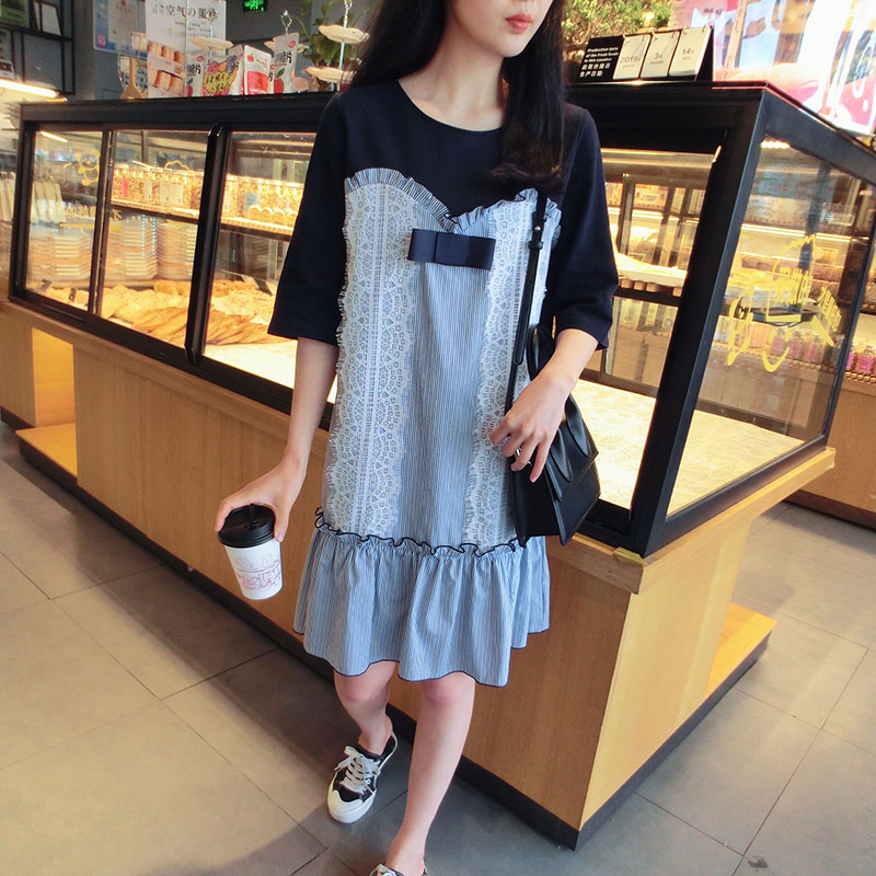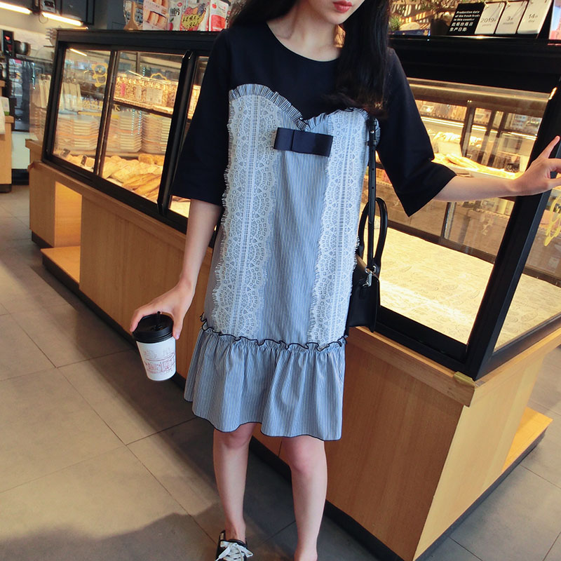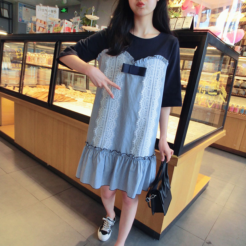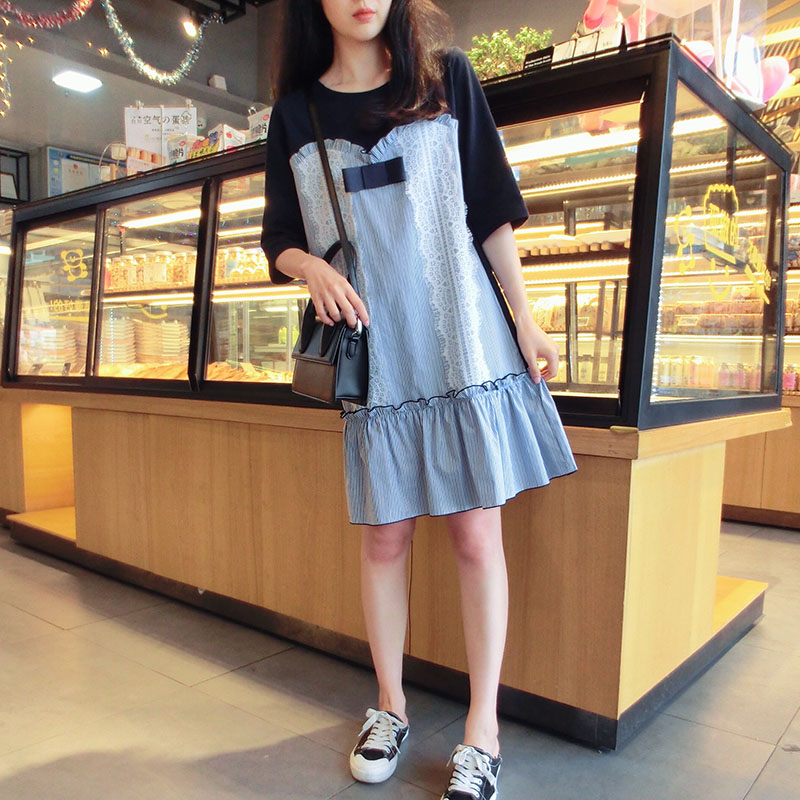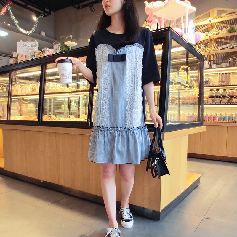 2019韓版春夏新品學院風圓領蕾絲拼接荷葉擺顯瘦中長款連衣裙女1入