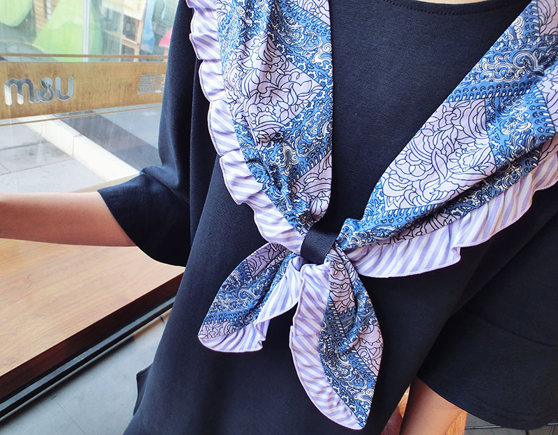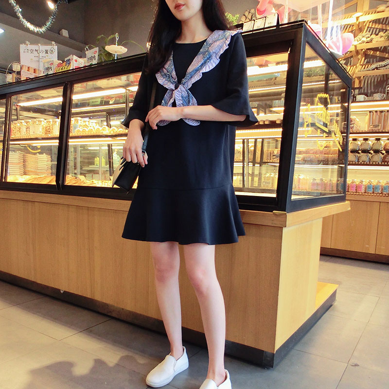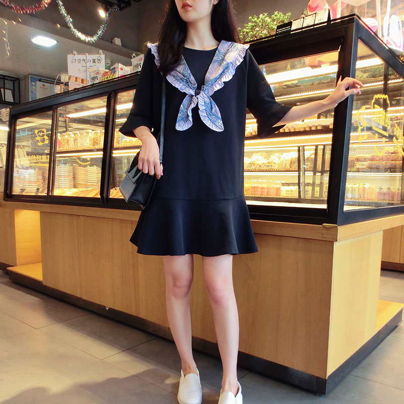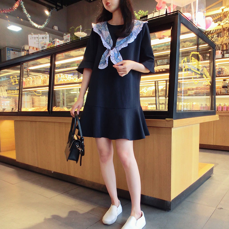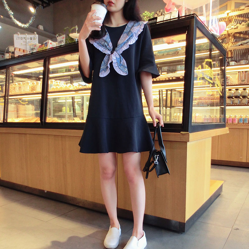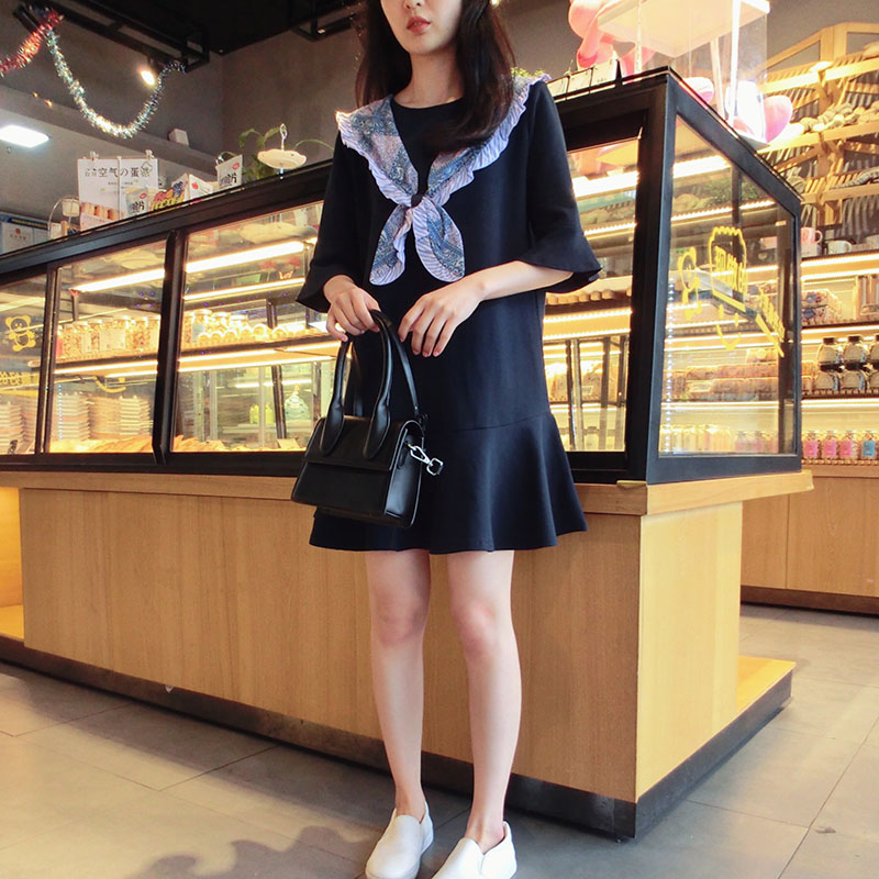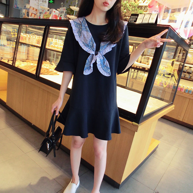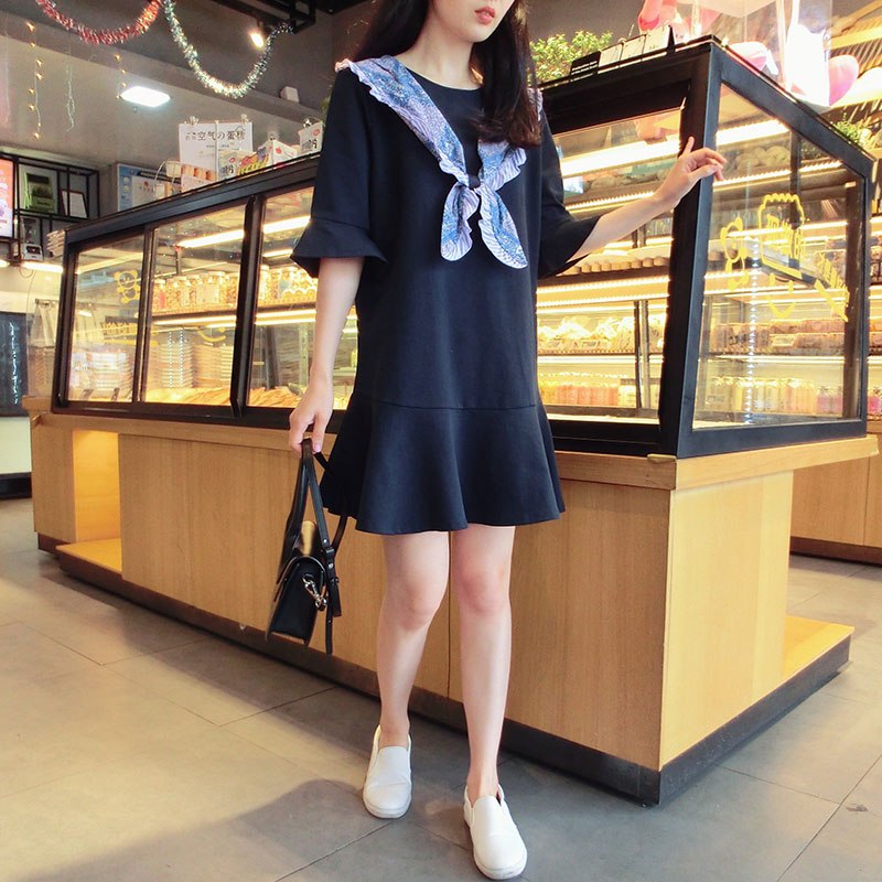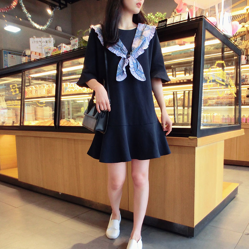 韓版春夏新款學院風碎花系帶領寬松荷葉擺顯瘦中長款大碼連衣裙女1入