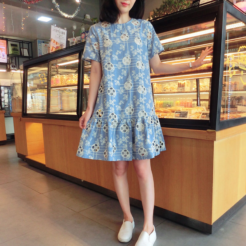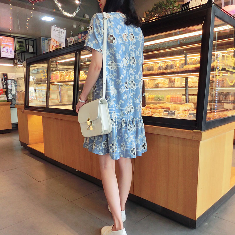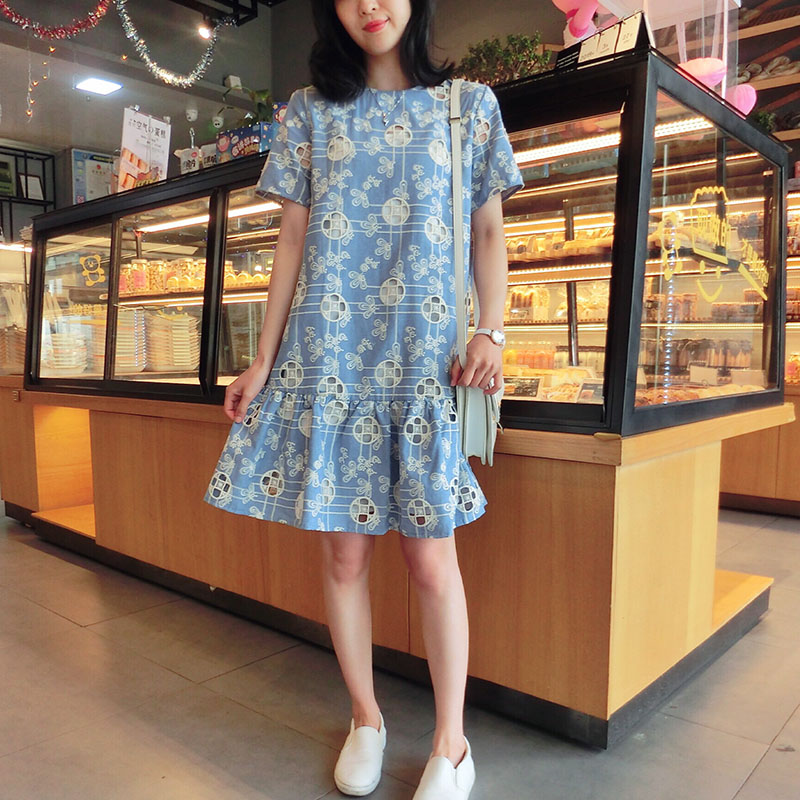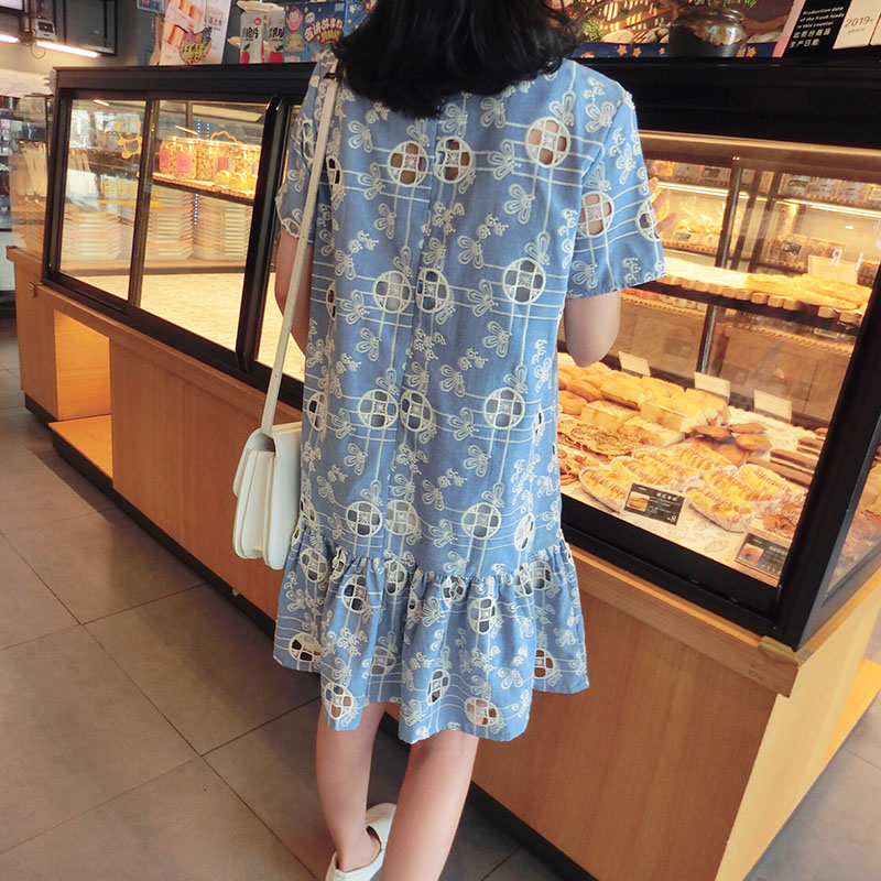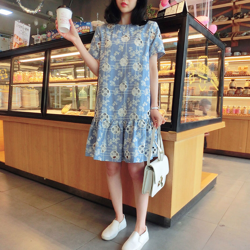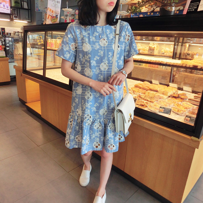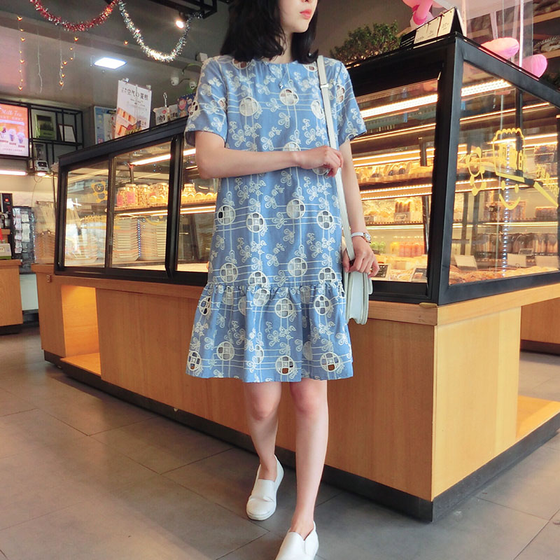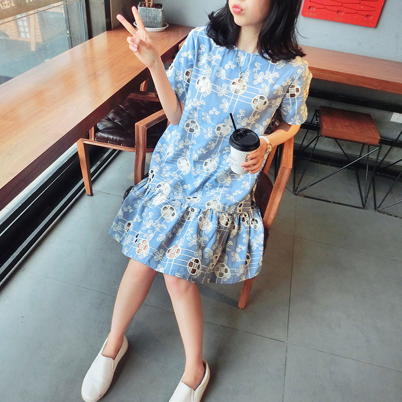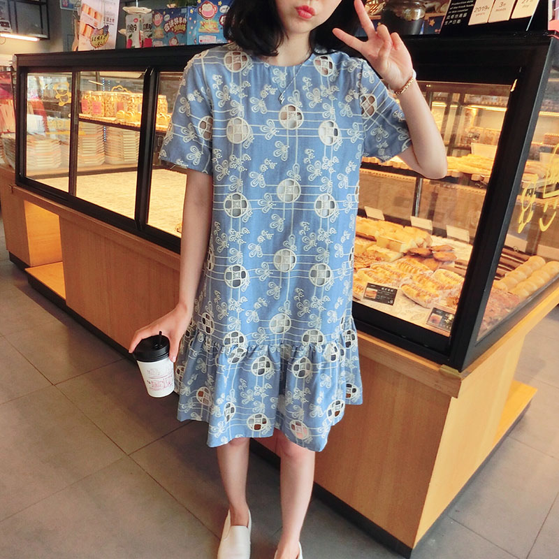 2019韓版學院風夏季新款圓領寬松繡花鏤空顯瘦短袖連衣裙女中長款1入