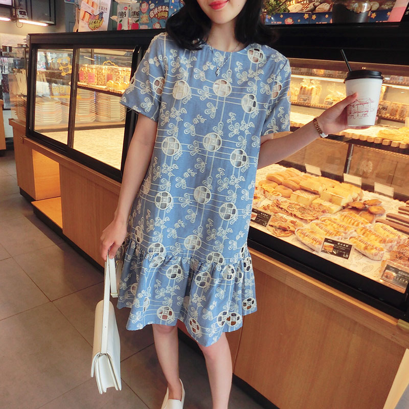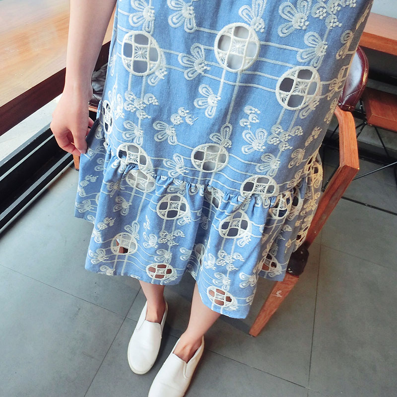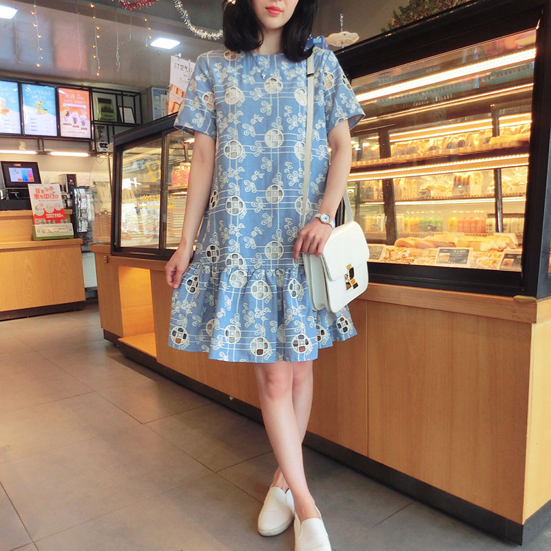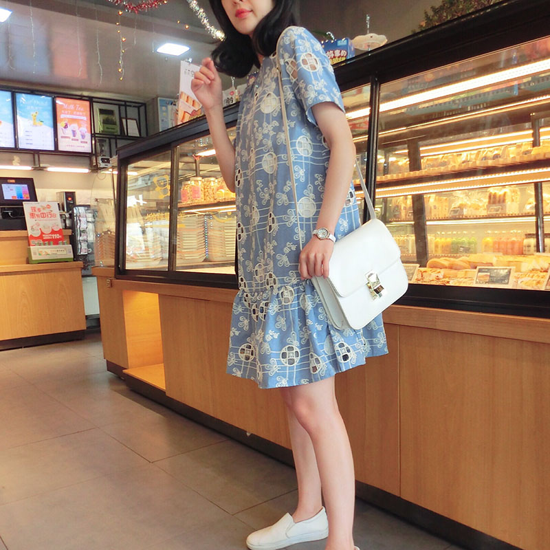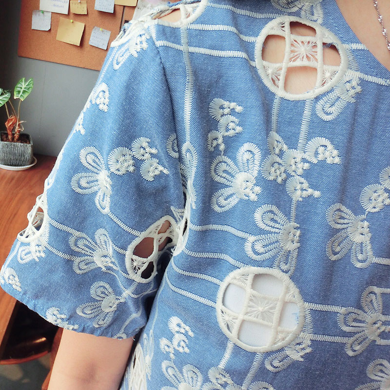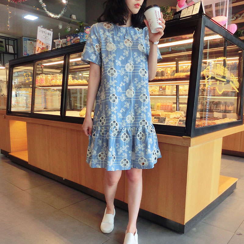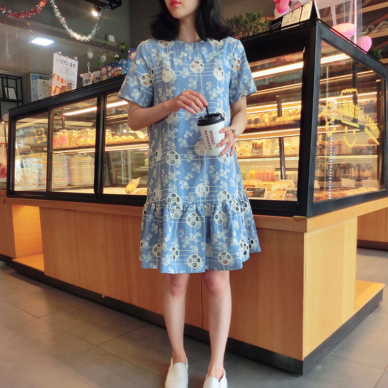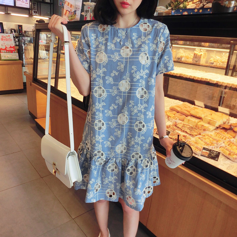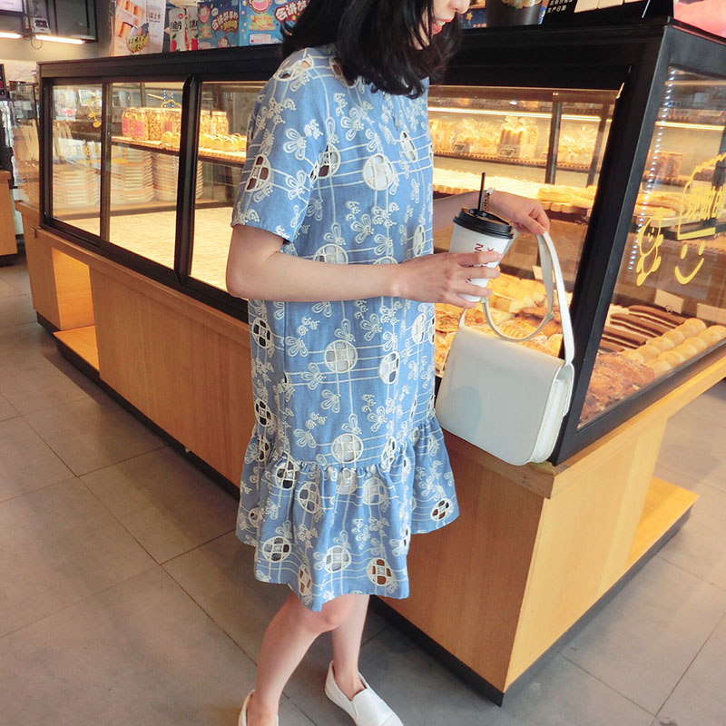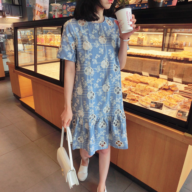 2019韓版學院風夏季新款圓領寬松繡花鏤空顯瘦短袖連衣裙女中長款1入