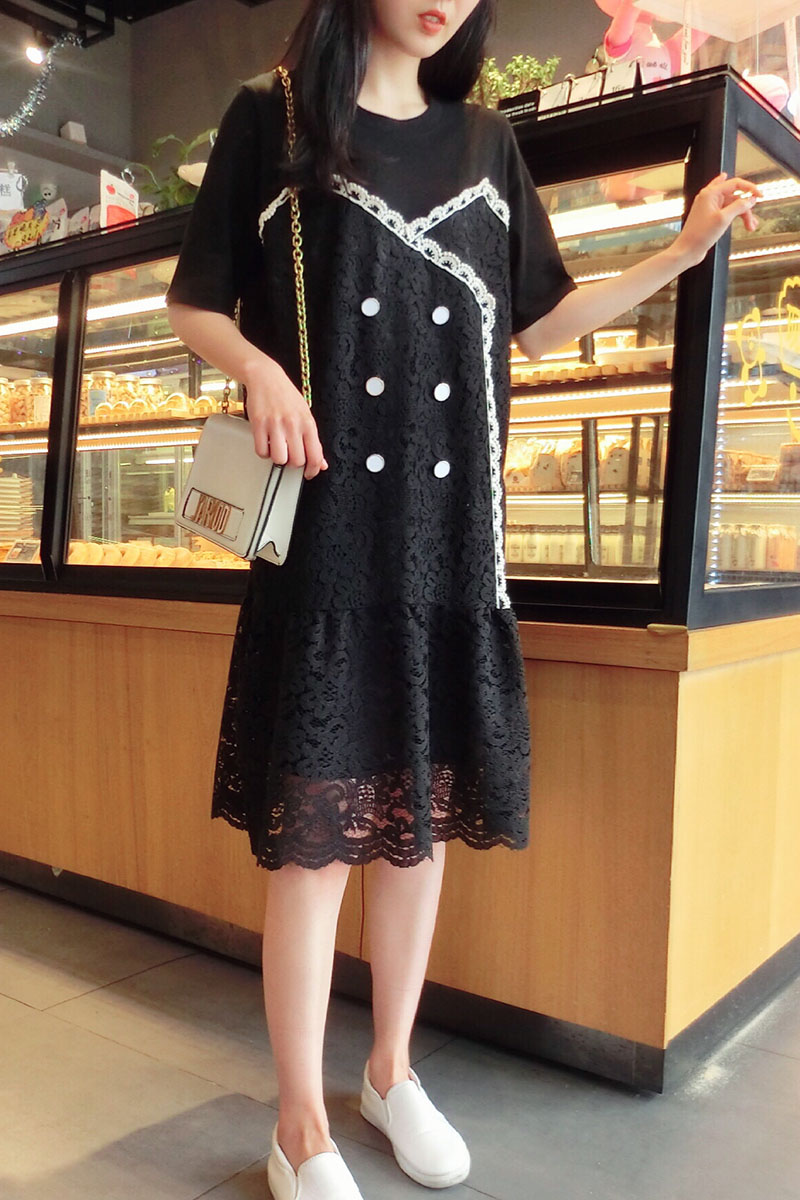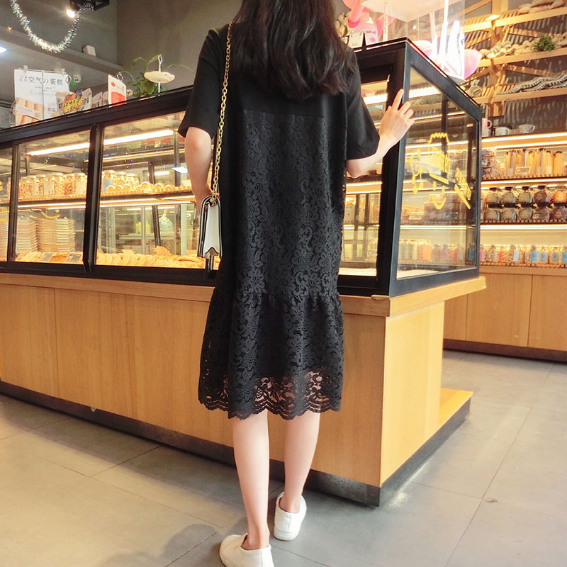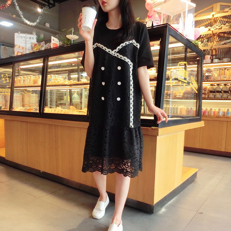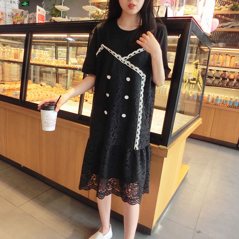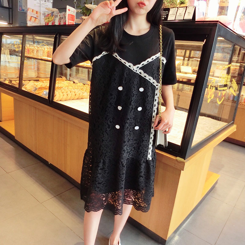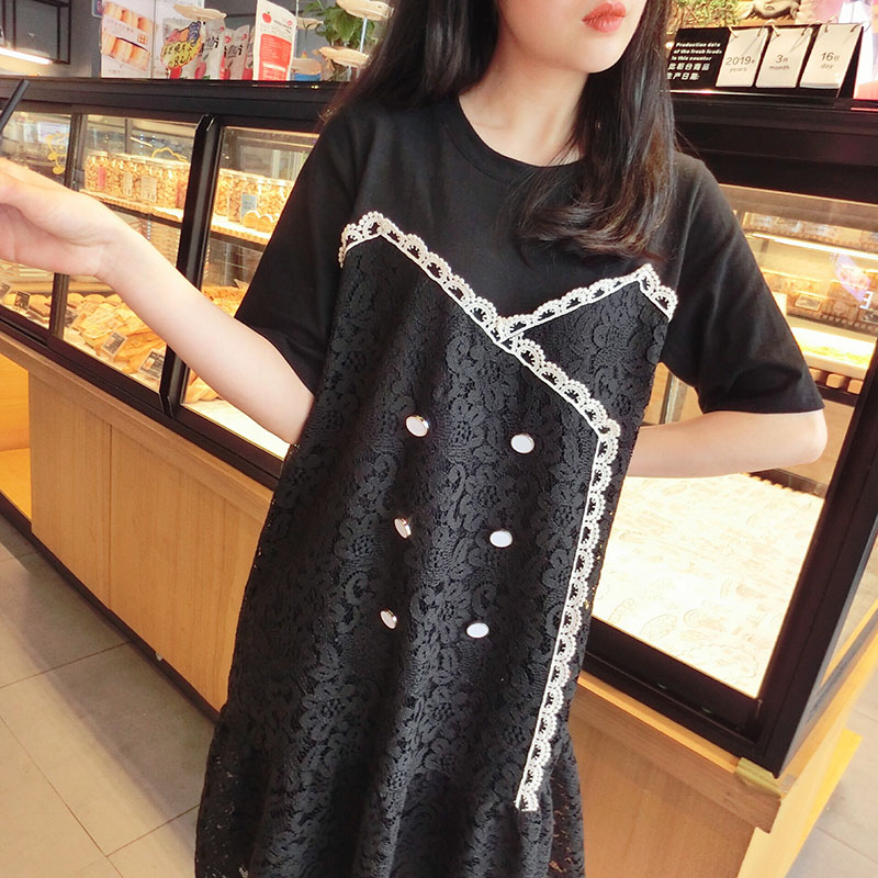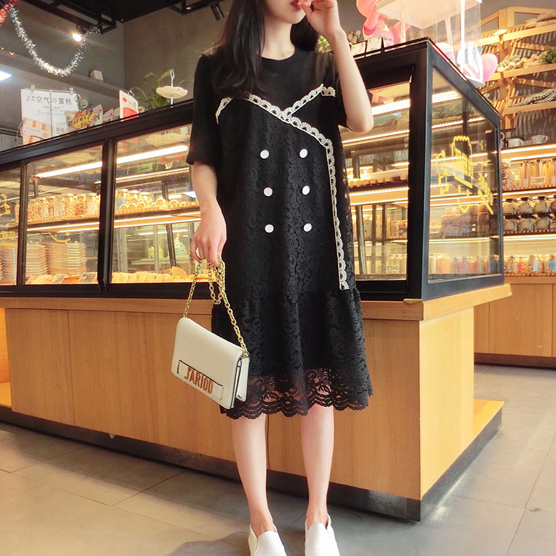 2019韓版春夏新款氣質短袖蕾絲拼接連衣裙女中長款寬松顯瘦學院風1入