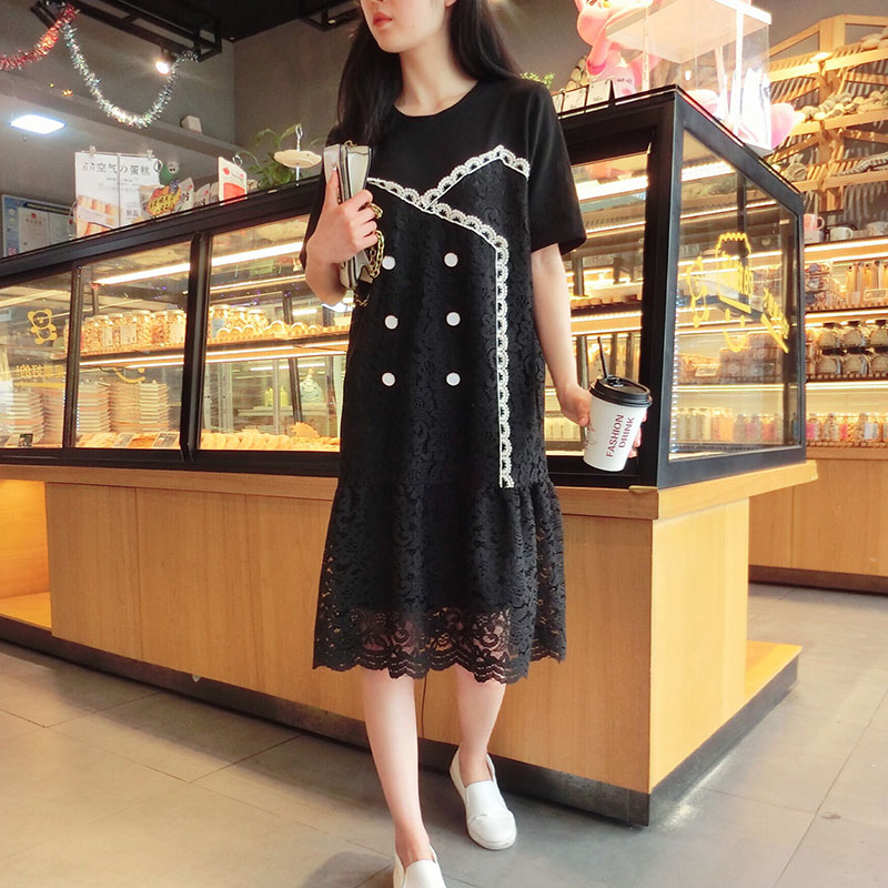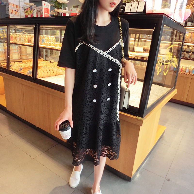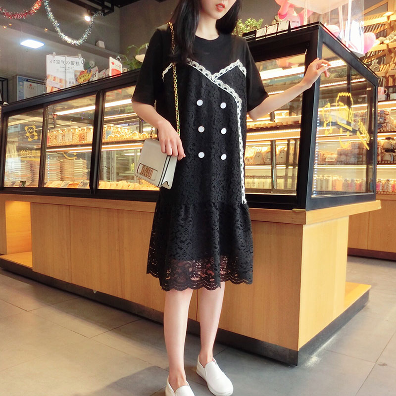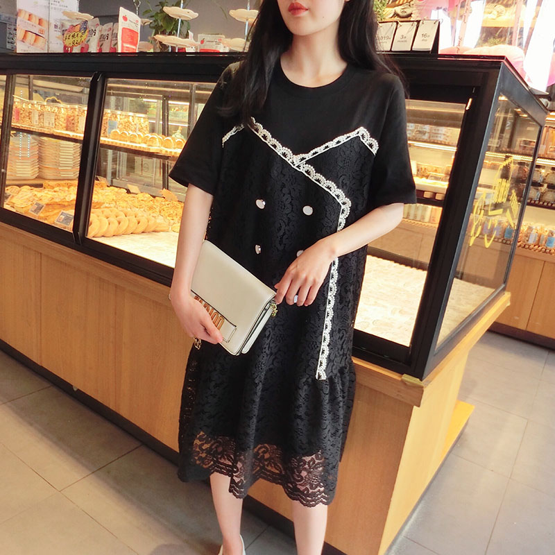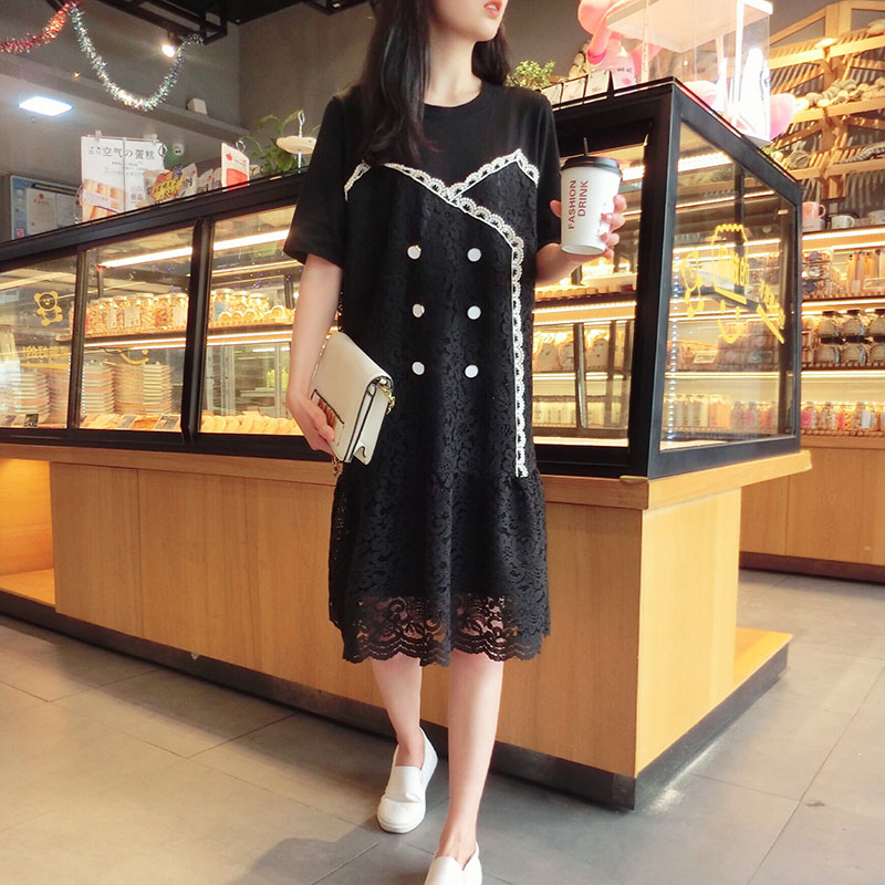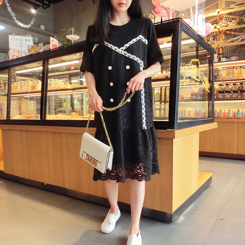 2019韓版春夏新款氣質短袖蕾絲拼接連衣裙女中長款寬松顯瘦學院風1入