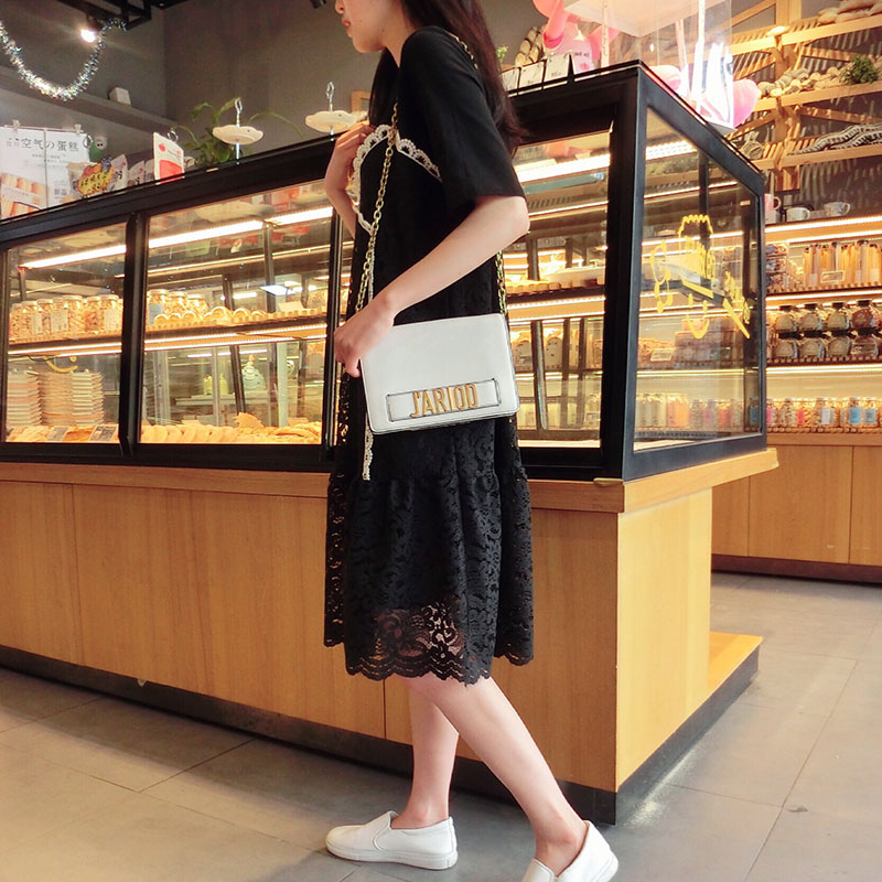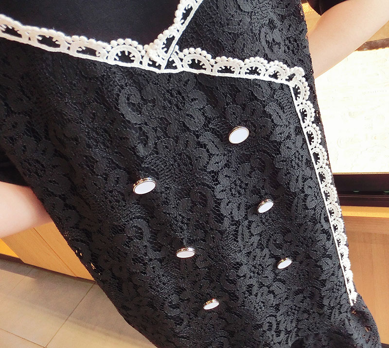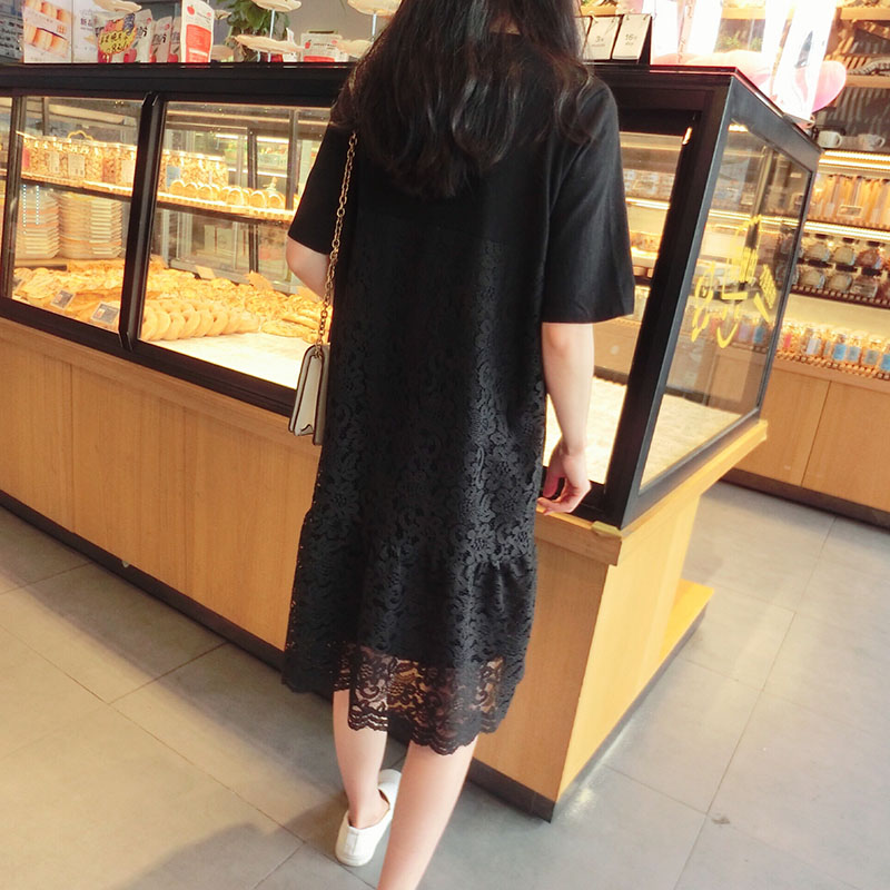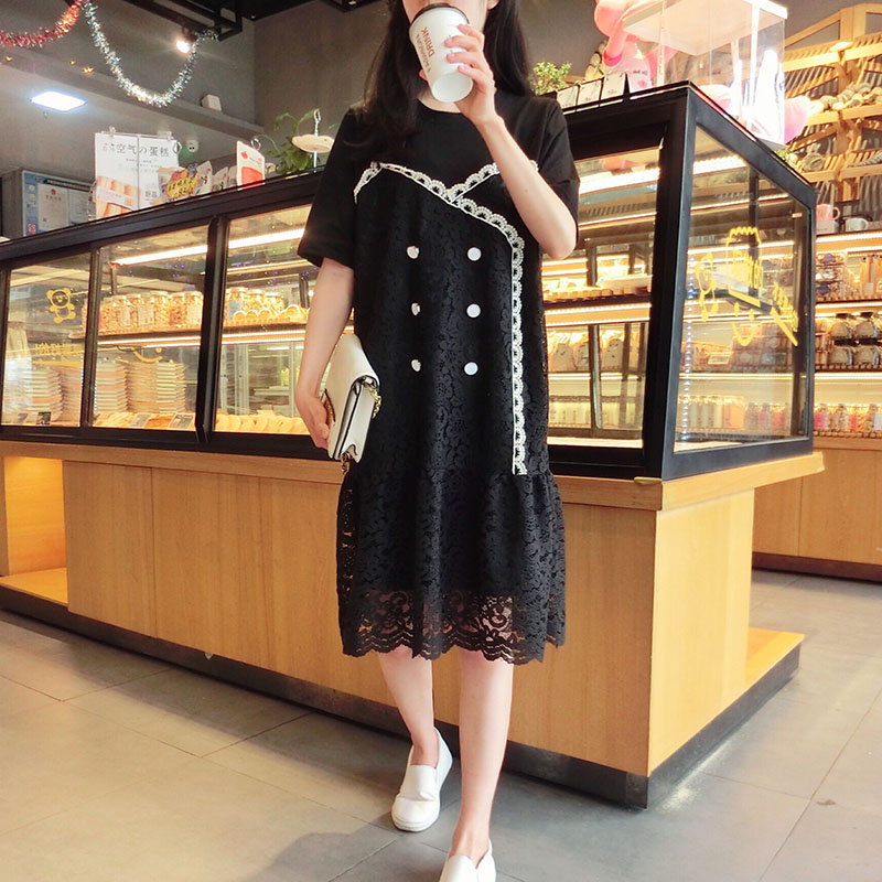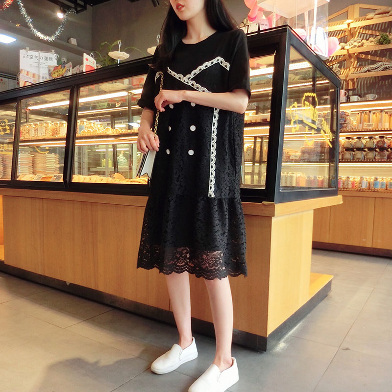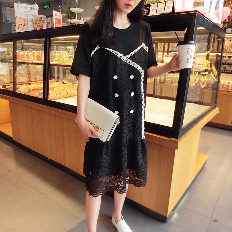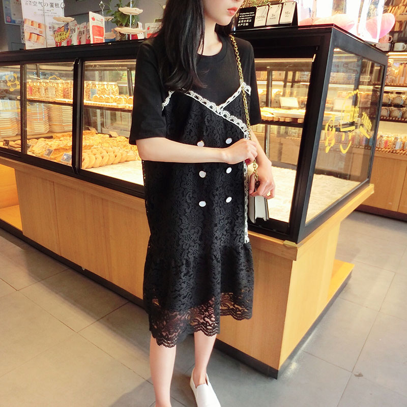 2019韓版春夏新款氣質短袖蕾絲拼接連衣裙女中長款寬松顯瘦學院風1入